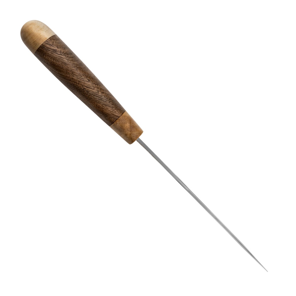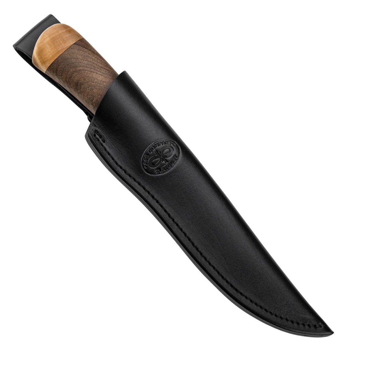 Сравнительно небольшой, универсальный, легкий и прочный нож с клинком, имеющим чуть приспущенный к острию обушок. Спуски в виде линзы на большую часть ширины клинка образуют тонкое, изумительно режущее лезвие. Толщина обуха в 2,4 мм позволяет оставить приличную голомень, что придает ему дополнительную прочность. Рукоятка имеет эргономичную форму, что позволяет пользоваться ножом человеку с любым размером ладони. Гарда умеренной величины защищает пальцы при резе. Монтаж клинка сквозной, неразборный. На навершии рукояти имеется отверстие под темляк. Великолепное решение для тех, кто любит проводить время на природе и вдали от городской суеты. Пользуется неизменной популярностью у покупателей.