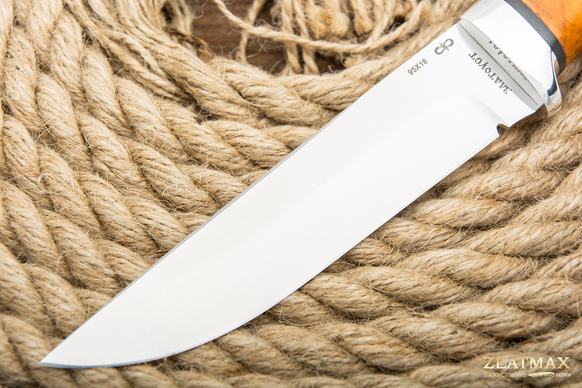 95Х18 - это без преувеличения лучшая сталь российского производства, а потому она пользуется огромной популярностью у отечественных и зарубежных компаний. При правильном изготовлении металл получает отличную твердость, гибкость и прочность. Ножи из этого материала служат, как правило, не один год. И при этом могут выглядеть так, как будто были сделаны только вчера. Но надо только стараться избегать попадания на лезвие соли и долгое воздействие влаги. Единственный минус – клинок из такой стали очень сложно заточить. Придется потратить много сил или даже воспользоваться специальными устройствами. Но зато хорошую заточку ножи держат достаточно долго.