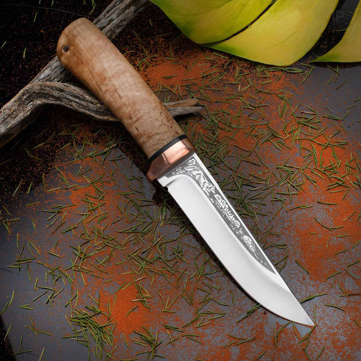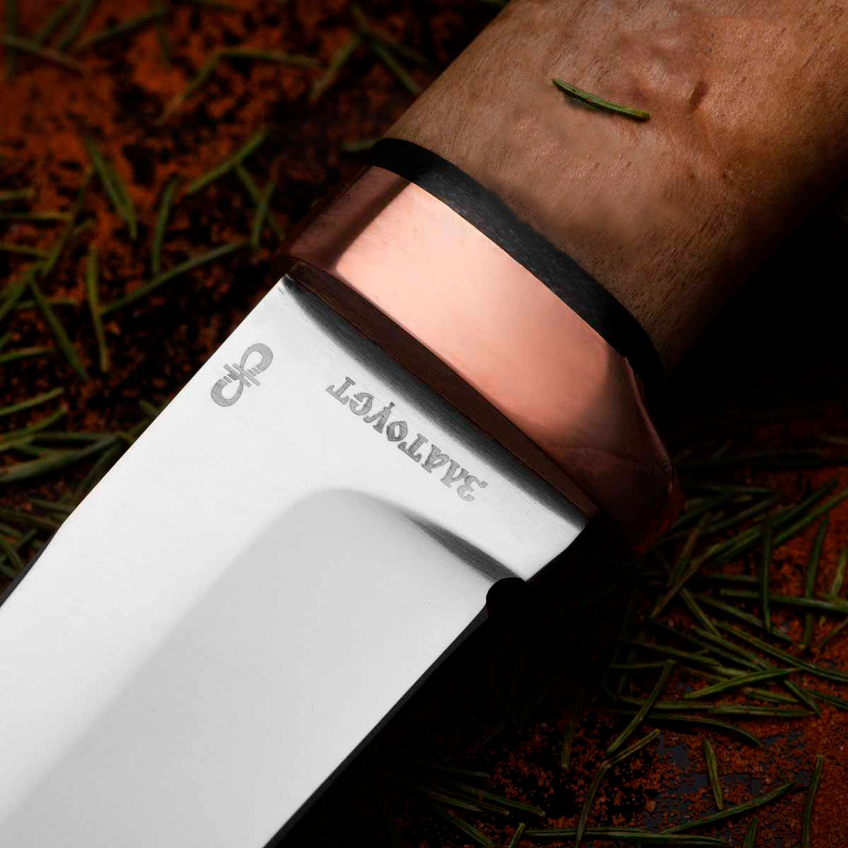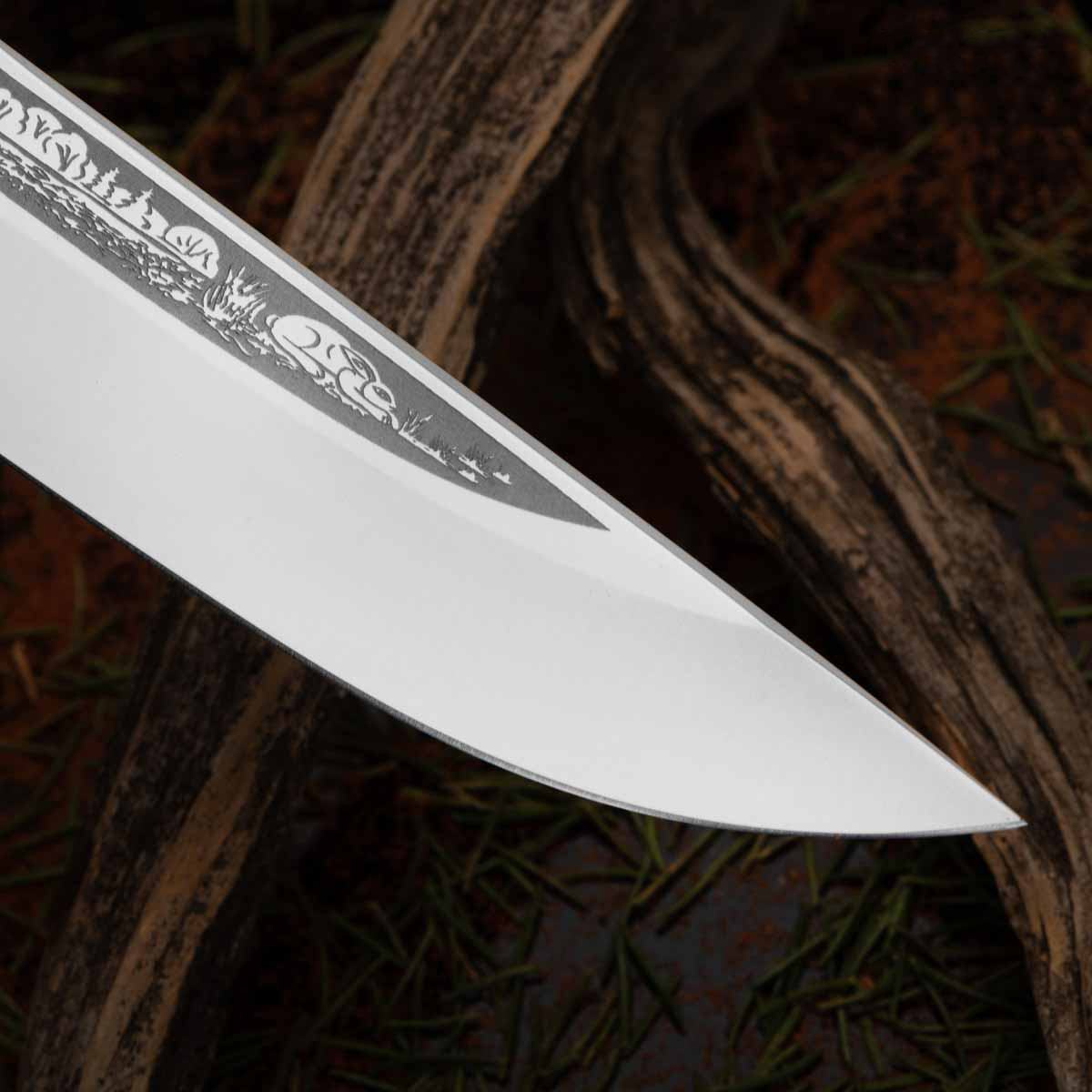 Сравнительно небольшой, универсальный, легкий и прочный нож с клинком, имеющим чуть приспущенный к острию обушок. Спуски в виде линзы на большую часть ширины клинка образуют тонкое, изумительно режущее лезвие. Толщина обуха в 2,6 мм позволяет оставить приличную голомень, что придает ему дополнительную прочность. Рукоятка имеет эргономичную форму, что позволяет пользоваться ножом человеку с любым размером ладони. Гарда умеренной величины защищает пальцы при резе. Монтаж рукояти сквозной, неразборный. На навершии рукояти имеется отверстие под темляк. Великолепное решение для тех, кто любит проводить время на природе и вдали от городской суеты. Пользуется неизменной популярностью у покупателей.