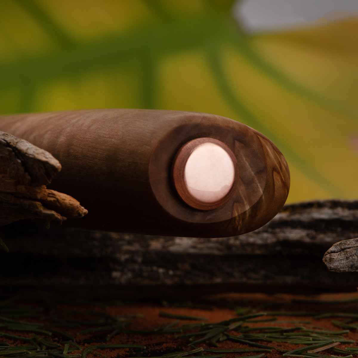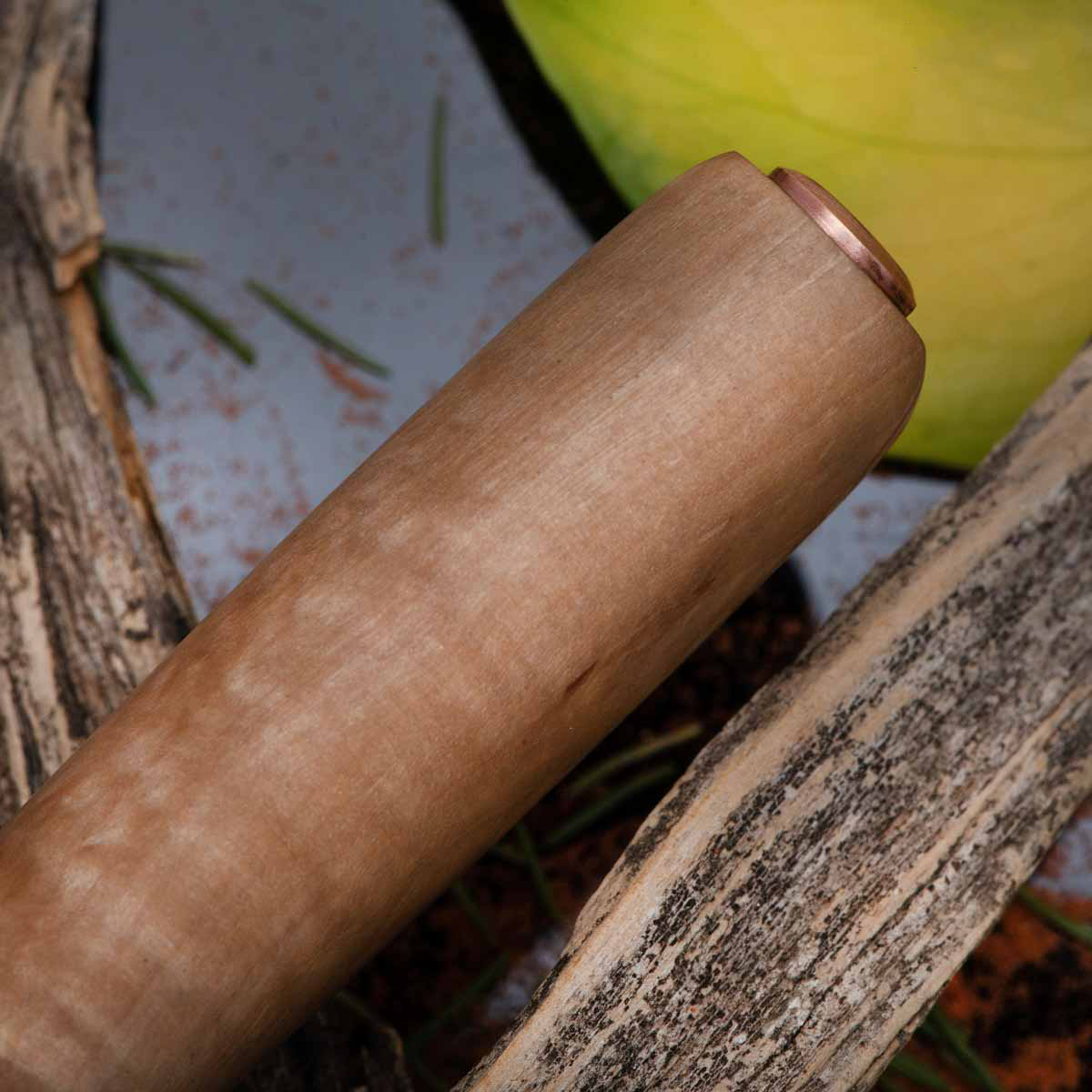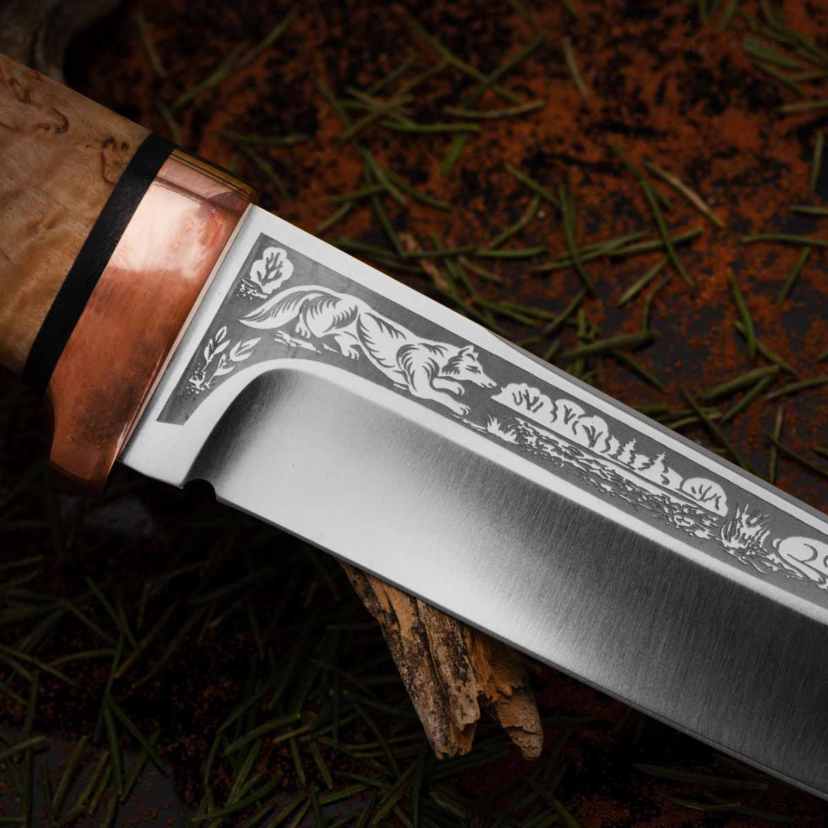Сравнительно небольшой, универсальный, легкий и прочный нож с клинком, имеющим чуть приспущенный к острию обушок. Спуски в виде линзы на большую часть ширины клинка образуют тонкое, изумительно режущее лезвие. Толщина обуха в 2,6 мм позволяет оставить приличную голомень, что придает ему дополнительную прочность. Рукоятка имеет эргономичную форму, что позволяет пользоваться ножом человеку с любым размером ладони. Гарда умеренной величины защищает пальцы при резе. Монтаж рукояти сквозной, неразборный. На навершии рукояти имеется отверстие под темляк. Великолепное решение для тех, кто любит проводить время на природе и вдали от городской суеты. Пользуется неизменной популярностью у покупателей.
