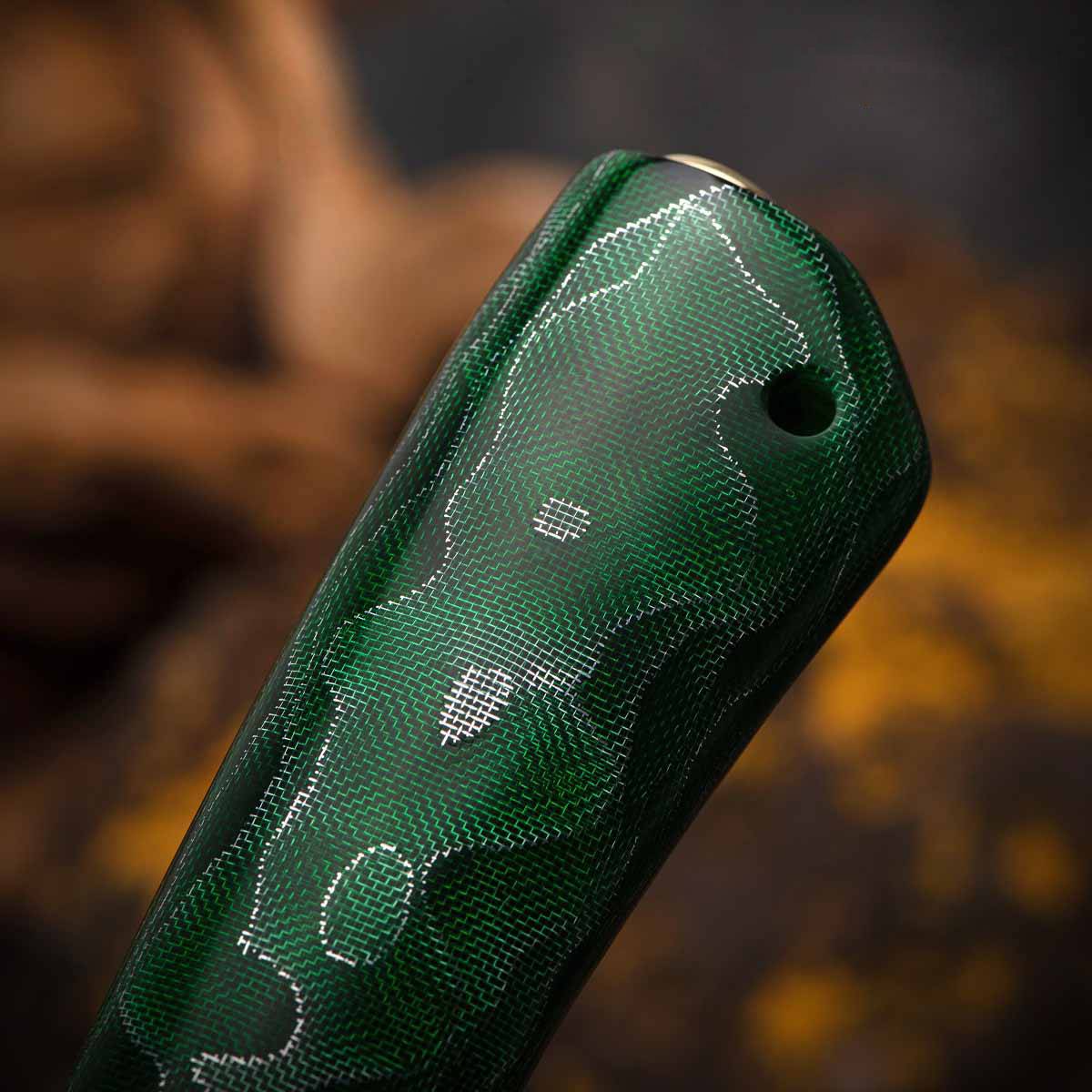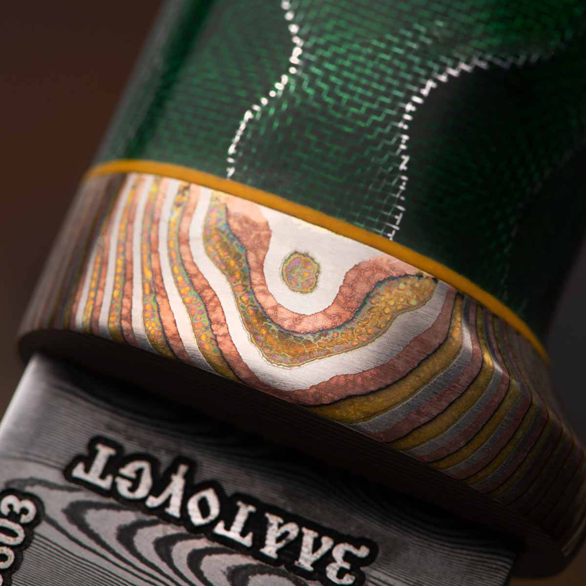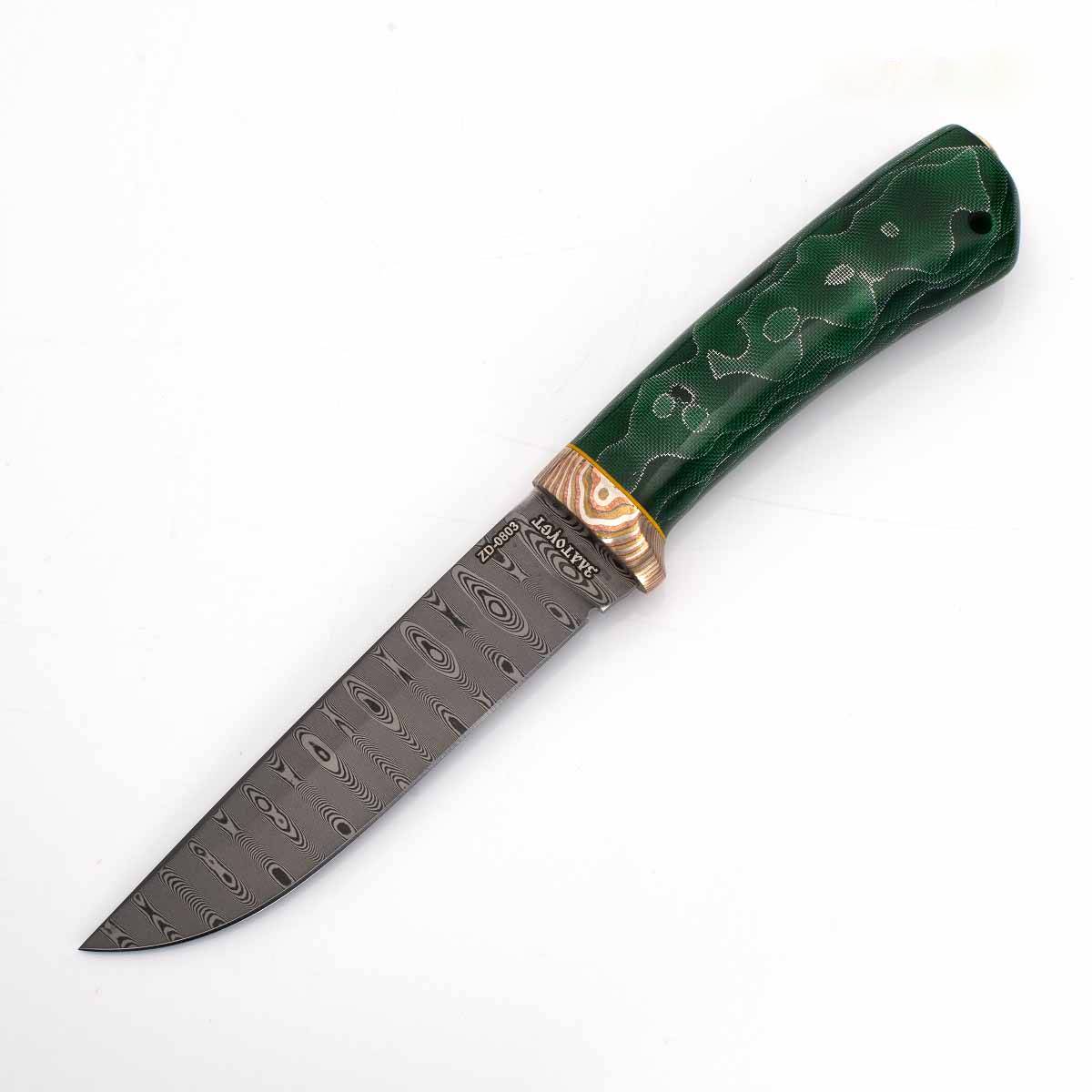 Клинок из композиционной (дамасской) стали производства Компании "АиР" ZD-0803 (ZLAtoust+Damast, 08 – среднее содержание углерода 0,8%, 03 – среднее содержание легирующих элементов (хром, никель, молибден, ванадий и т.д.). В состав композиции ZD-0803 входят высокоуглеродистые стали типа У8А, что обеспечивает клинку высокие эксплуатационные (режущие свойства, прочность и т.д.) и декоративные свойства. В то же время следует помнить, что композиции на основе стали У8А подвержены коррозии.