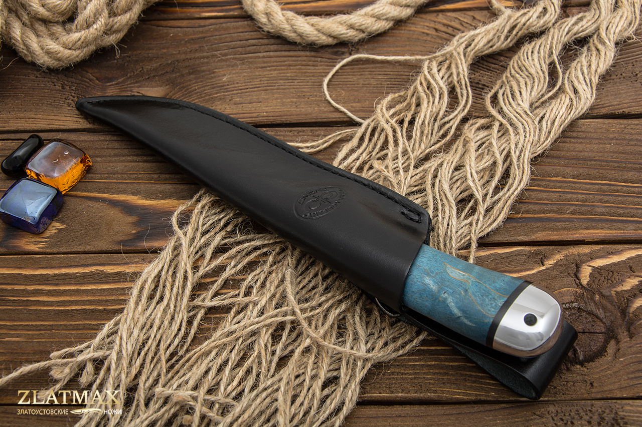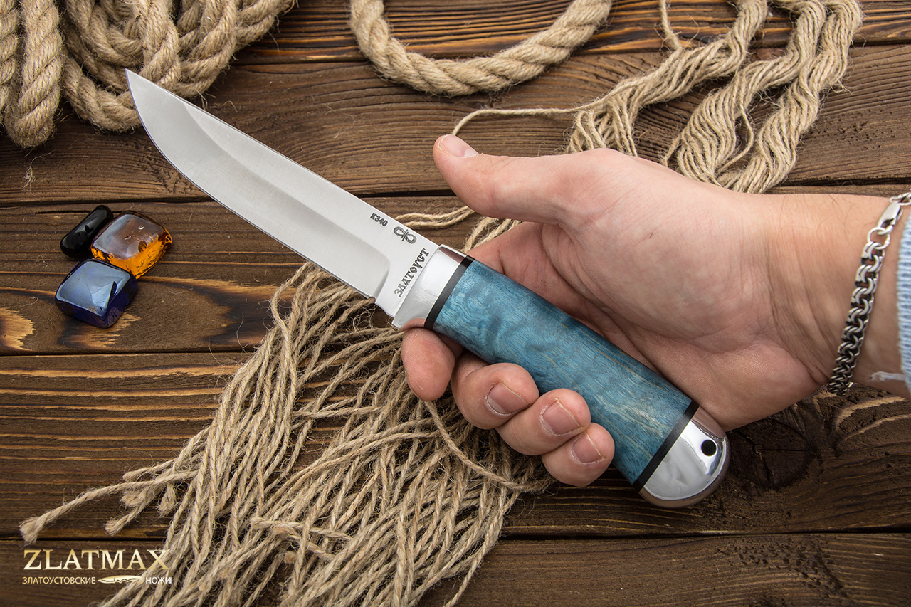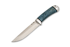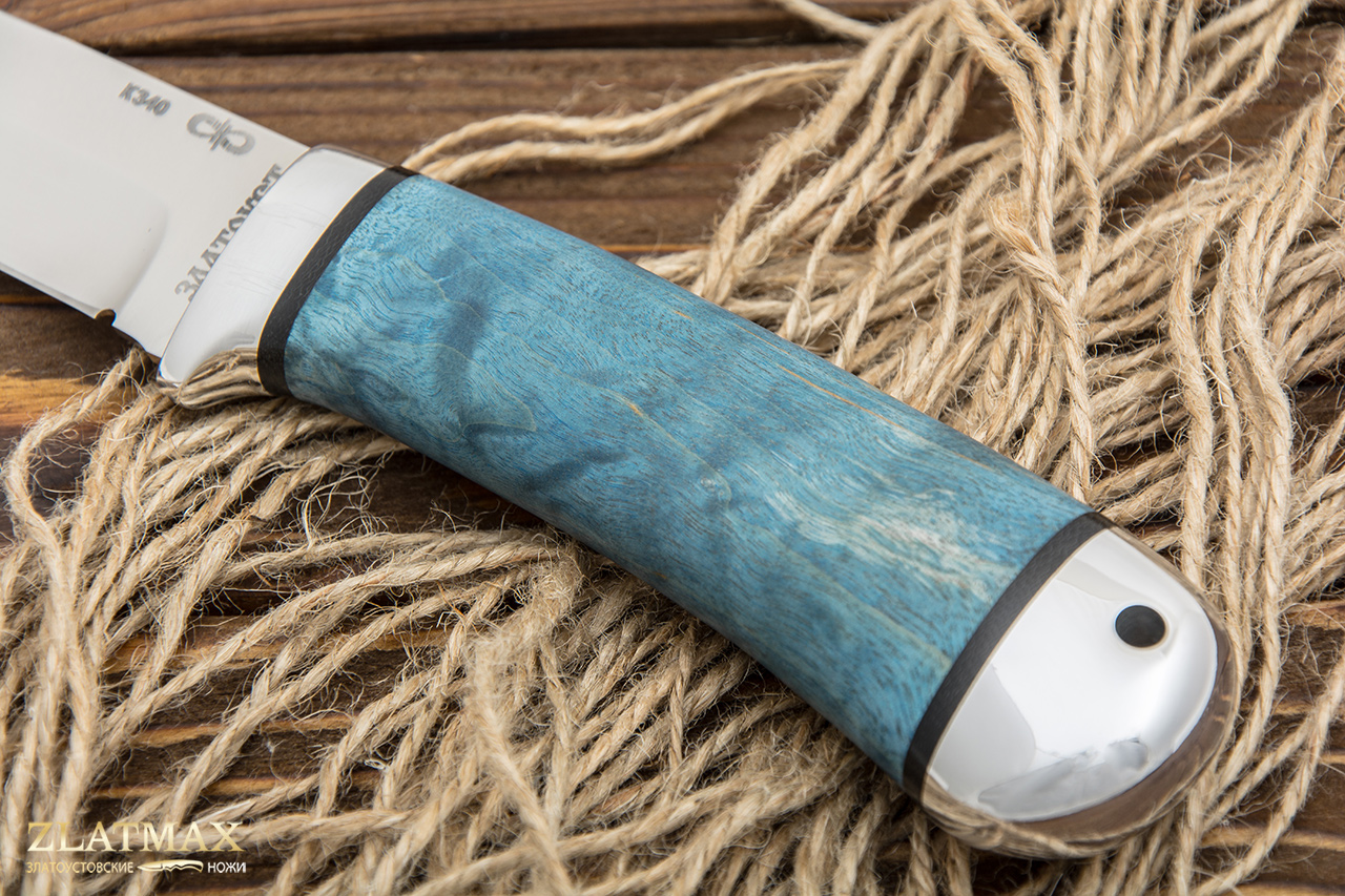 Древесина карельской березы смотрится очень эффектно на рукояти ножа. Необычная текстура материала и красивая палитра оттенков делают вид орудия очень презентабельным.