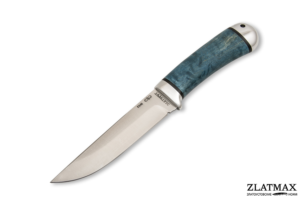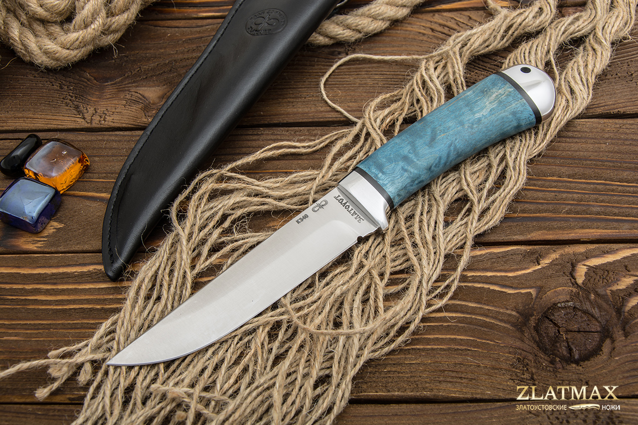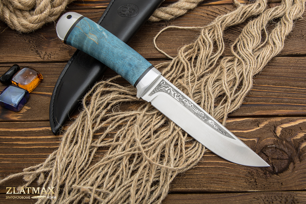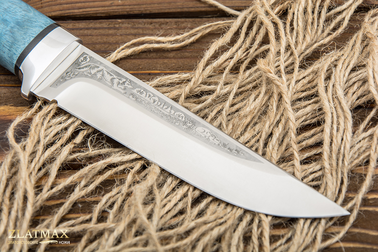 Древесина карельской березы смотрится очень эффектно на рукояти ножа. Необычная текстура материала и красивая палитра оттенков делают вид орудия очень презентабельным.