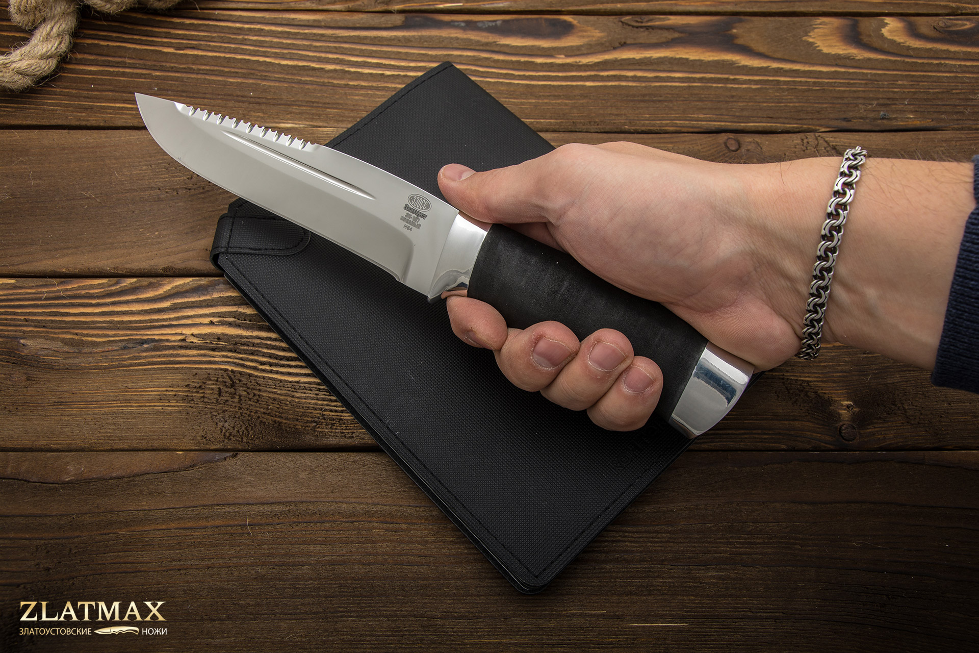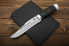 Нож от производителя – исключительно самостоятельная разработка и изготовление. Прошел испытания в экстремальных условиях. История появления была весьма своеобразна. В городе, а точнее в горах, снимали кино. Выполнялся трюк – подъем по скале с отрицательным углом. Вдруг один из крюков сломался. Каскадёр смог удержаться, воткнув в склон нож, который ему подарили по время визита съемочной группы на завод. Необычный по форме клинок и зубцы привлекли внимание опытного экстремала, который и получил его в подарок. Нож тогда считался экспериментальным, но на сложных киносъемках успешно прошел испытания. Эти убедительные доводы стали веским поводом для широкого производства этого варианта.