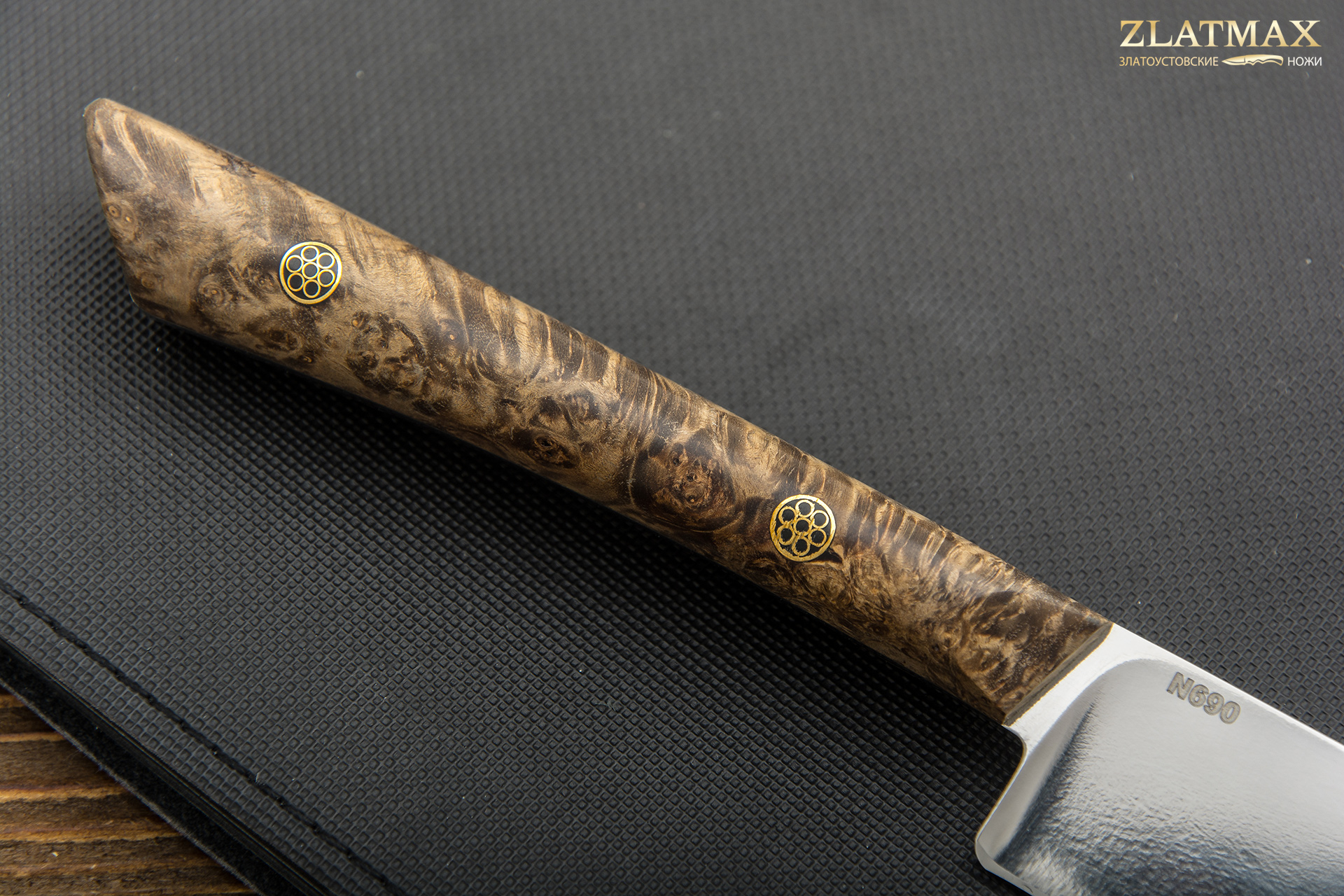 Древесина карельской березы смотрится очень эффектно на рукояти ножа. Необычная текстура материала и красивая палитра оттенков делают вид орудия очень презентабельным.