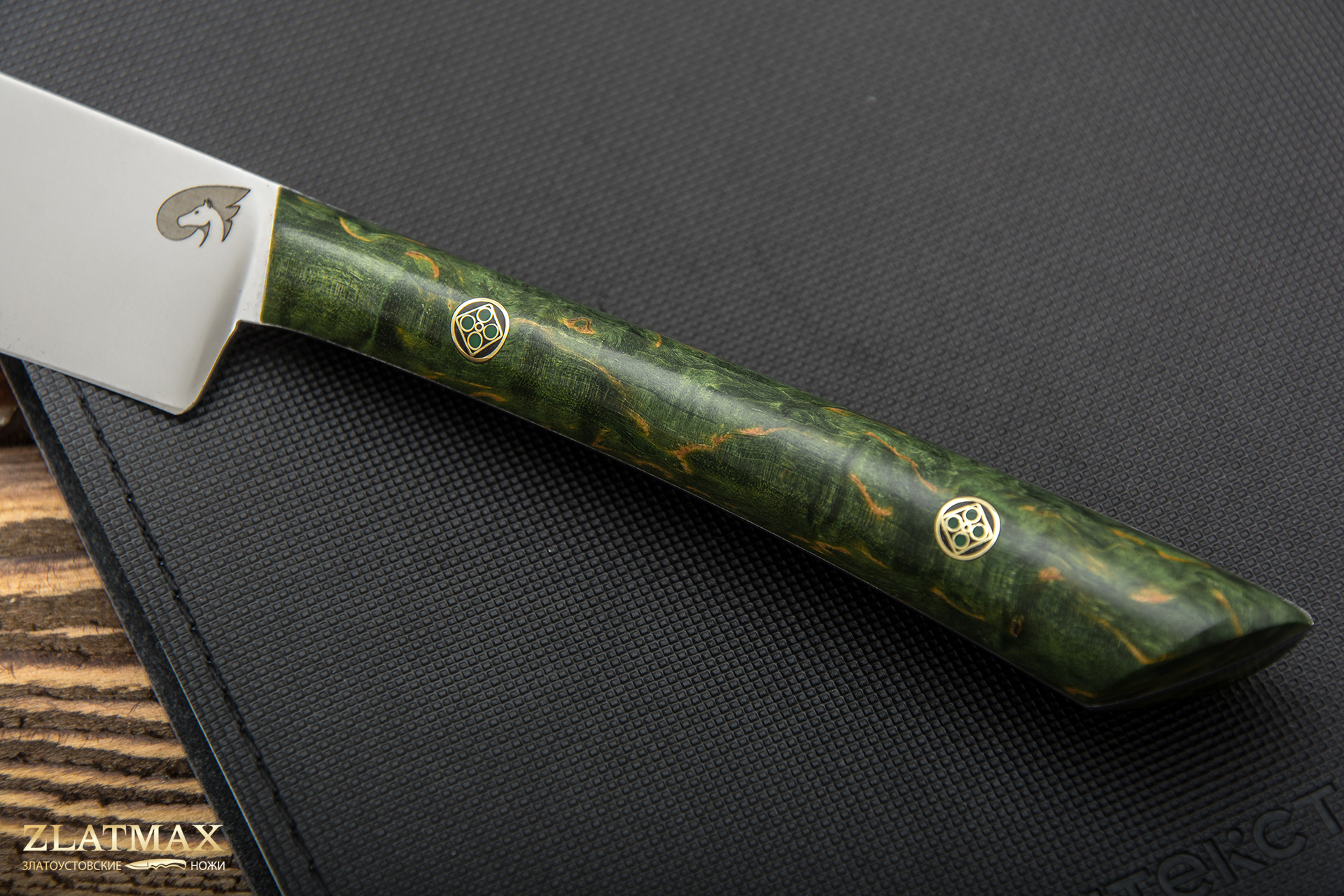 Древесина карельской березы смотрится очень эффектно на рукояти ножа. Необычная текстура материала и красивая палитра оттенков делают вид орудия очень презентабельным.