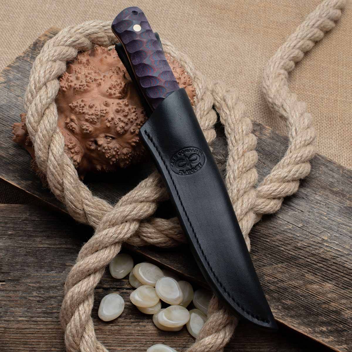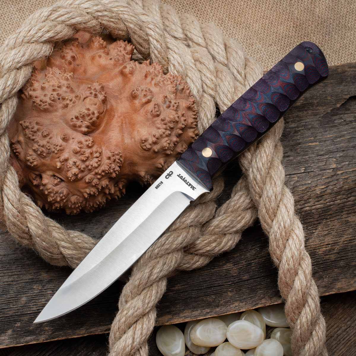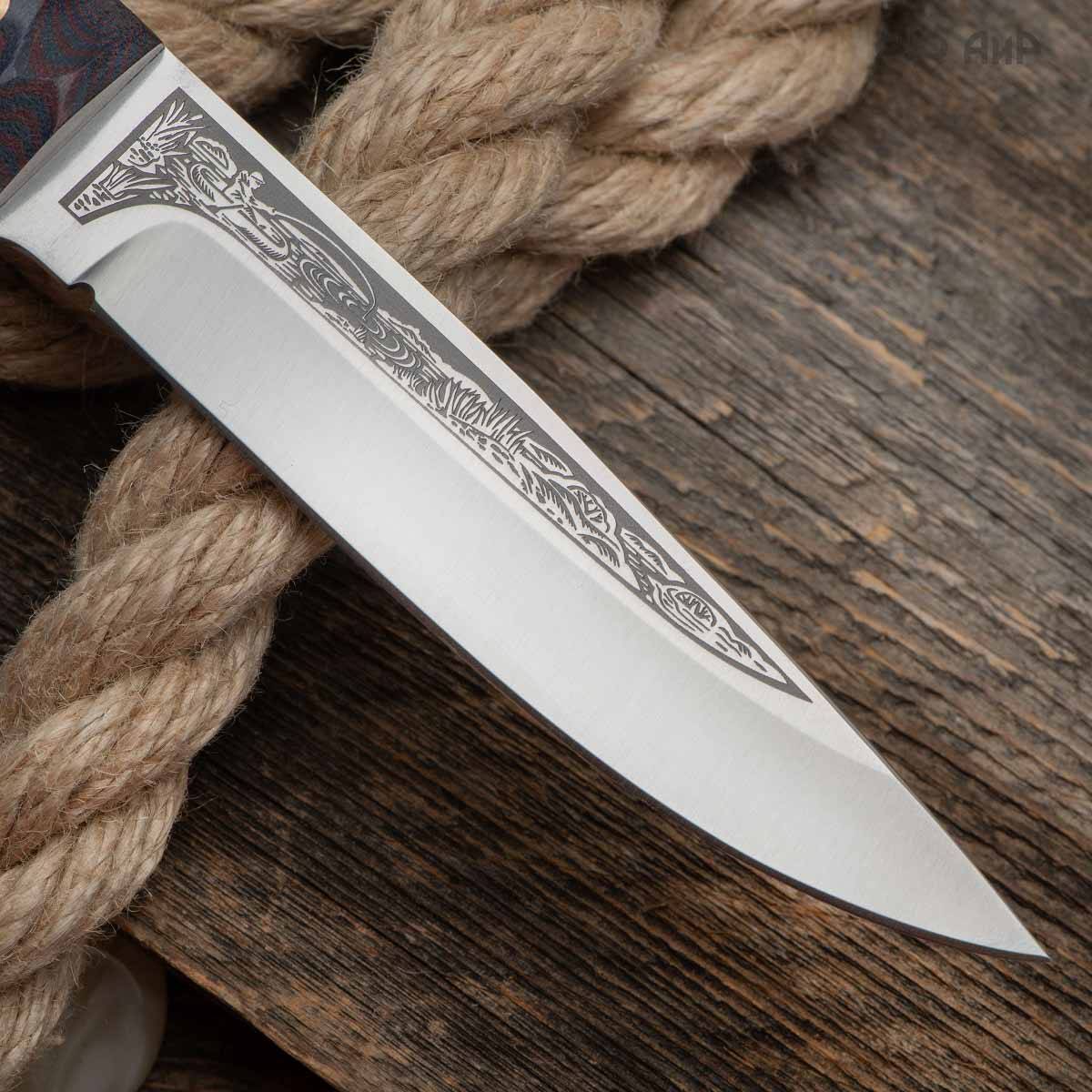 Средний по размерам, универсальный, легкий и прочный нож с клинком, имеющим чуть приспущенный к острию обушок. Вогнутые линзовидные спуски от половины ширины клинка образуют тонкое, изумительно режущее лезвие. Толщина обуха в 2,4 мм позволяет оставить приличную голомень, что придает ему дополнительную прочность. Клинок имеет довольно острый угол острия, что прекрасно подходит для вспарывания брюшка рыбы любой величины, через отверстие движением от себя в сторону нижней челюсти. Эргономичная форма рукояти идеально ложится в любую ладонь. Клинок цельнометаллический, с накладками. Замечательный выбор для любителей рыбной ловли.
