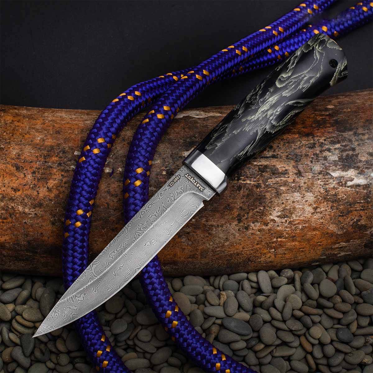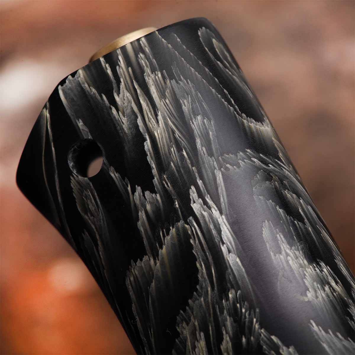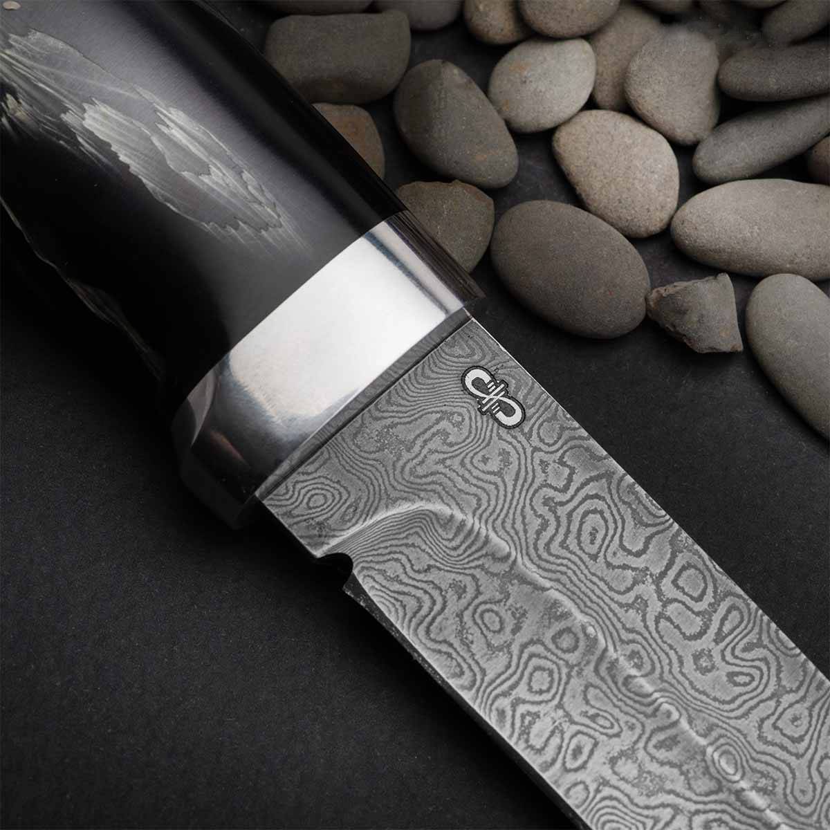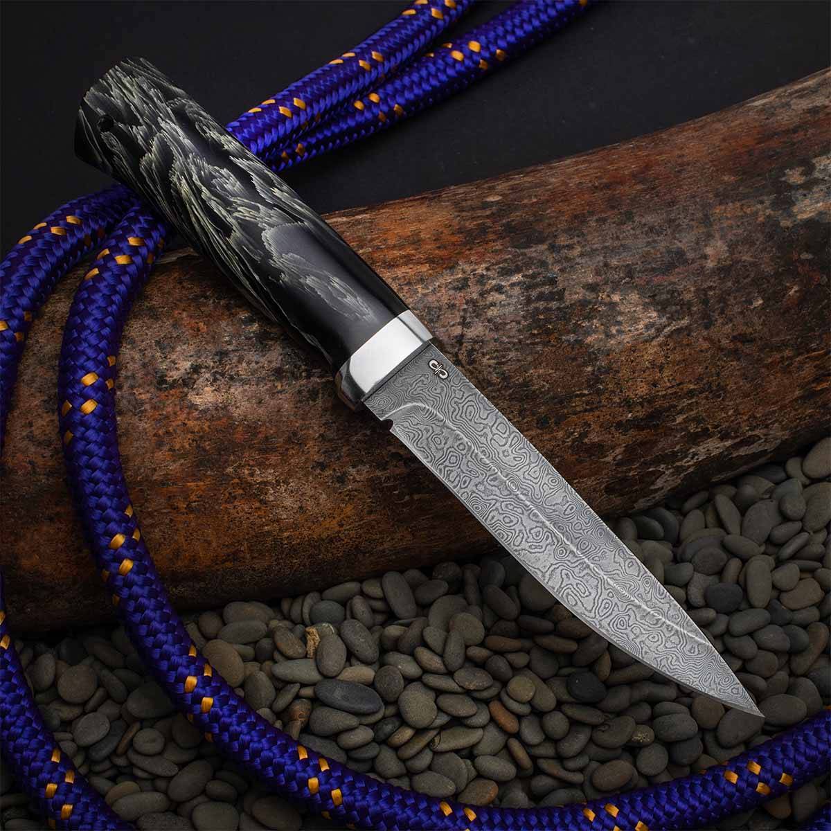 Клинок из композиционной (дамасской) стали производства Компании "АиР" ZD-0803 (ZLAtoust+Damast, 08 – среднее содержание углерода 0,8%, 03 – среднее содержание легирующих элементов (хром, никель, молибден, ванадий и т.д.).
