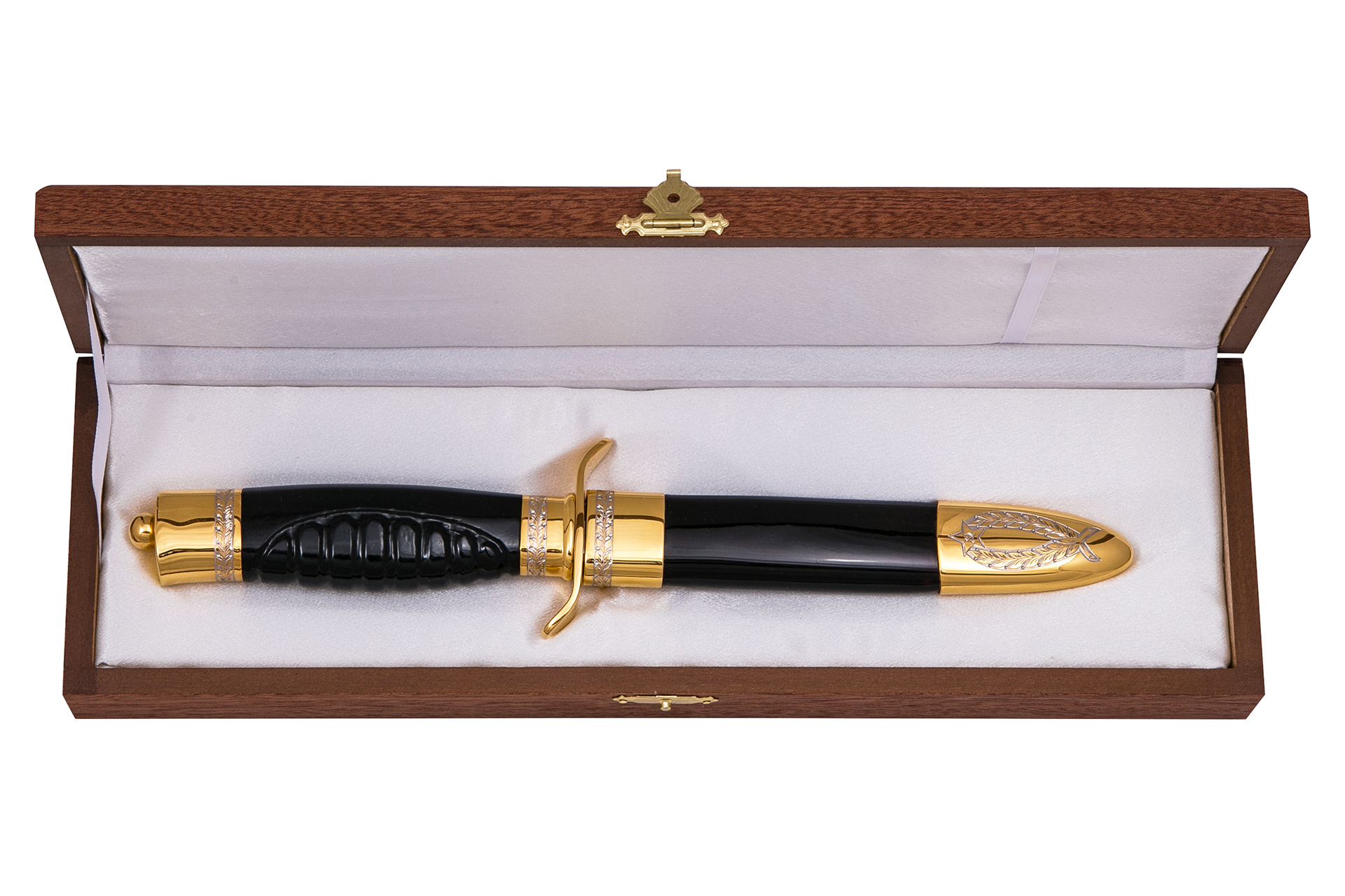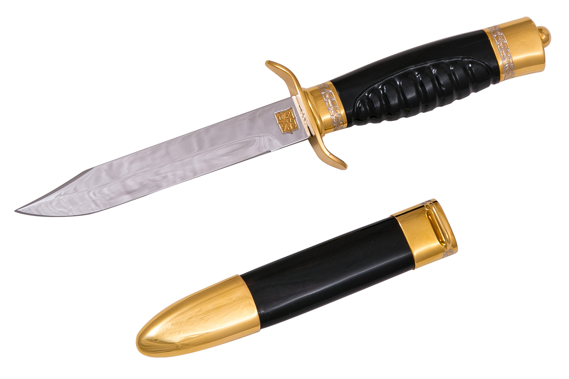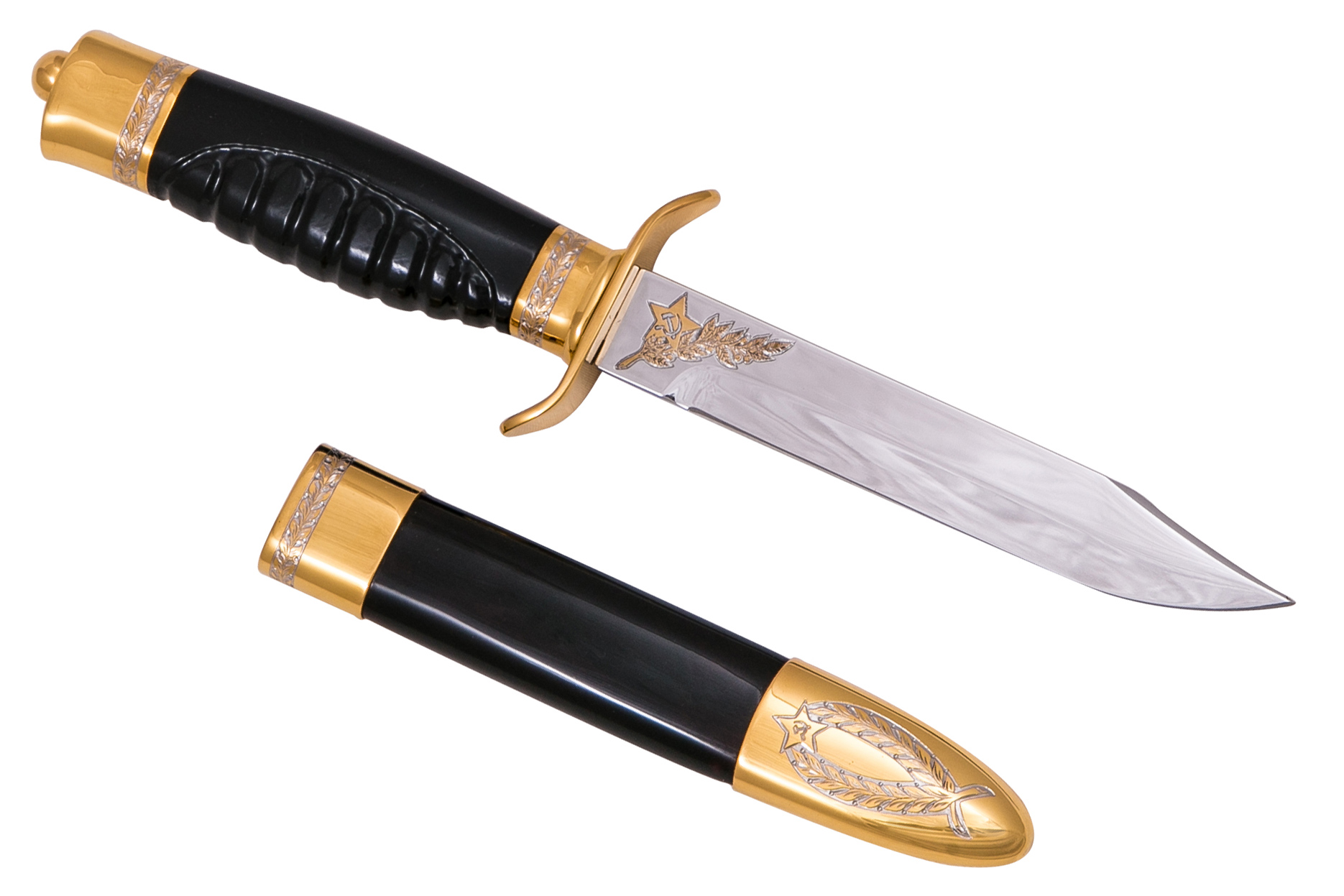 Черный нож разведчика «НР-40» имеет строгий солидный дизайн. Стальной прочный клинок украшен гравировкой с изображением серпа и молота в звезде. Такие же мотивы присутствуют в украшении ножен, которые изготовлены из ценных пород дерева. Рукоять имеет резьбу, дополнена декоративными элементами, материал – дерево. Данный нож является ручной работой. Особой изысканности приносят золотое и никелевое покрытие.