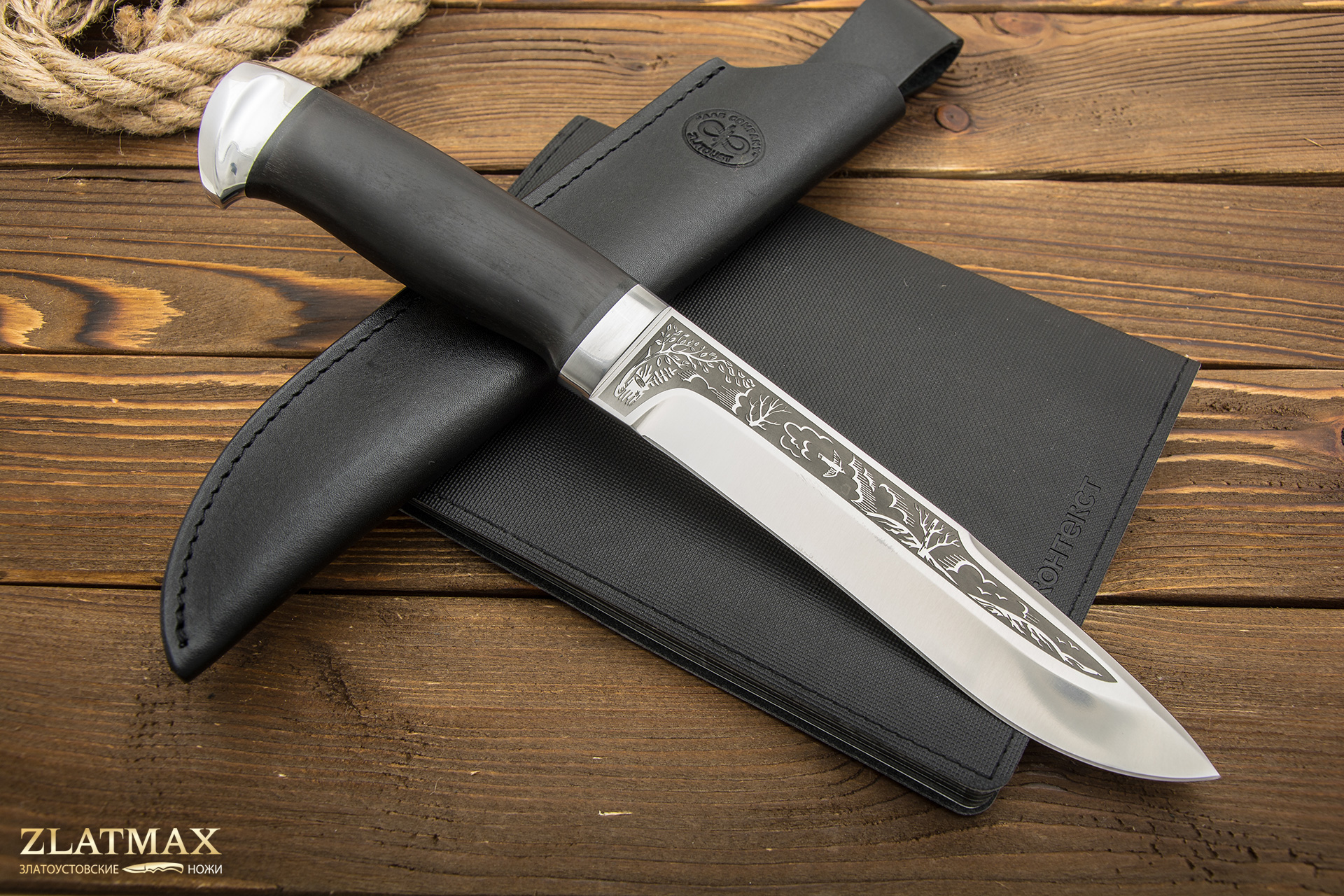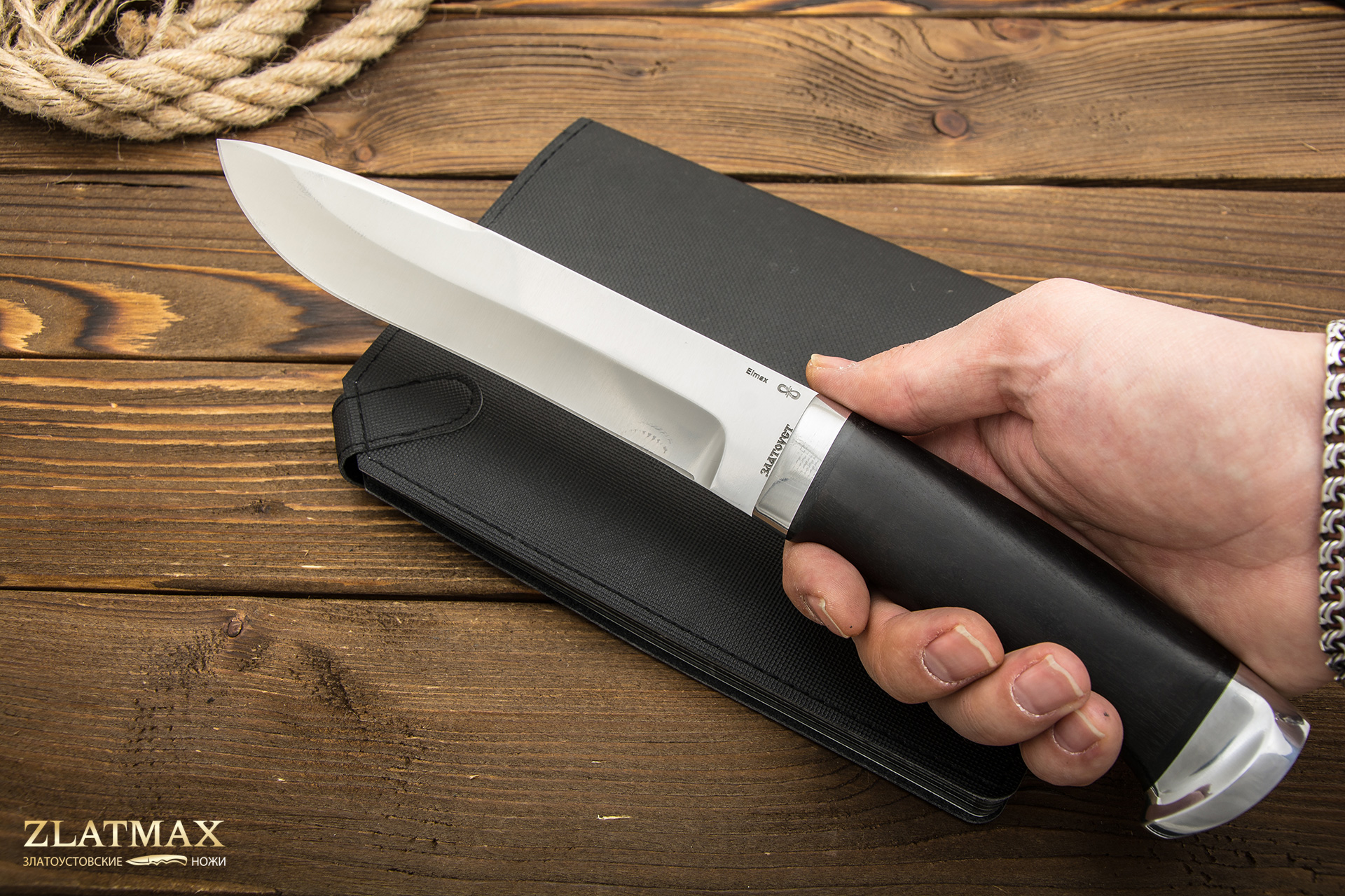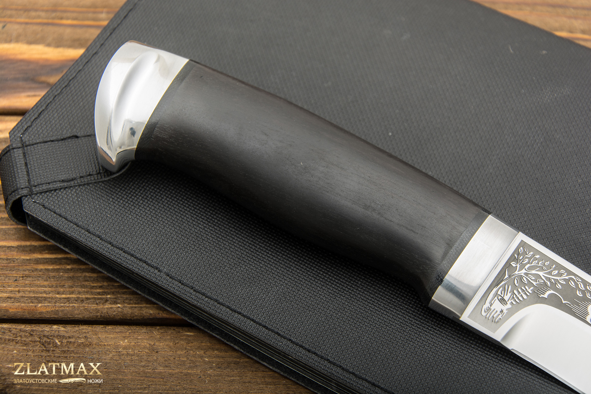 В нашем производстве используется мореный граб. Он повторяет структуру эбенового дерева, которое является ценной и красивой породой. Граб пропитан смолами, ему не страшно попадание влаги, он не растрескается со временем. Смотрится представительно и отлично подходит для подарочного варианта ножа.