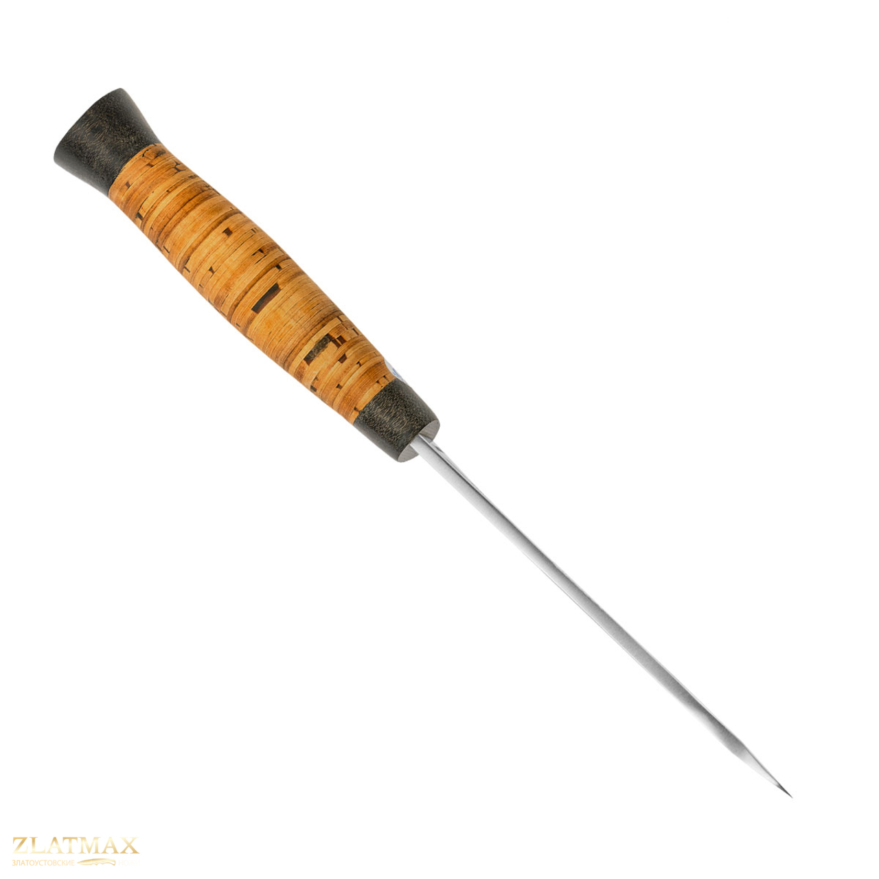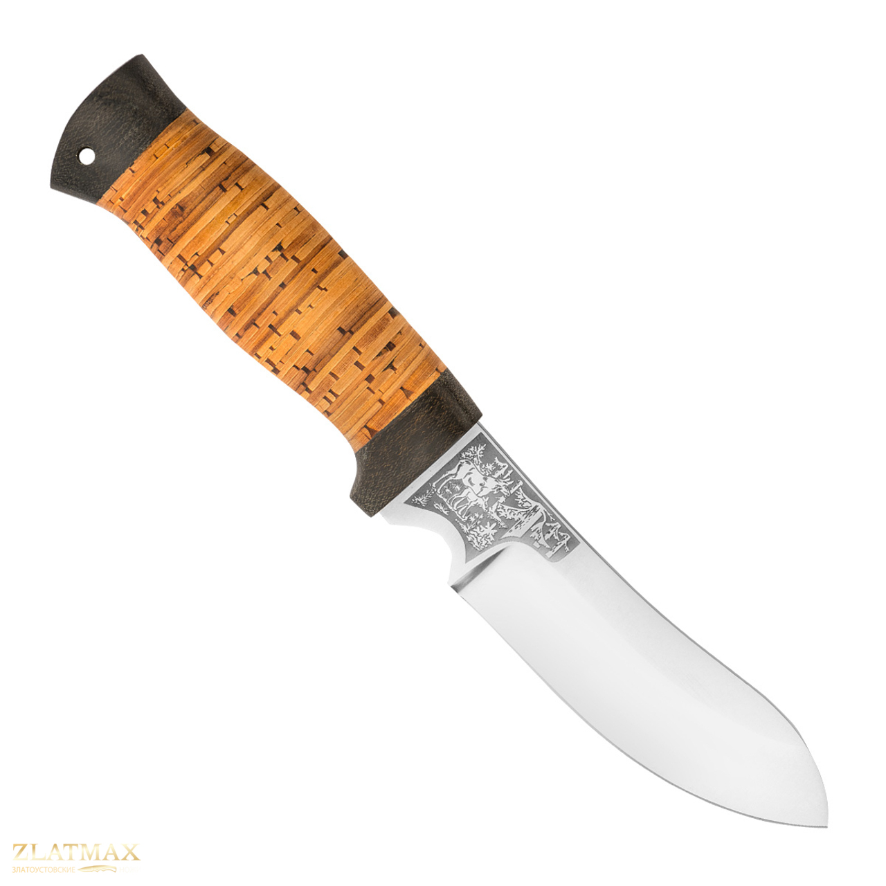 Прекрасные режущие качества этого ножа обуславливаются, в первую очередь, тонким лезвием и типичной формой скандинавского инструмента. Этот разделочный нож очень удобен в применении, имеет красивый внешний вид широкого клинка и рукояти, что свойственно при покупке для подарка. Вогнутые спуски сохраняются на 2/3 длины клинка. Все его возможности собраны для необходимой работы им, к примеру, снять шкуру животного без лишних повреждений брюшины. Работать ножом тремя-четырьмя хватами позволяет специальный вырез на пяте. Соответственная толщина обуха в 4 мм. делает это орудие прочным и легко управляемым. Обезопасить и упростить работу потребителя позволяет удобная рукоять с упором для указательного пальца. Планируется разработка ножа с клинком около 95 мм.
