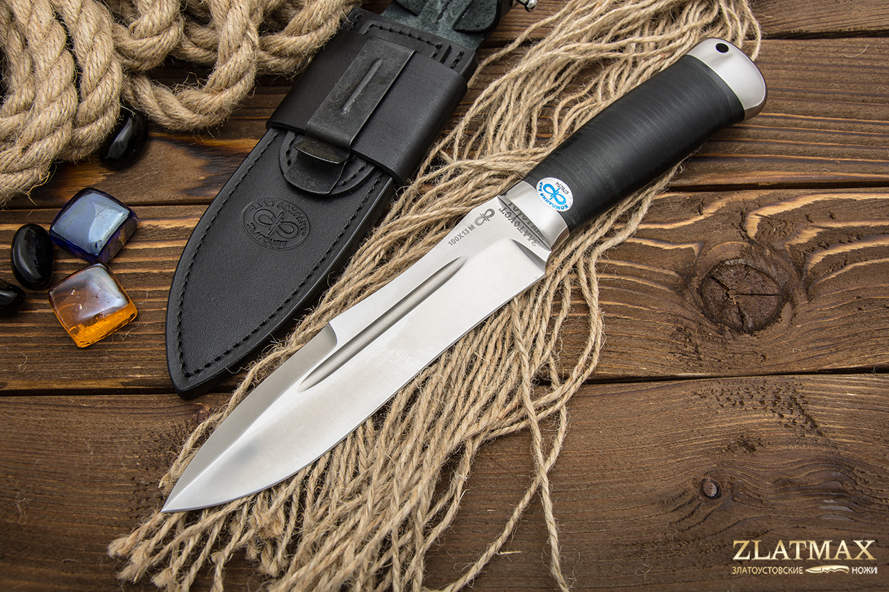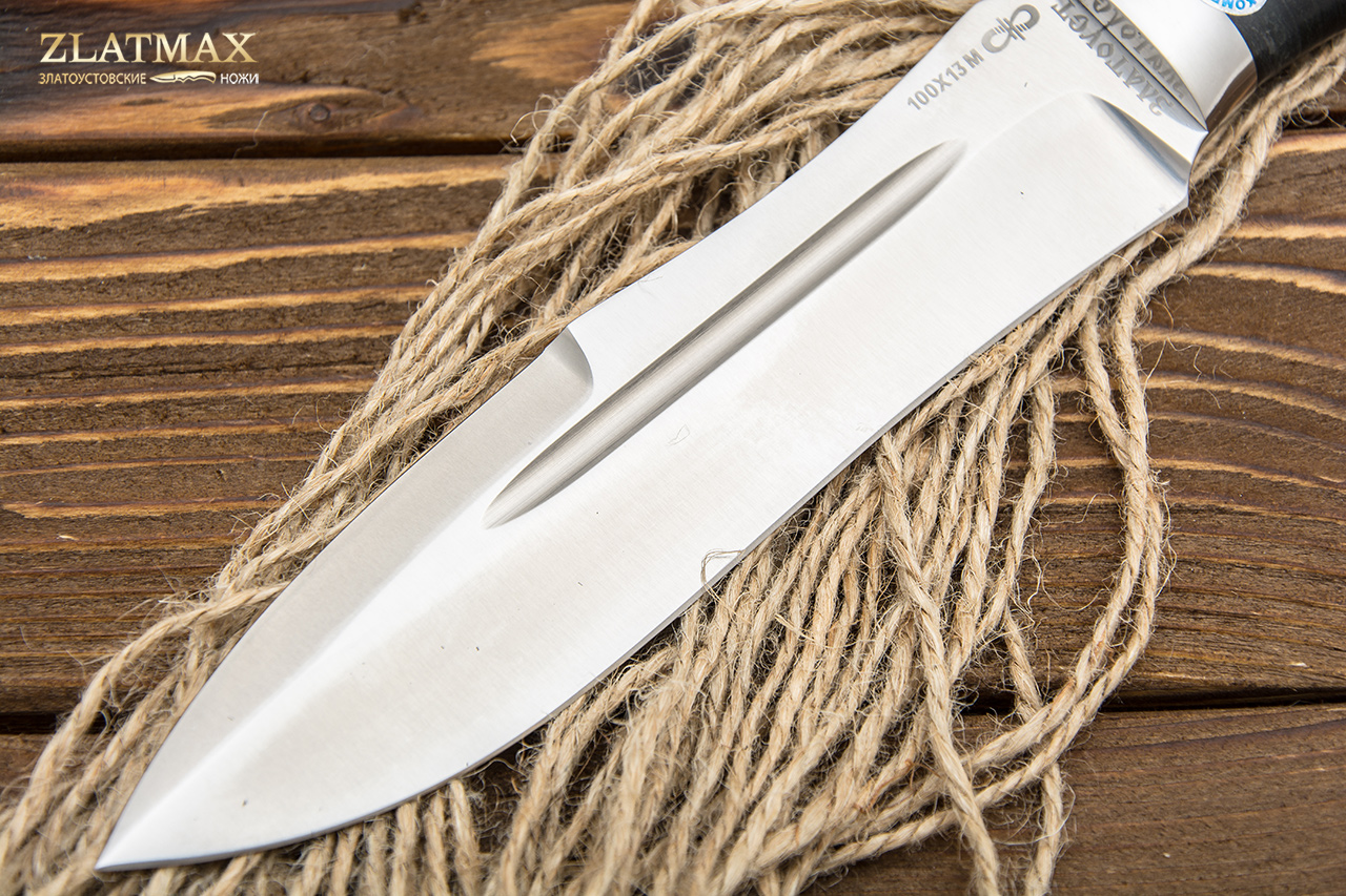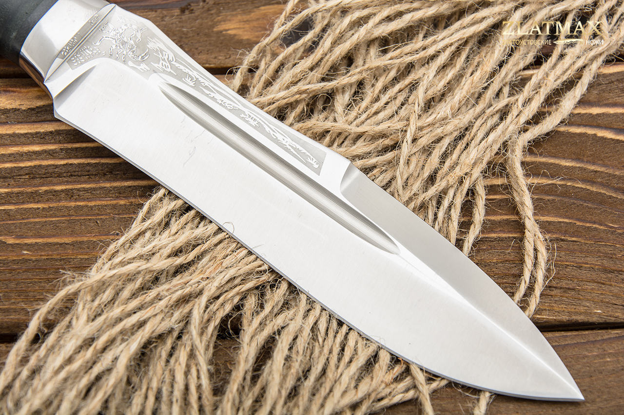Хищный, массивный нож, который мы рекомендуем использовать туристам, любителям проводить время на природе, ну и, конечно же, охотникам. Шестимиллиметровый обух делает инструмент несокрушимым, как внешне, так и по режуще-рабочим качествам. Два дола по обеим сторонам добавляют уверенности в прочности такого ножа. До половины обуха протягивается фальшлезвие, которое пригодится при рубке костей, а толстый обух может помочь при необходимости забить гвоздь. «Скорпион» выполнен в современном стиле, отлично режет колбасу и хлеб, не ломая их на куски, а вот красиво и тонко нарезать сыр нужно приноровиться. Им легко настрогать лучину для костра, прорубить заросли и даже молодые березы для устройства ночлега в экстремальной ситуации. На рукояти имеется отверстие под темляк.