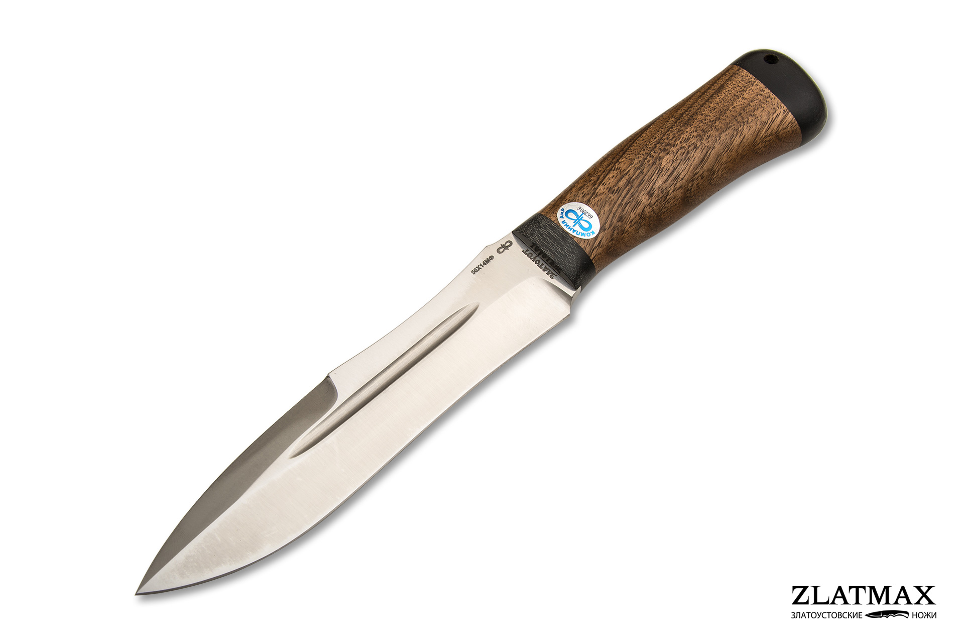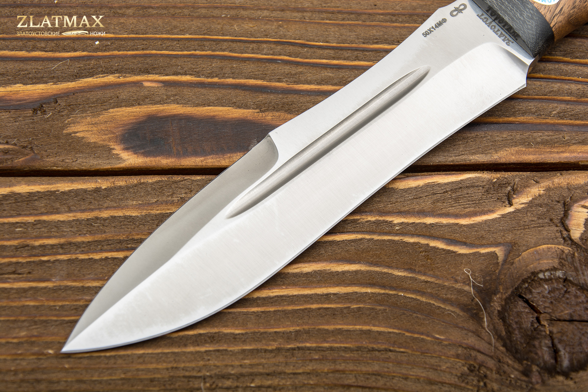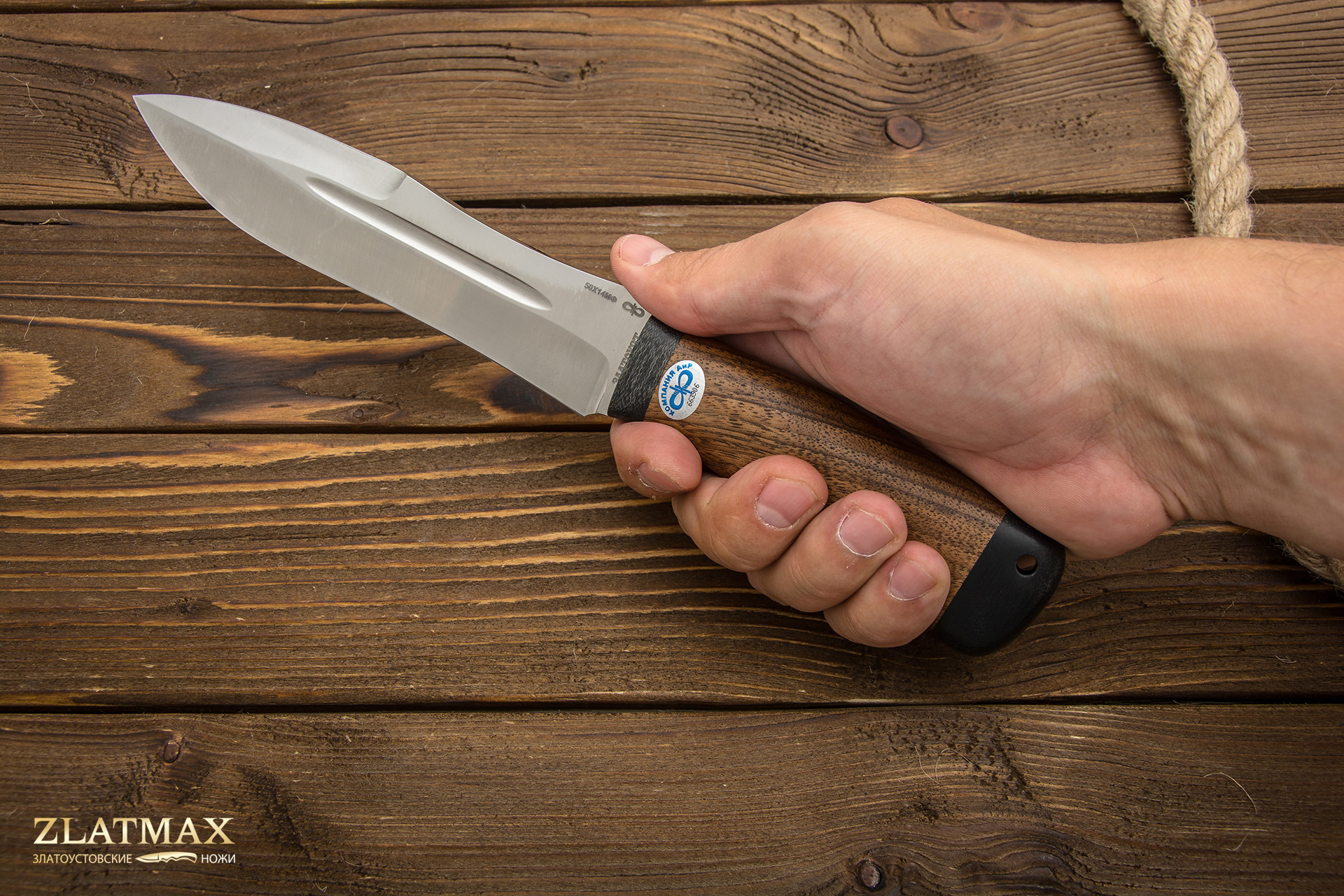 Хищный, массивный нож, который мы рекомендуем использовать туристам, любителям проводить время на природе, ну и, конечно же, охотникам. Шестимиллиметровый обух делает инструмент несокрушимым, как внешне, так и по режуще-рабочим качествам. Два дола по обеим сторонам добавляют уверенности в прочности такого ножа. До половины обуха протягивается фальшлезвие, которое пригодится при рубке костей, а толстый обух может помочь при необходимости забить гвоздь. «Скорпион» выполнен в современном стиле, отлично режет колбасу и хлеб, не ломая их на куски, а вот красиво и тонко нарезать сыр нужно приноровиться. Им легко настрогать лучину для костра, прорубить заросли и даже молодые березы для устройства ночлега в экстремальной ситуации. На рукояти имеется отверстие под темляк.