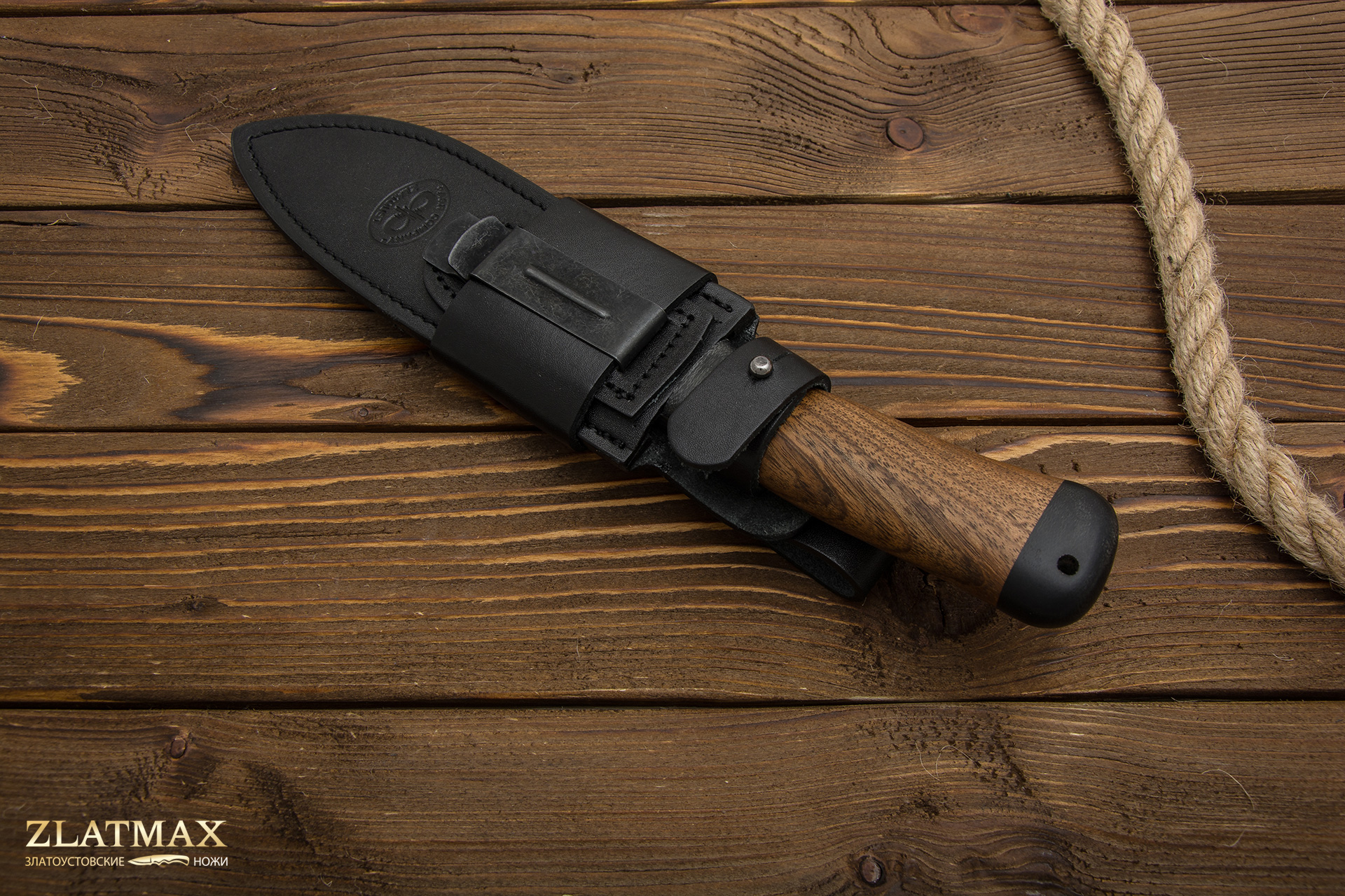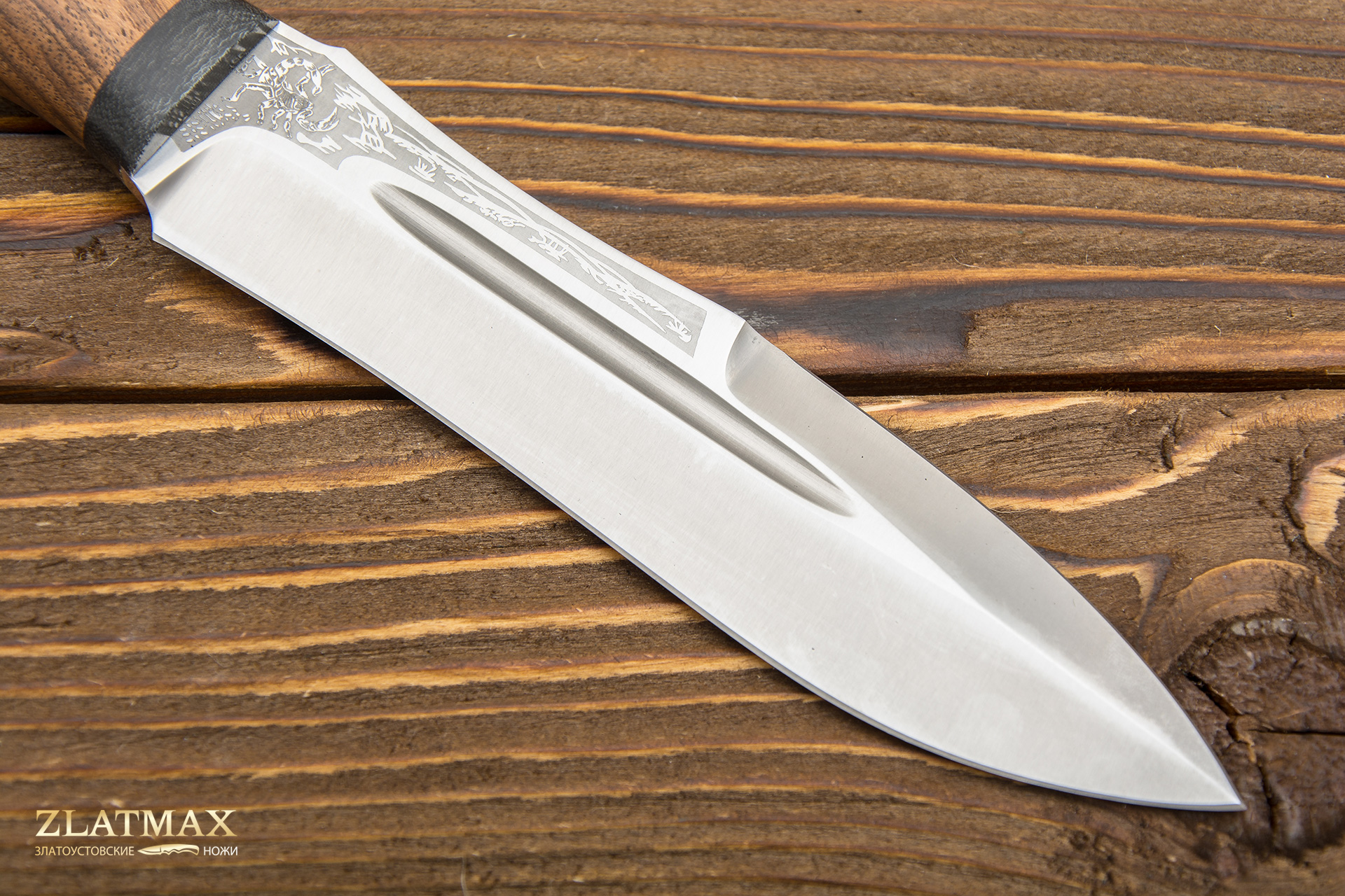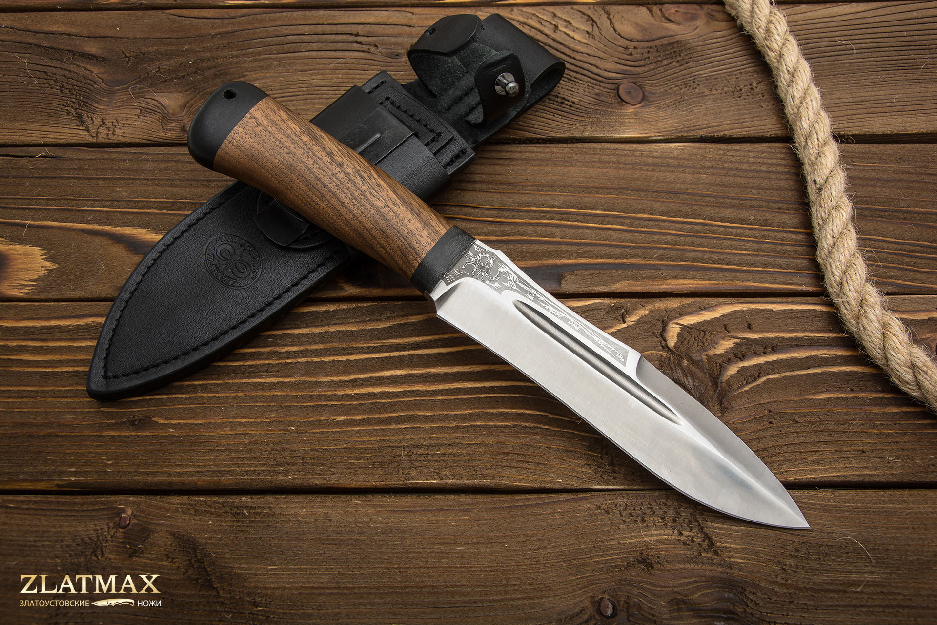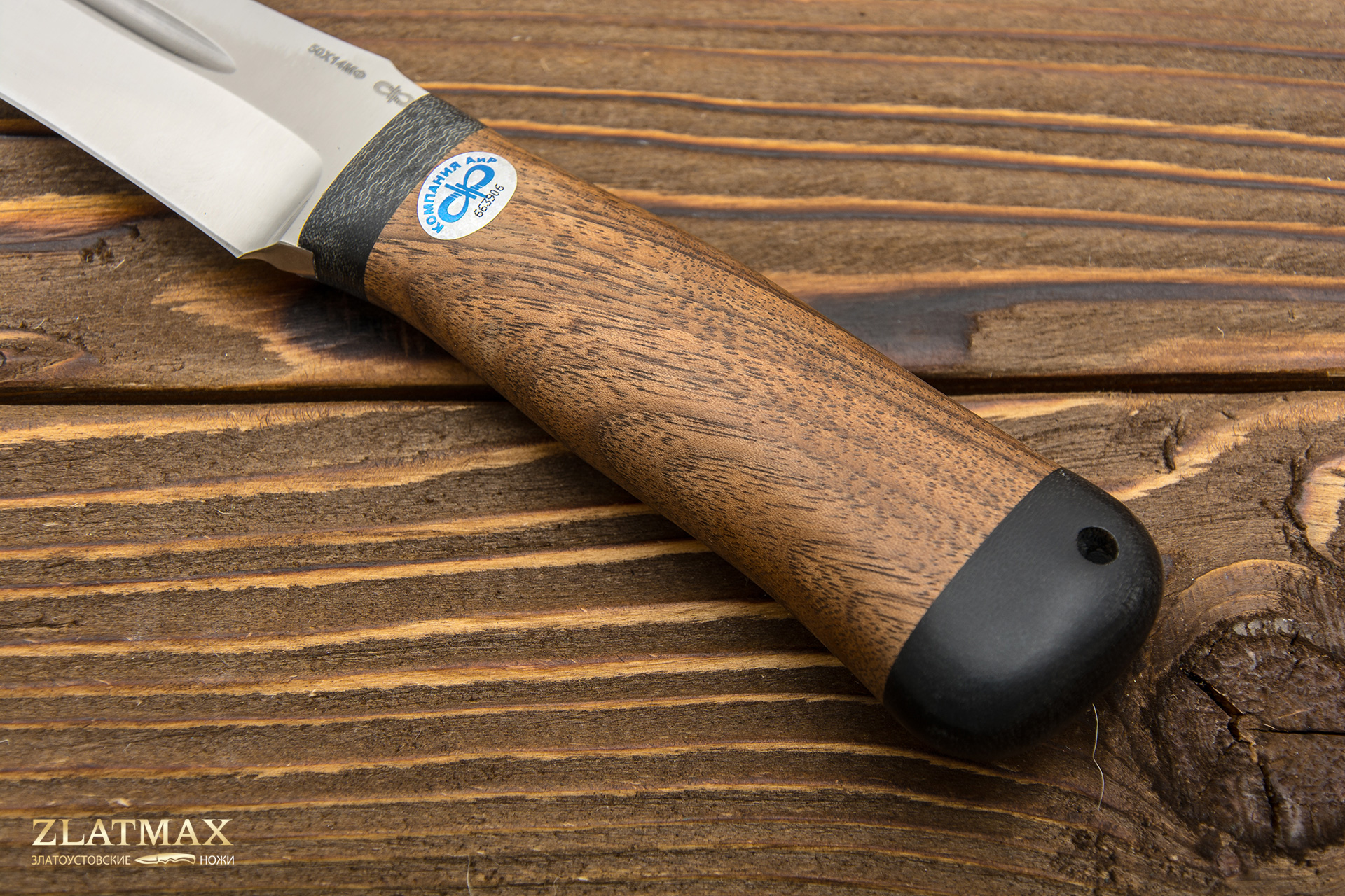 Хищный, массивный нож, который мы рекомендуем использовать туристам, любителям проводить время на природе, ну и, конечно же, охотникам. Шестимиллиметровый обух делает инструмент несокрушимым, как внешне, так и по режуще-рабочим качествам. Два дола по обеим сторонам добавляют уверенности в прочности такого ножа. До половины обуха протягивается фальшлезвие, которое пригодится при рубке костей, а толстый обух может помочь при необходимости забить гвоздь. «Скорпион» выполнен в современном стиле, отлично режет колбасу и хлеб, не ломая их на куски, а вот красиво и тонко нарезать сыр нужно приноровиться. Им легко настрогать лучину для костра, прорубить заросли и даже молодые березы для устройства ночлега в экстремальной ситуации. На рукояти имеется отверстие под темляк.