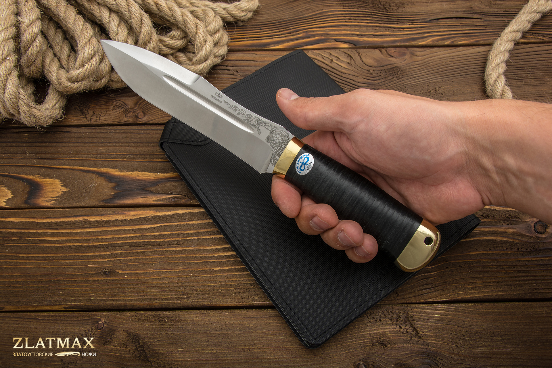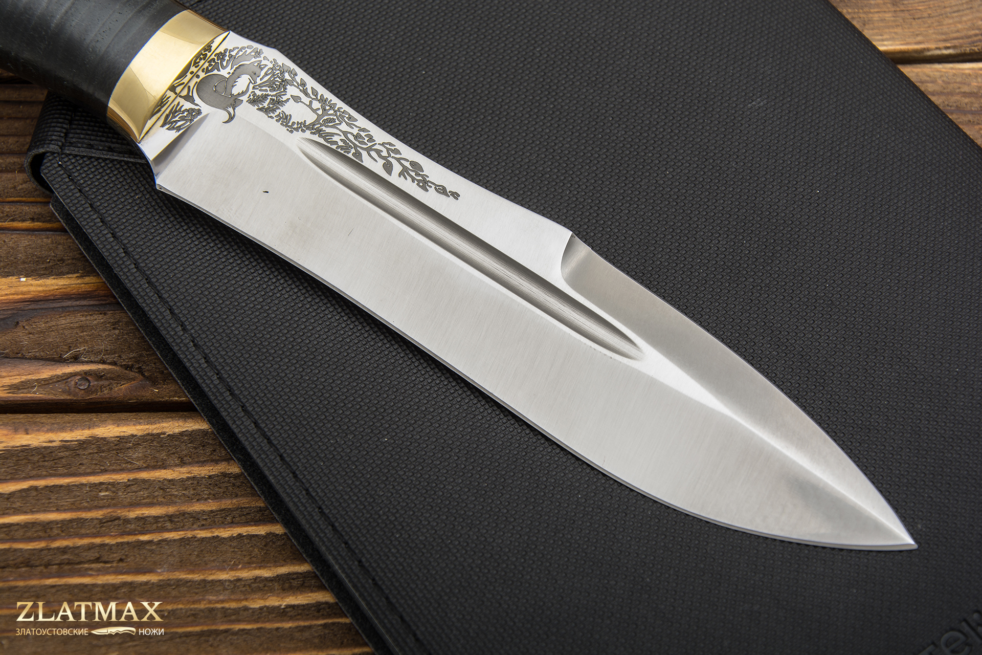 Хищный, массивный нож, который мы рекомендуем использовать туристам, любителям проводить время на природе, ну и, конечно же, охотникам. Шестимиллиметровый обух делает инструмент несокрушимым, как внешне, так и по режуще-рабочим качествам. Два дола по обеим сторонам добавляют уверенности в прочности такого ножа. До половины обуха протягивается фальшлезвие, которое пригодится при рубке костей, а толстый обух может помочь при необходимости забить гвоздь. «Скорпион» выполнен в современном стиле, отлично режет колбасу и хлеб, не ломая их на куски, а вот красиво и тонко нарезать сыр нужно приноровиться. Им легко настрогать лучину для костра, прорубить заросли и даже молодые березы для устройства ночлега в экстремальной ситуации. На рукояти имеется отверстие под темляк.
