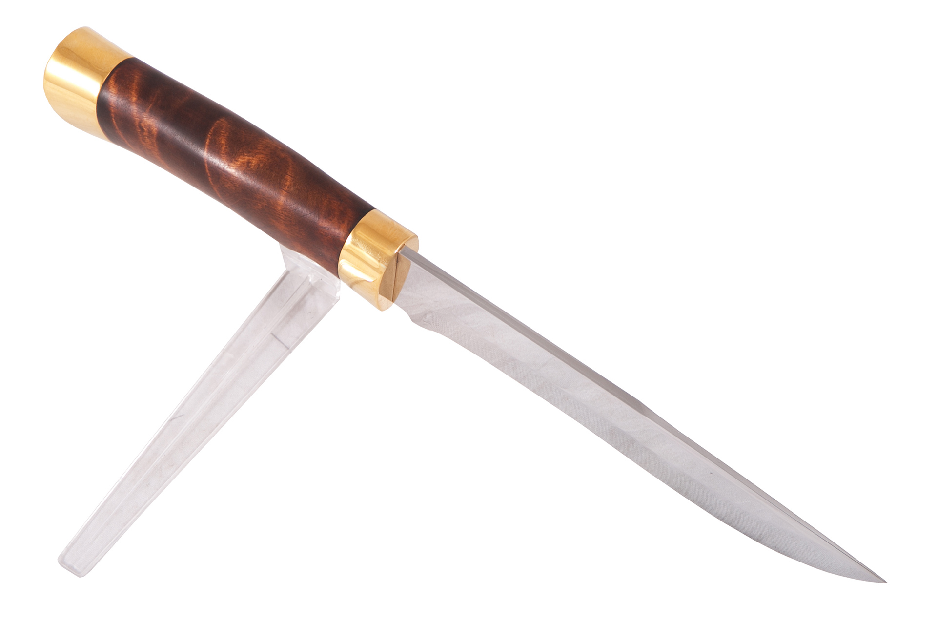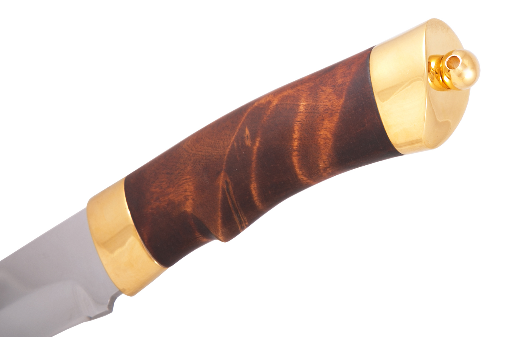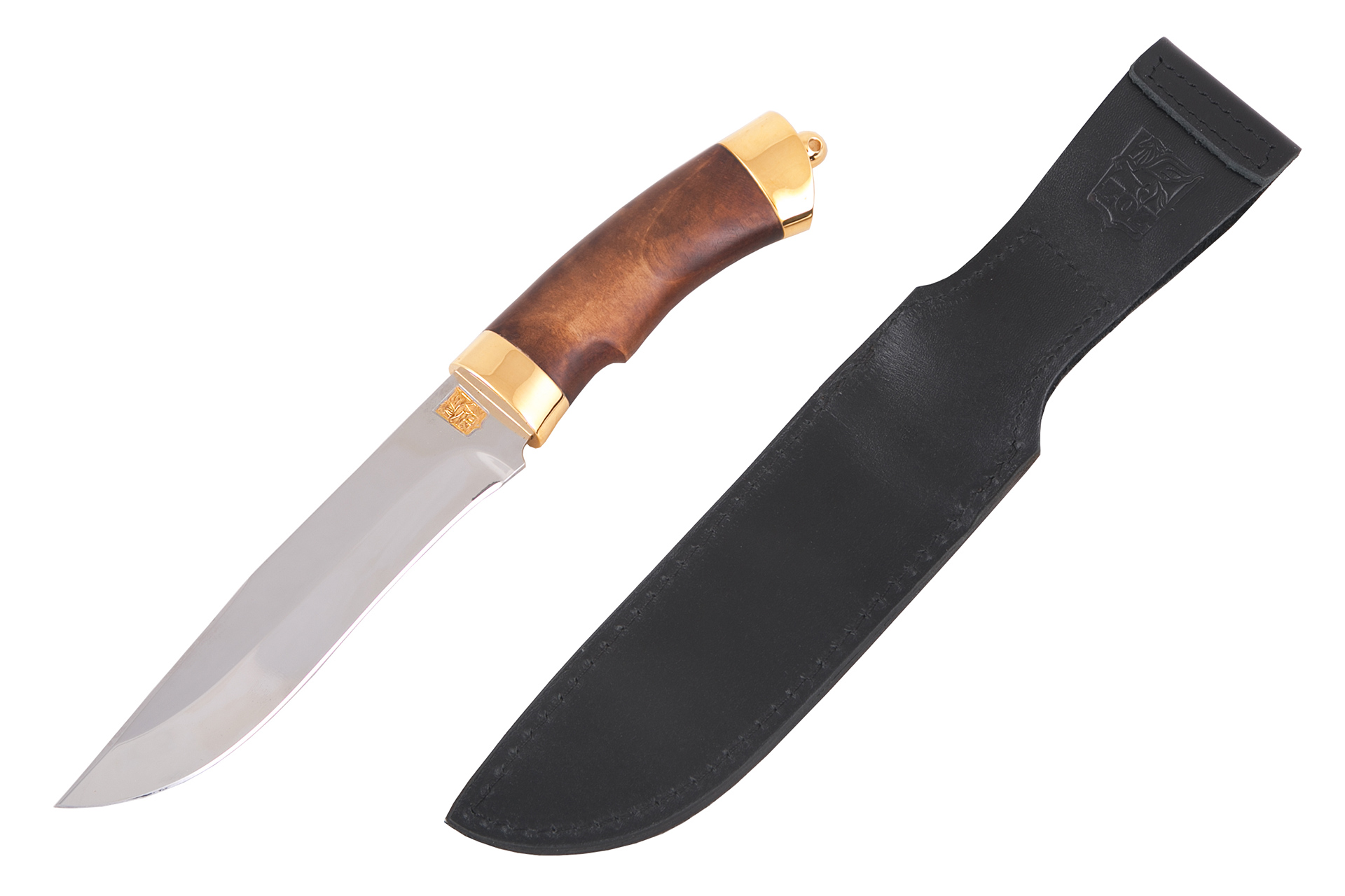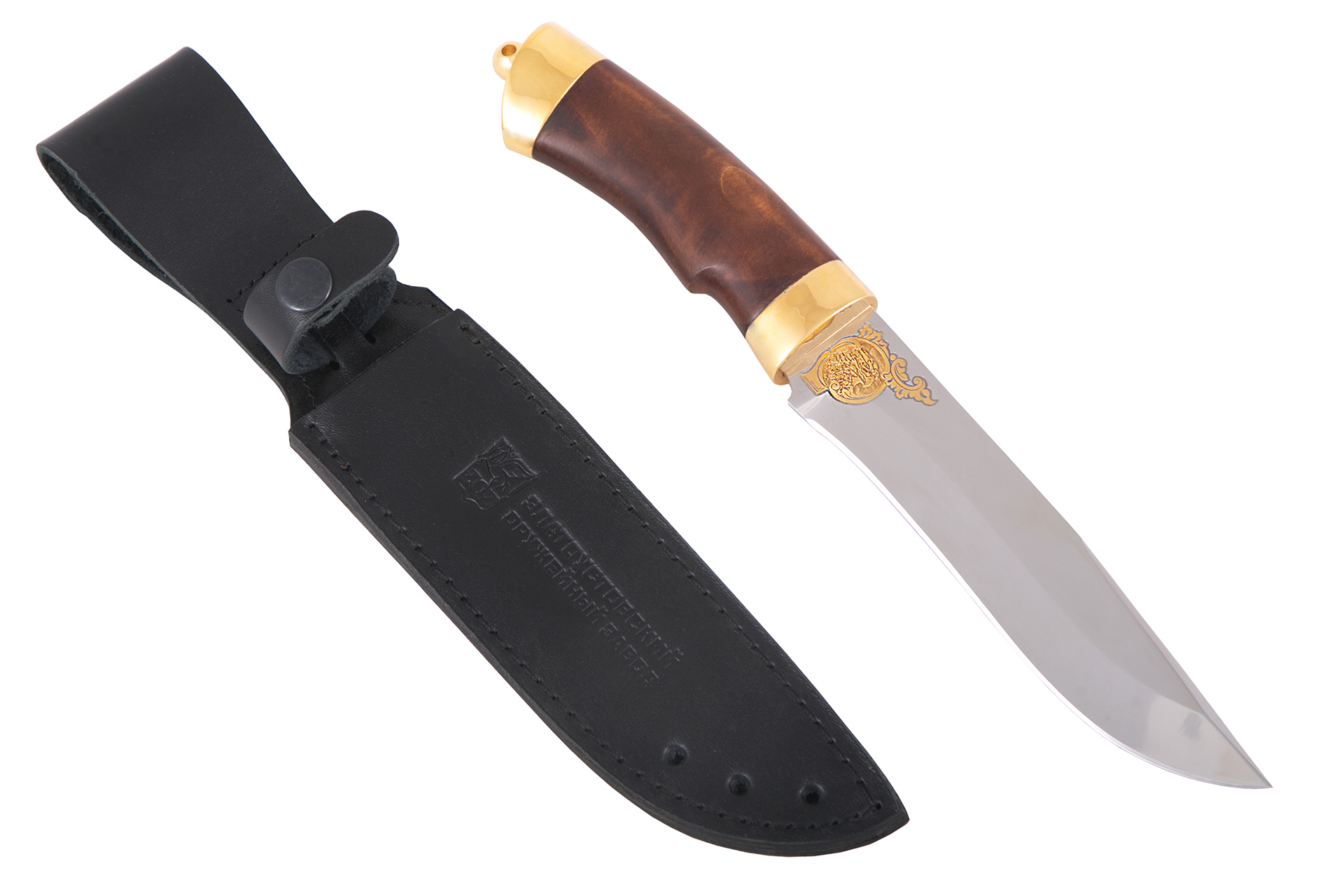 Материал: клинок из стали ЭИ-107; рукоять - кап березовый; тыльник, гарда - латунь; кожаные ножны. Покрытие: золотом 999,9; никелем. Техника исполнения: токарные и слесарные работы, полировка. Характеристики Ножи Охотничьи Тип стали Кованная нержавеющая 40Х10С2М(ЭИ-107) Материал рукояти Березовый кап Общая длина, мм 295 Длина клинка, мм 155 Ширина клинка, мм 30 Толщина клинка, мм 3 Твердость клинка, HRC 58 Покрытие Гальванический метод Вес ножа, кг 0.309 Материал ножен Кожа