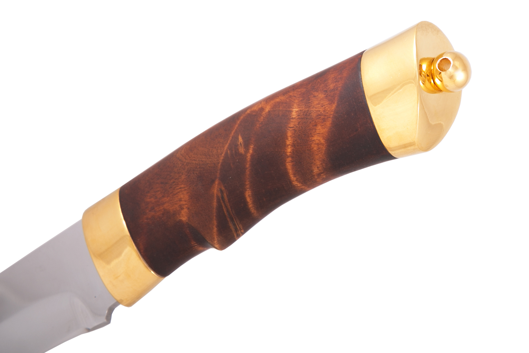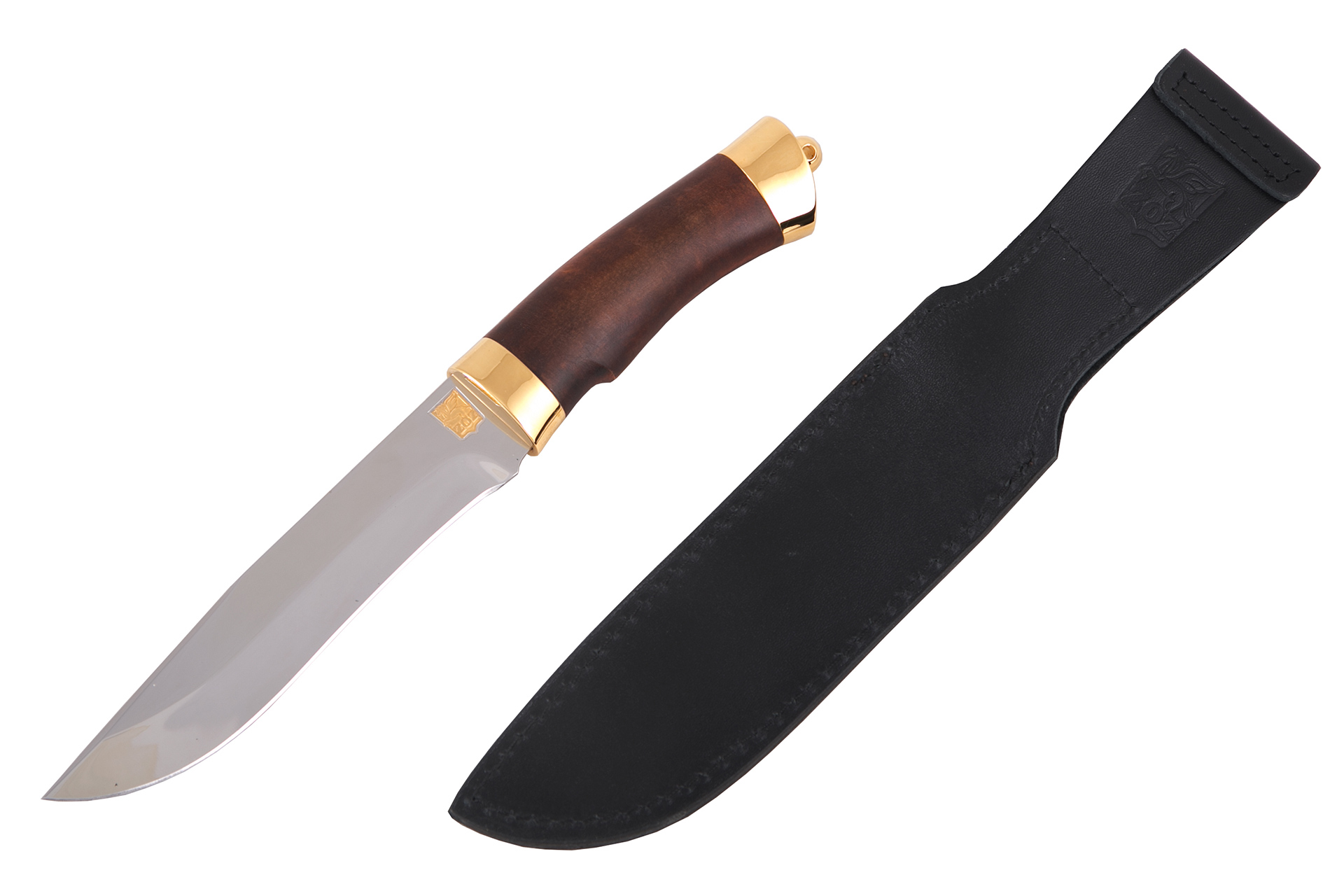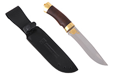 Материал: клинок из стали ЭИ-107; рукоять - кап березовый; тыльник, гарда - латунь; кожаные ножны. Покрытие: золотом 999,9; никелем. Техника исполнения: токарные и слесарные работы, полировка. Характеристики Ножи Охотничьи Тип стали Кованная нержавеющая 40Х10С2М(ЭИ-107) Материал рукояти Березовый кап Общая длина, мм 295 Длина клинка, мм 155 Ширина клинка, мм 30 Толщина клинка, мм 3 Твердость клинка, HRC 58 Покрытие Гальванический метод Вес ножа, кг 0.309 Материал ножен Кожа
