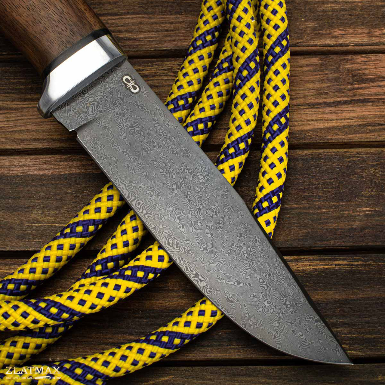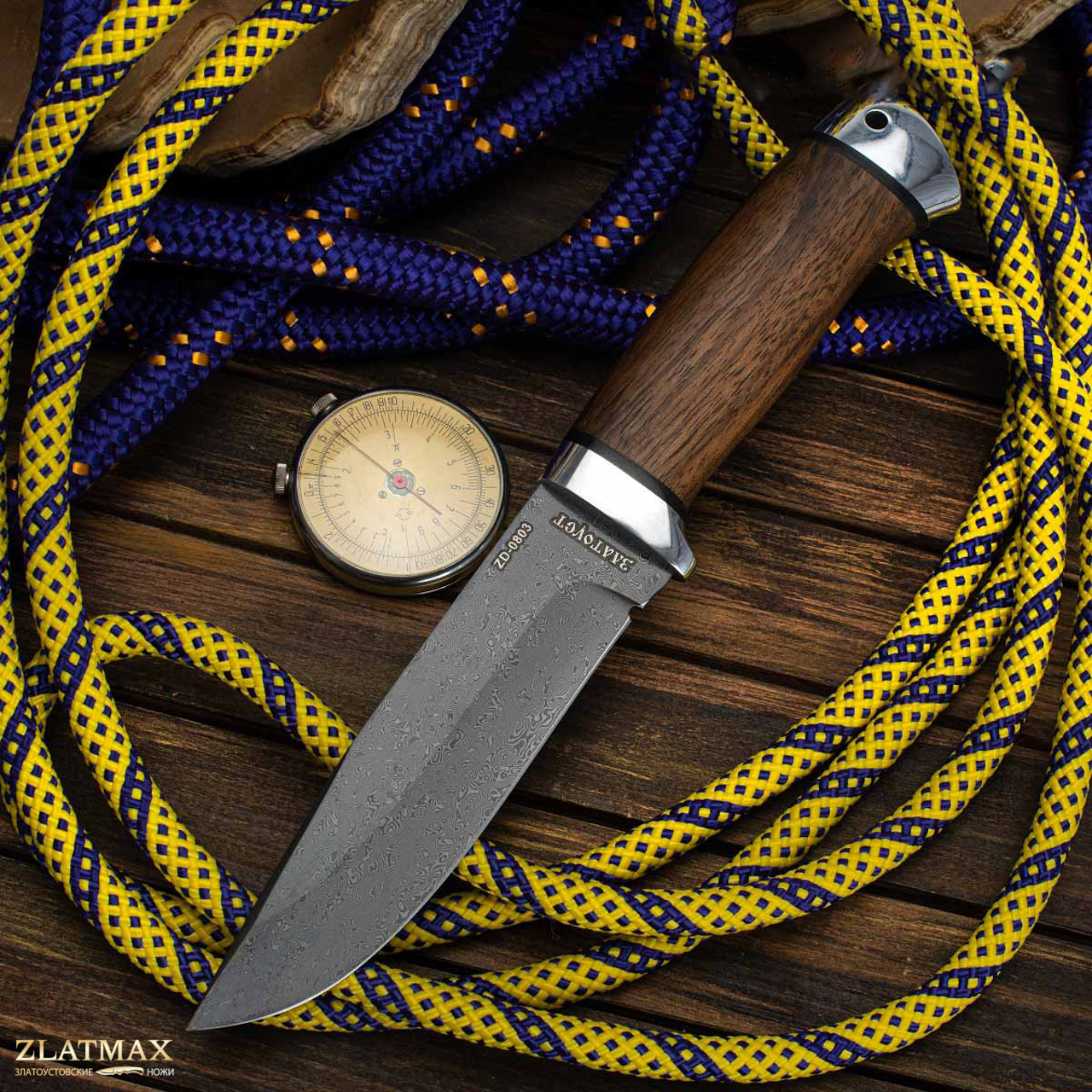 Клинок из композиционной (дамасской) стали производства Компании "АиР" ZD-0803 (ZLAtoust+Damast, 08 – среднее содержание углерода 0,8%, 03 – среднее содержание легирующих элементов (хром, никель, молибден, ванадий и т.д.).