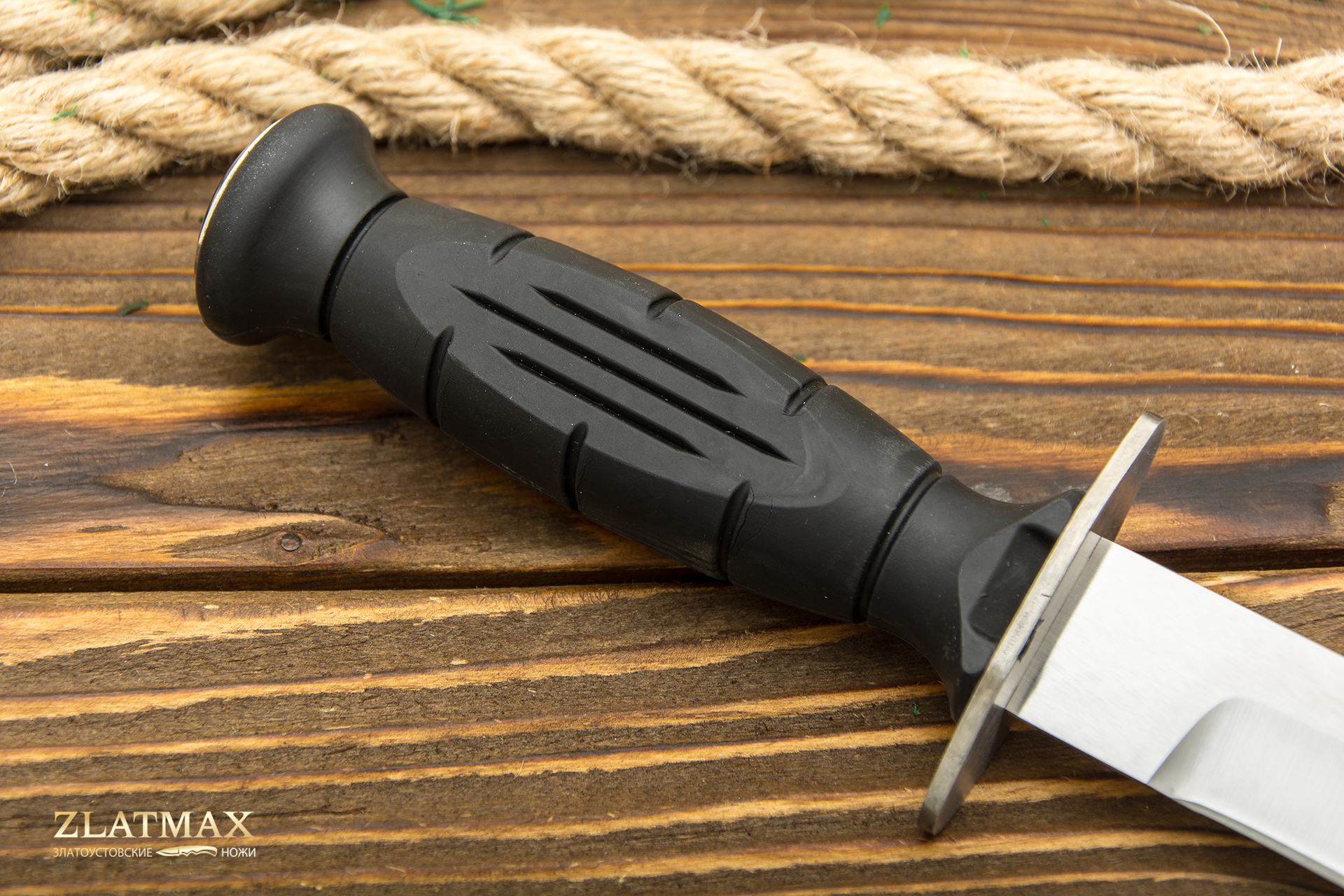 Материал рукояти- эластоллан (черного или зеленого цвета). Клинок имеет цельный хвостовик с резьбой на конце. гарда изготовлена из нержавеющей стали, прямая, без изгибов. Затягивается стальной хромированной гайкой. Гайка накручивается на хвостовик клинка и фиксирует на нем рукоятку. Важным качеством можно назвать кожаные ножны, которые носят на поясном ремне.