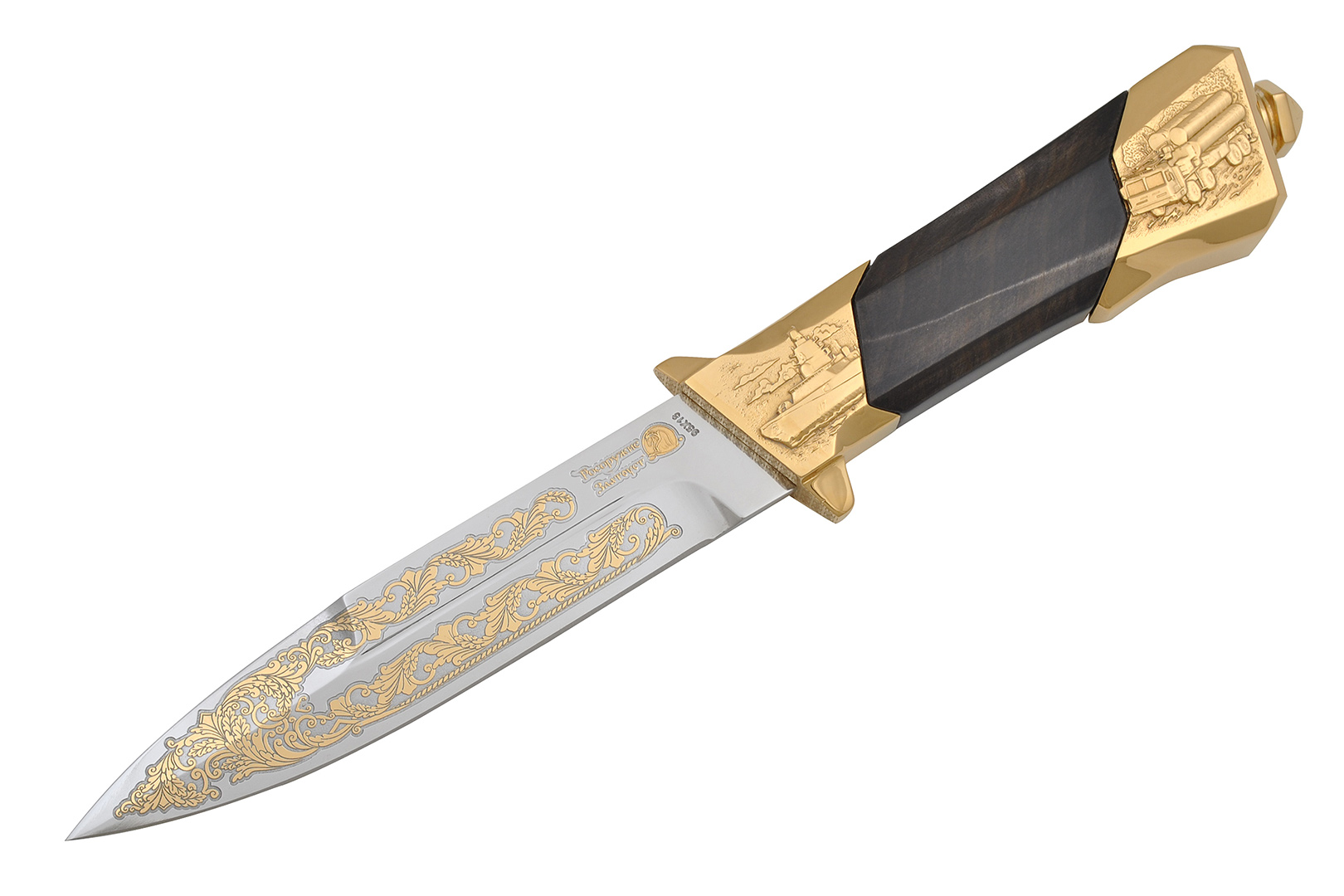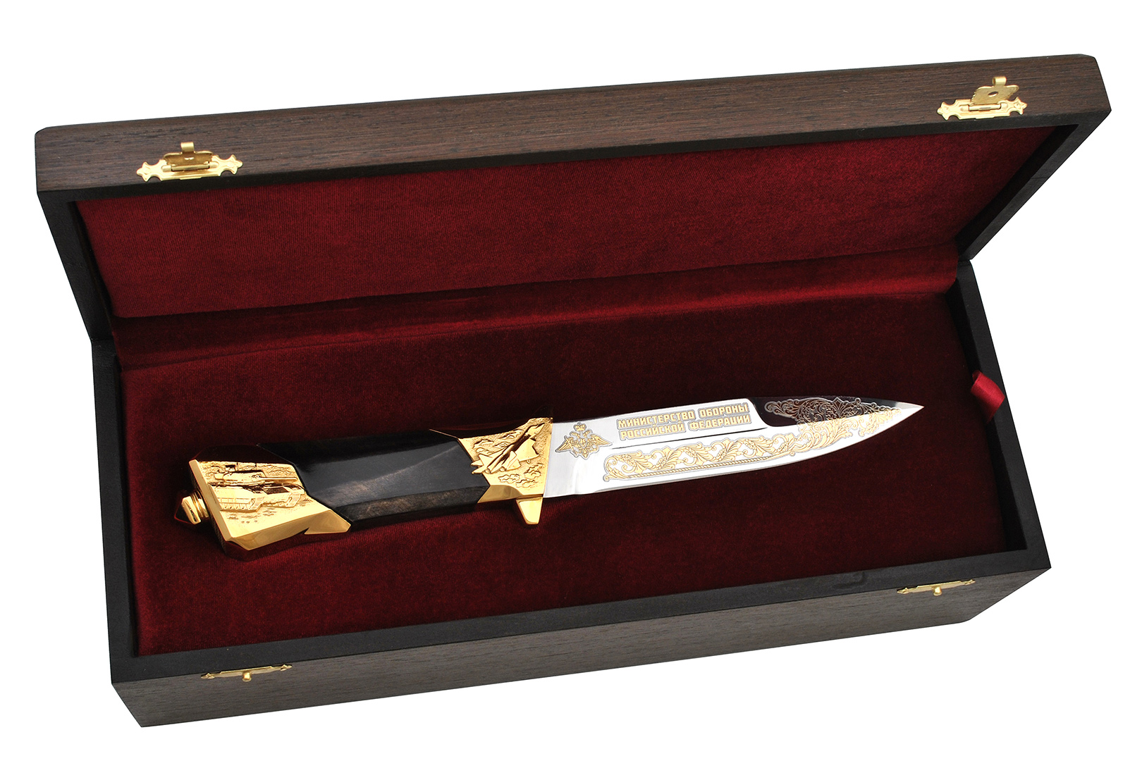 Нож подарочный «Виват, Россия!» создан, как дань уважения к офицерам российской армии. Украшенное холодное оружие Златоустовских мастеров отличается тонкостью и четкостью изображения, неповторимым изяществом. Сочетание золотого орнамента и сверкающей полированной поверхности придает изделиям особую оригинальность и красоту.