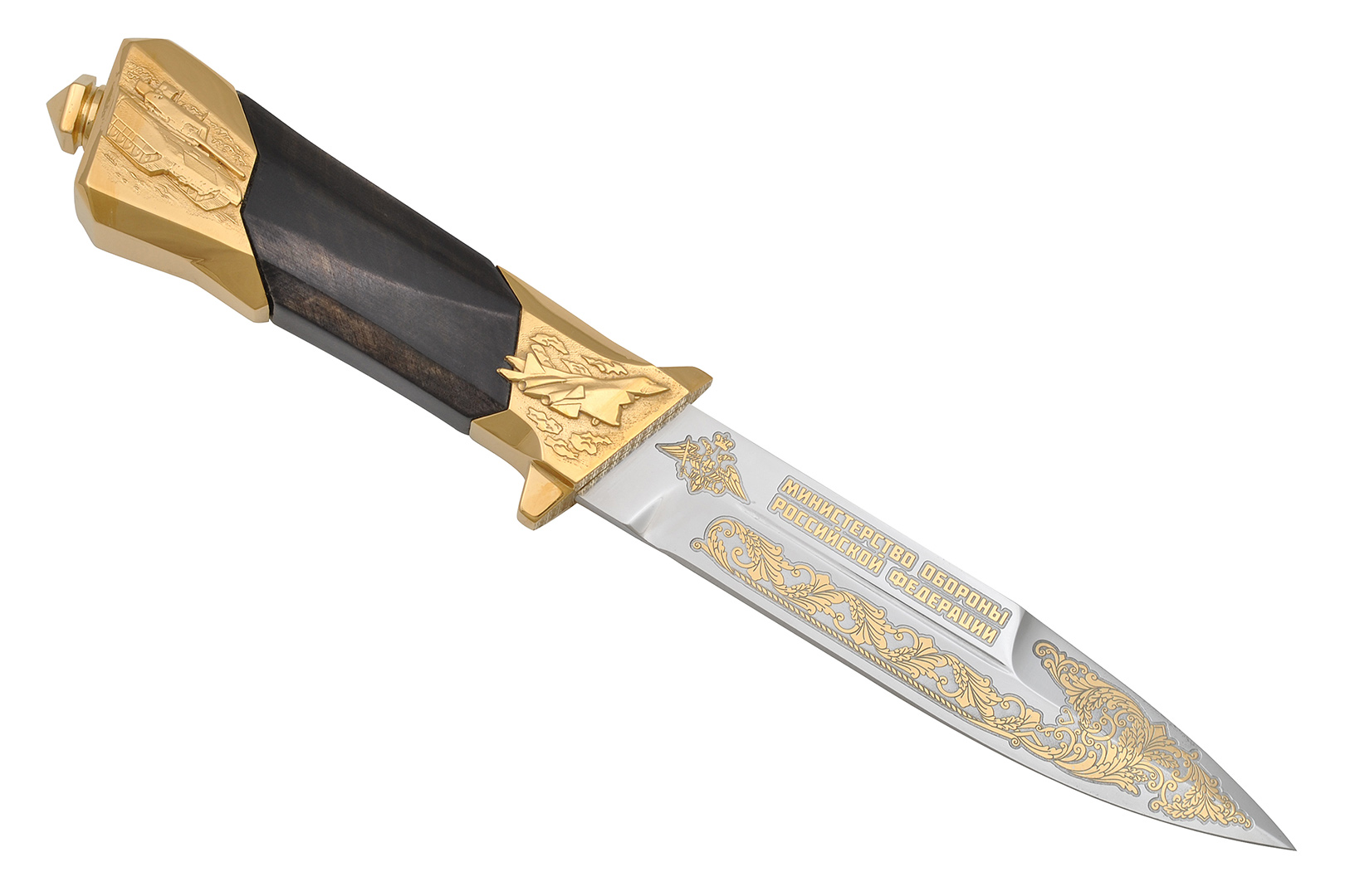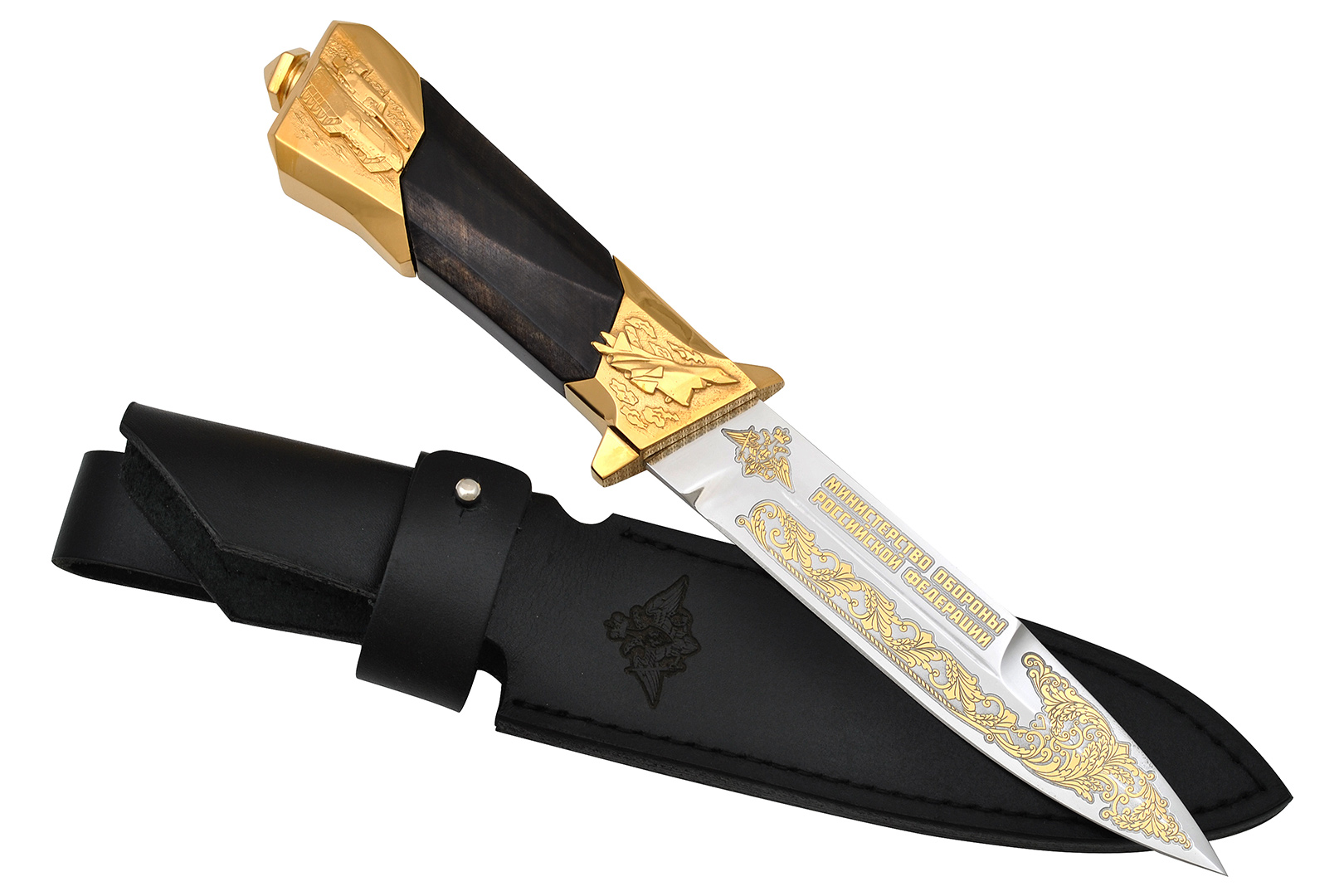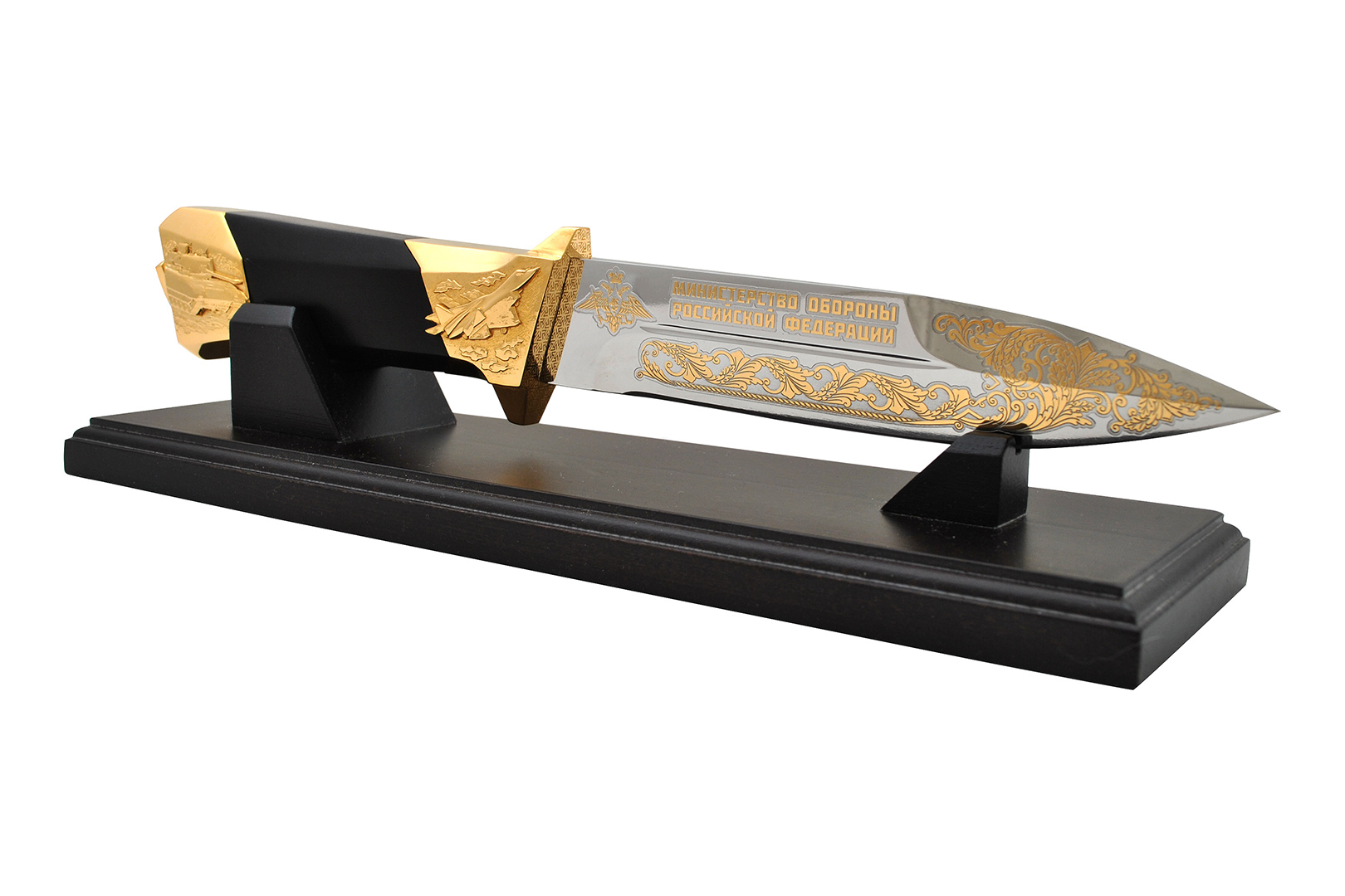 Клинок имеет симметричное сужение и высокие спуски, от середины обуха начинается фальшлезвие. Клинок сплошной, проходит через всю рукоять. Благодаря особой форме клинка, нож отлично приспособлен для совершения колющих и режущих движений. Украшение клинка выполнено вручную в традиционном стиле Златоустовских мастеров-оружейников методом травления и золочения. На лицевой стороне клинка размещена гравировка с изображением герба МО РФ и надписью: «Министерство обороны Российской федерации», оборотная сторона клинка украшена растительным орнаментом.