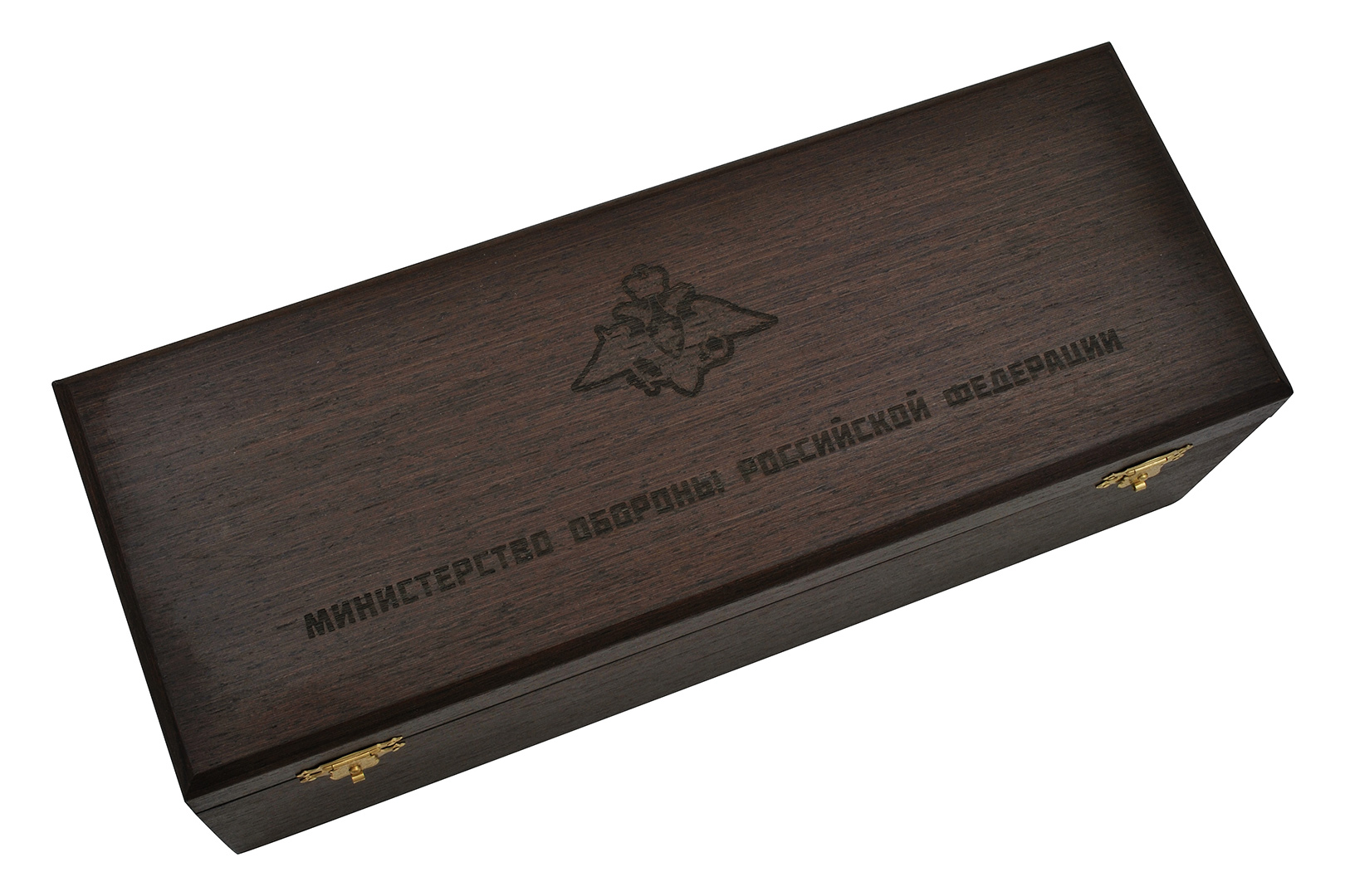 Каждый нож «Виват, Россия!» упаковывается в подарочную коробку (двухэтажную), изготовленную из натурального дерева с изображением герба МО РФ на крышке и отделанную изнутри бархатом.