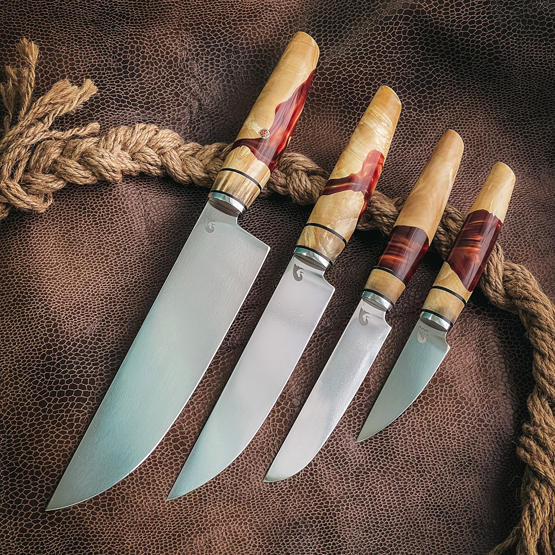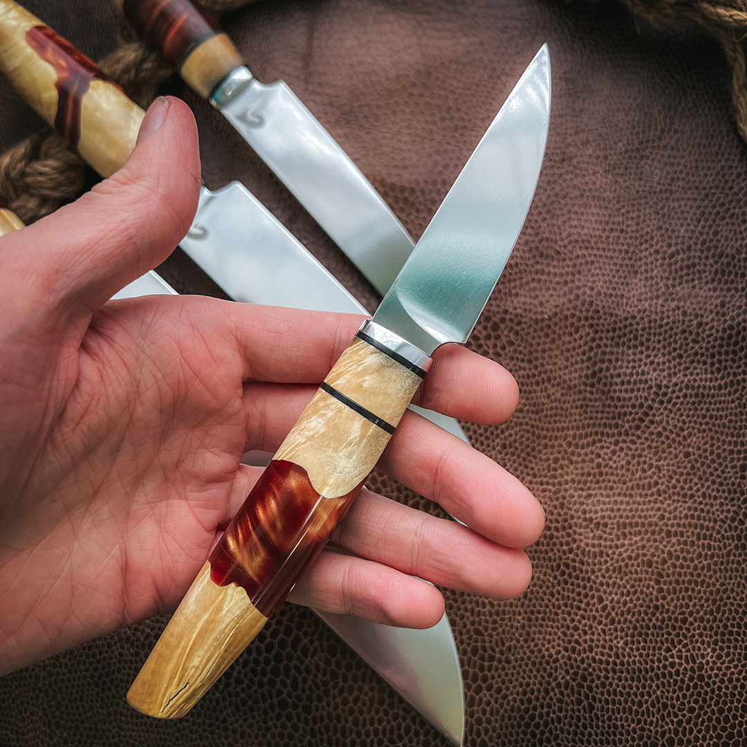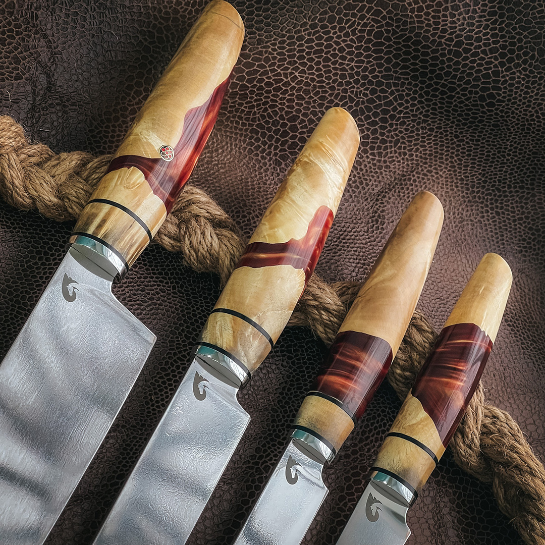 Рукояти выполнены из стабилизированного капа клена, протоки из полимера.