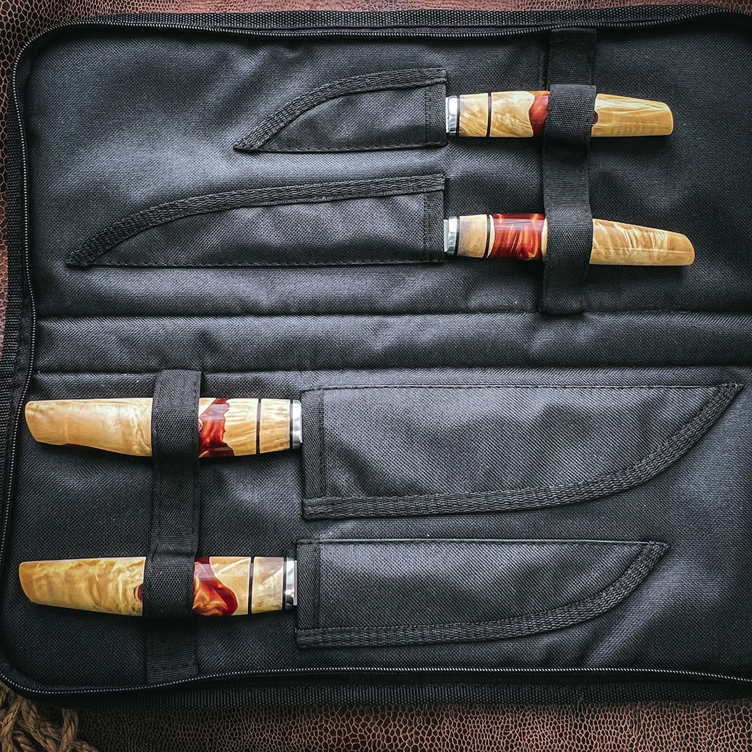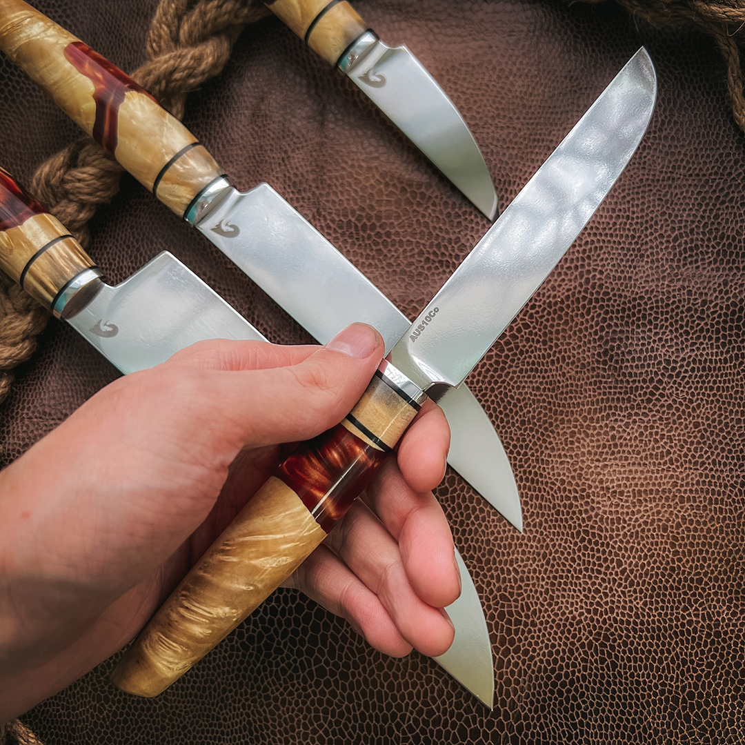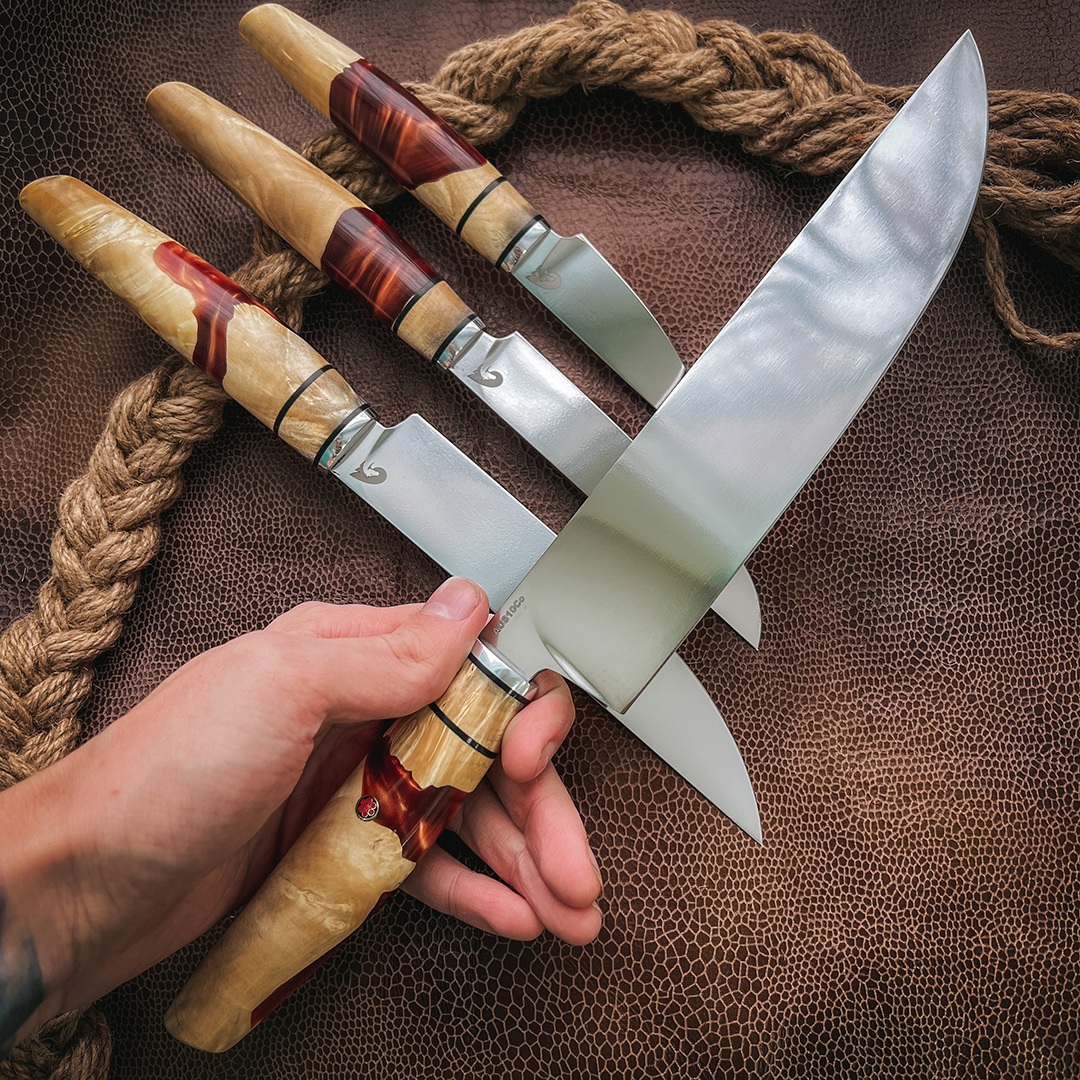 Рукояти выполнены из стабилизированного капа клена, протоки из полимера.