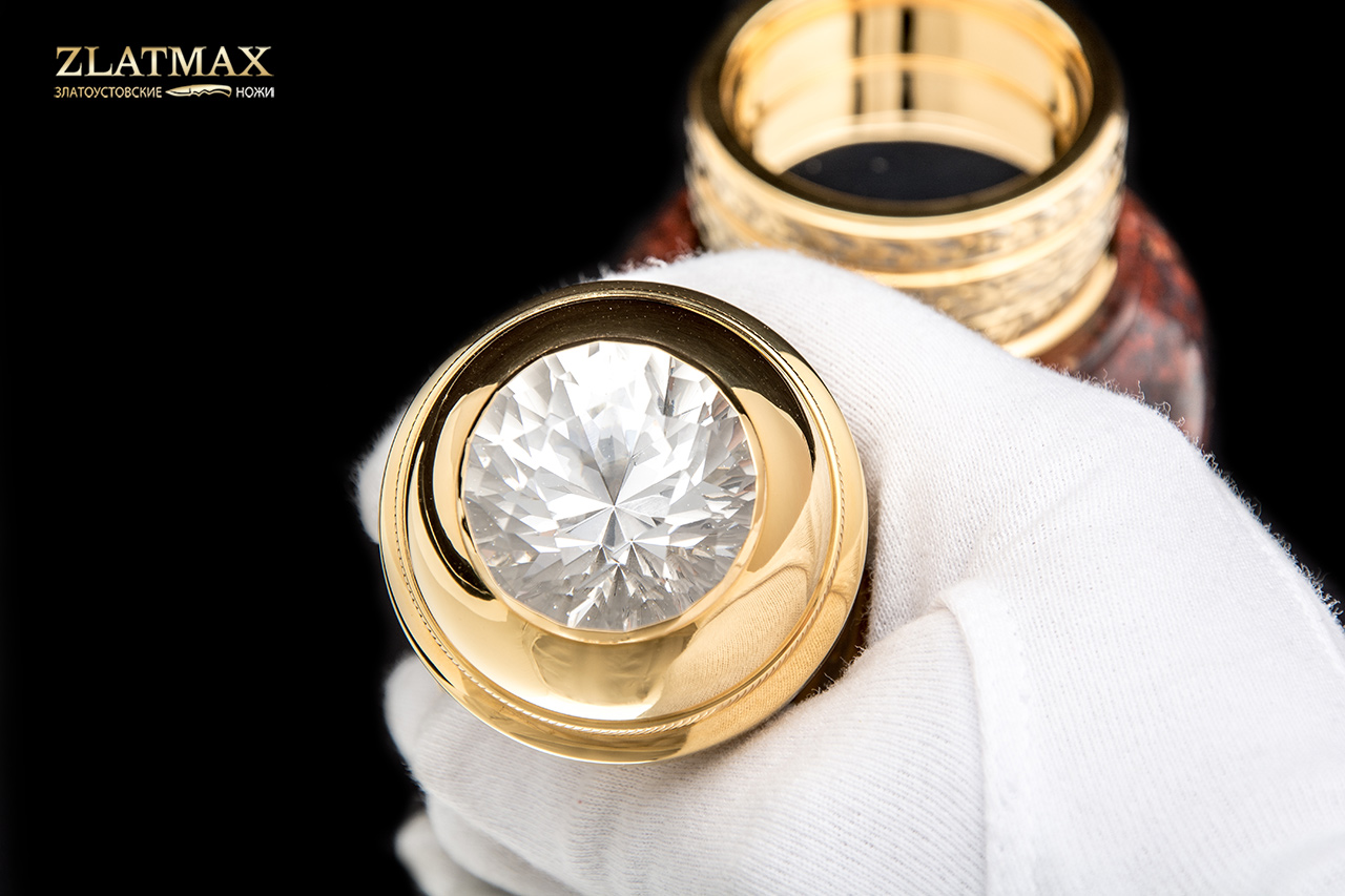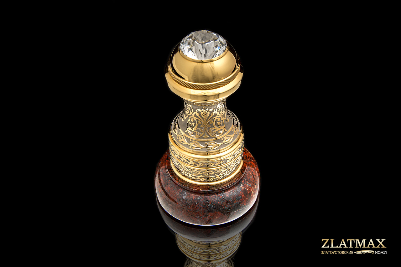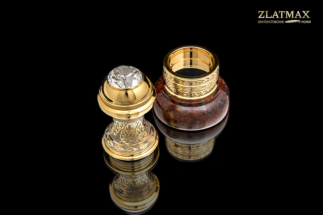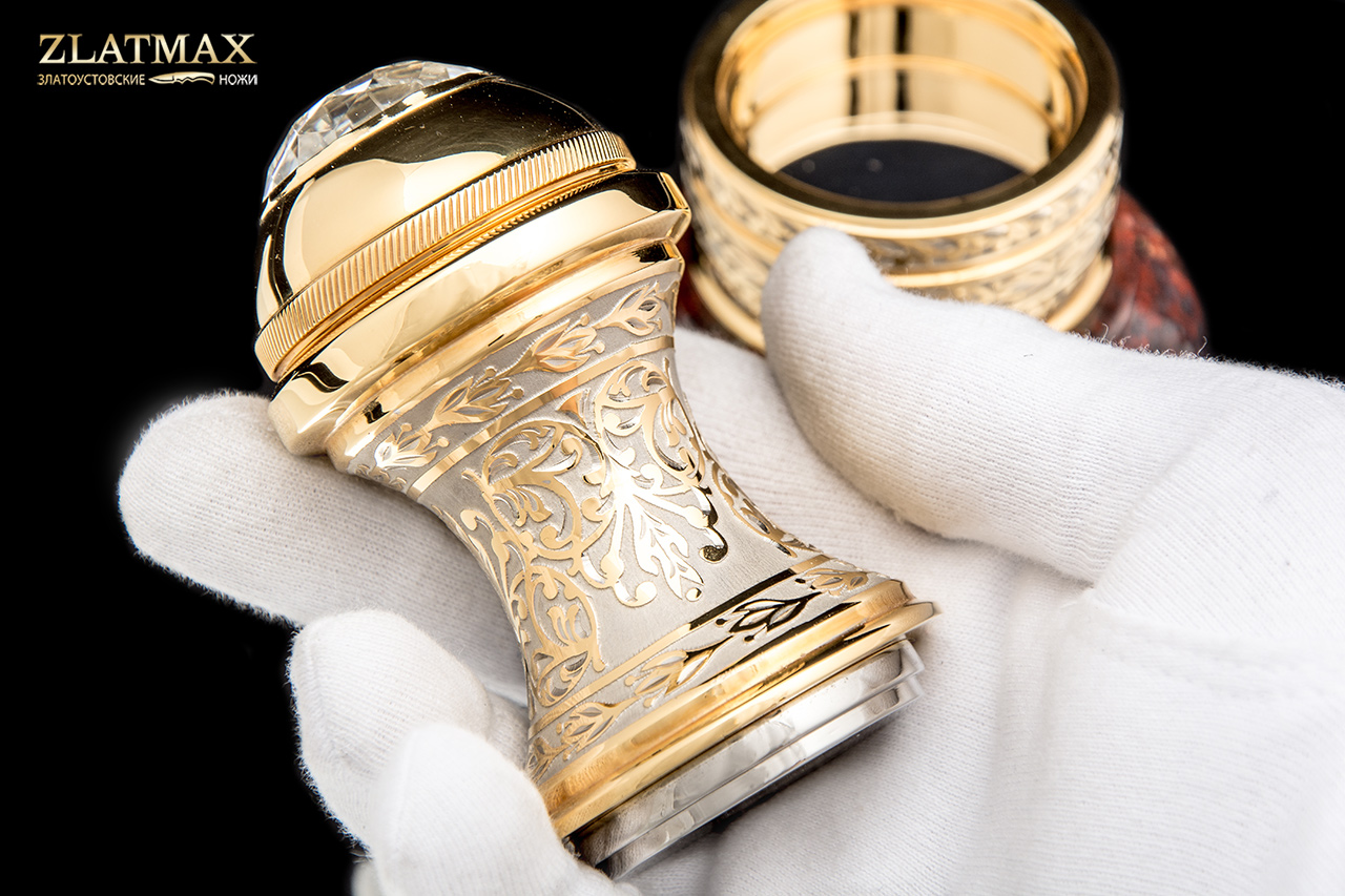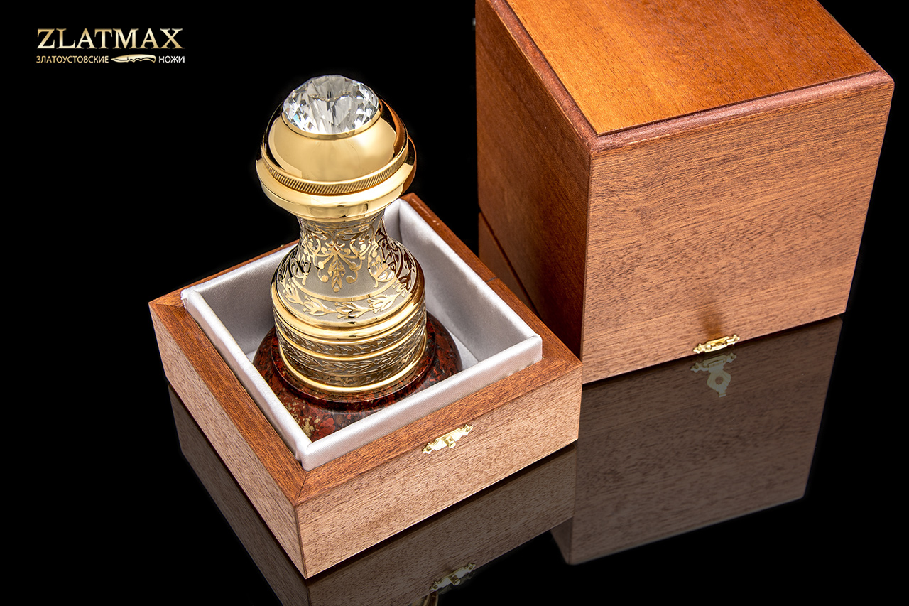Оснастка под печать большого размера подойдет для делового и представительного человека. Оснастка в гладкой форме идеально ложится в руку, невероятно переливается блеском от позолоты и тщательно отполированной поверхности. Венчает изделие крупный многогранный фианит. В основании изделия - натуральная яшма в глубоком коричневом цвете. Оснастка упакована в коробку из натурального дерева. Получить такой презент будет особенно приятно, ведь все в этом изделие продумано до мелочей и воплощено с невероятным талантом.
