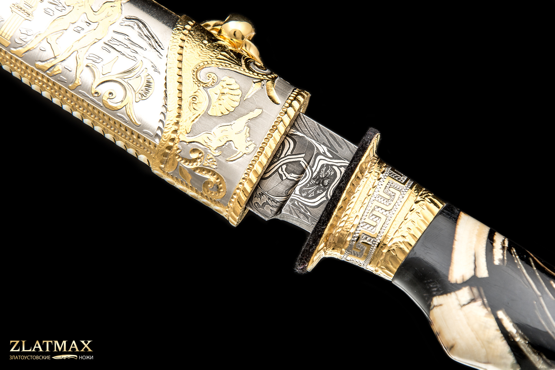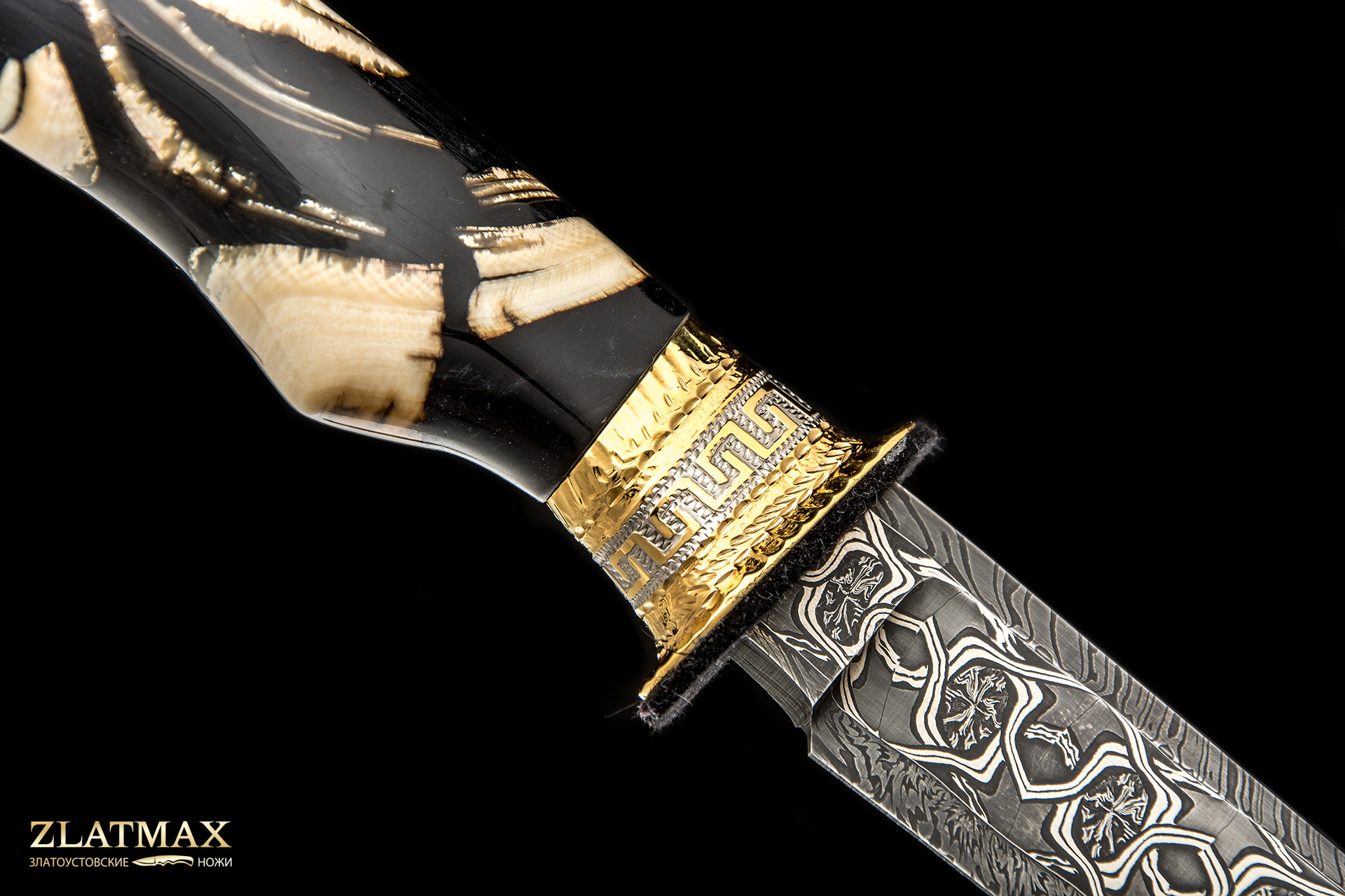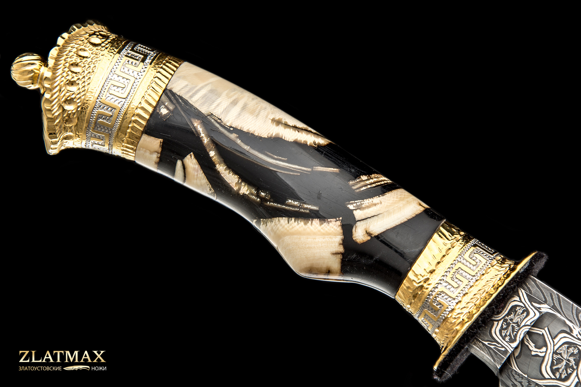 Сложный и очень интересный проект: мозаичный дамаск, бивень мамонта, ручная рисовка и множество орнаментальных элементов.