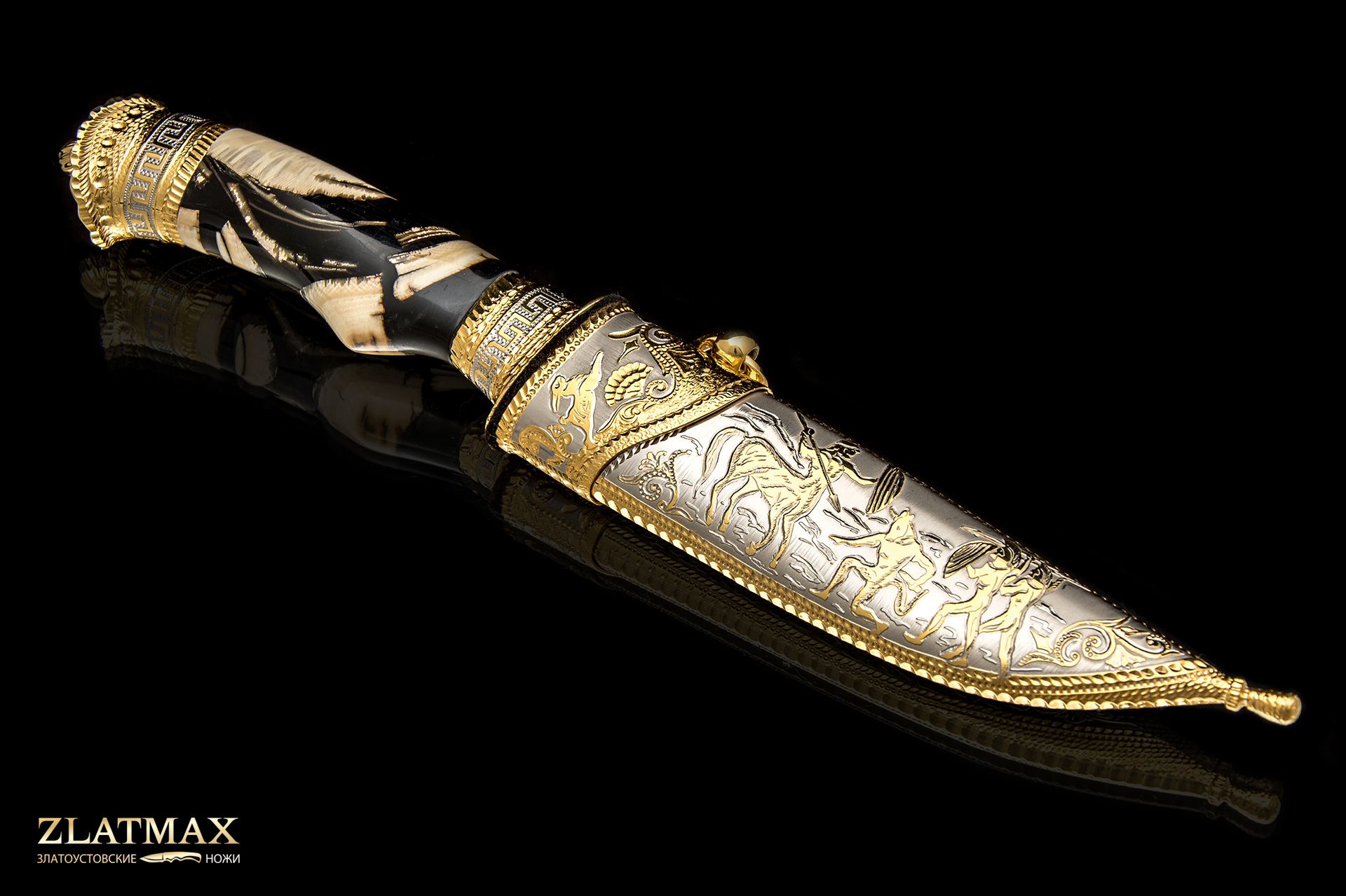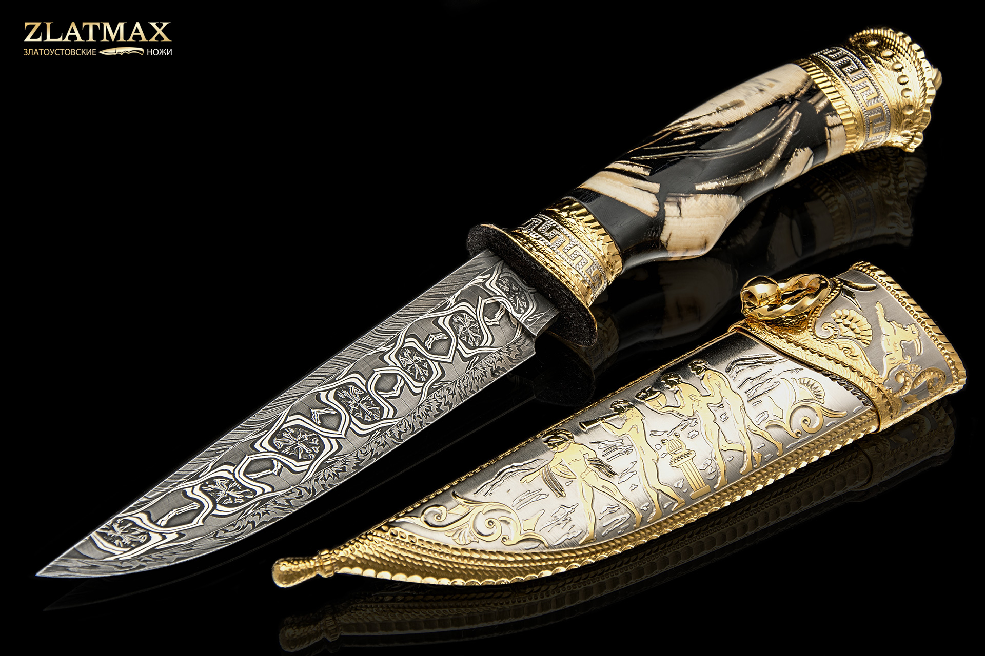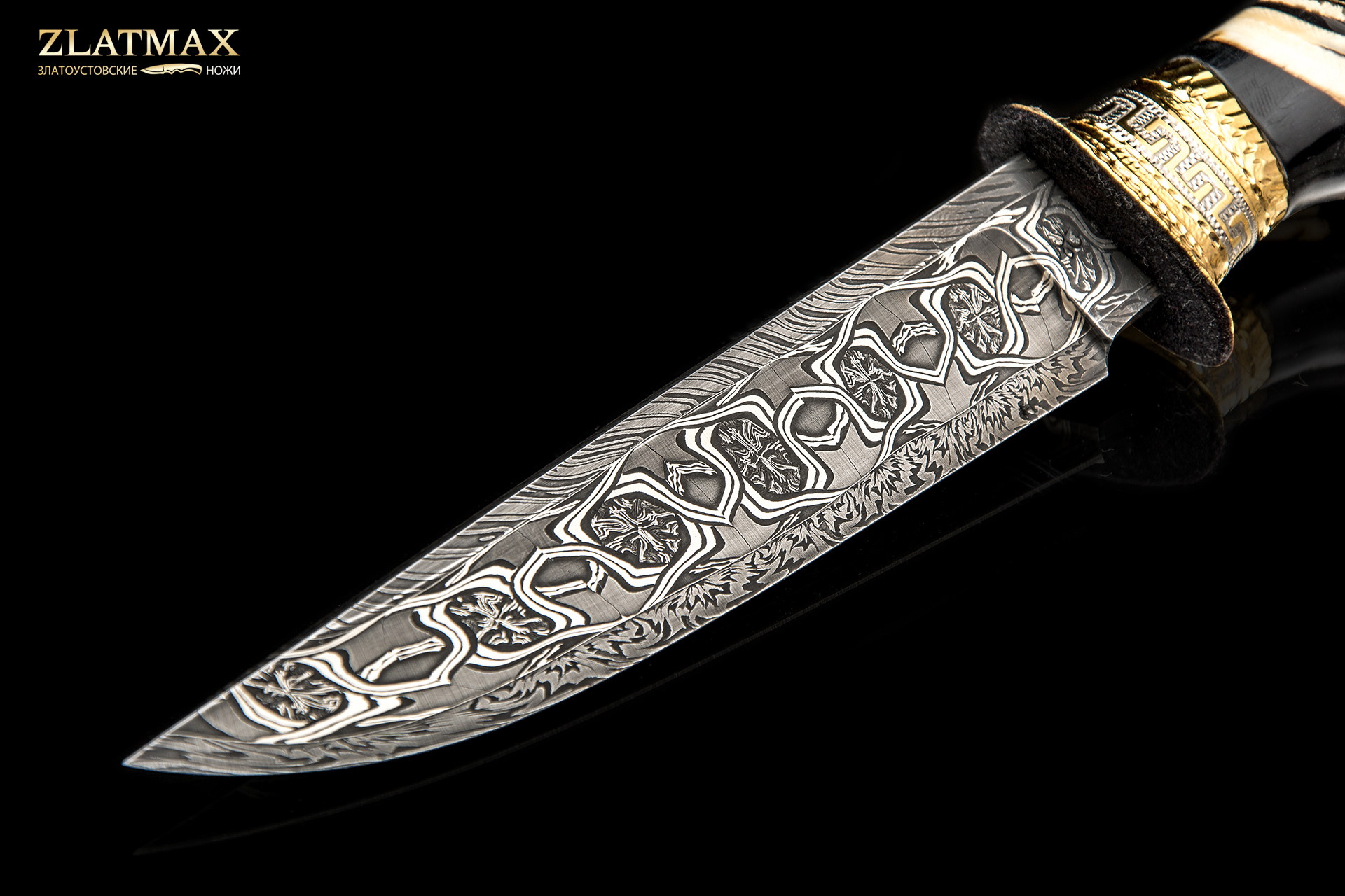 Сложный и очень интересный проект: мозаичный дамаск, бивень мамонта, ручная рисовка и множество орнаментальных элементов.