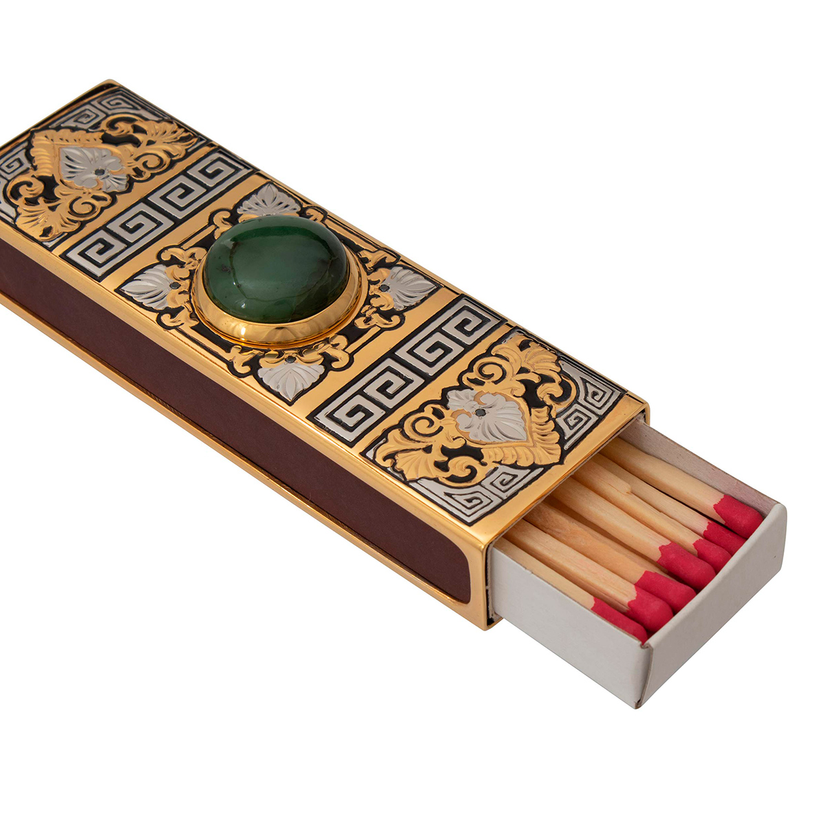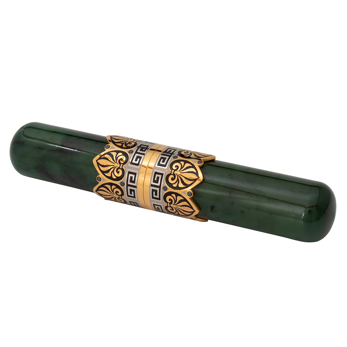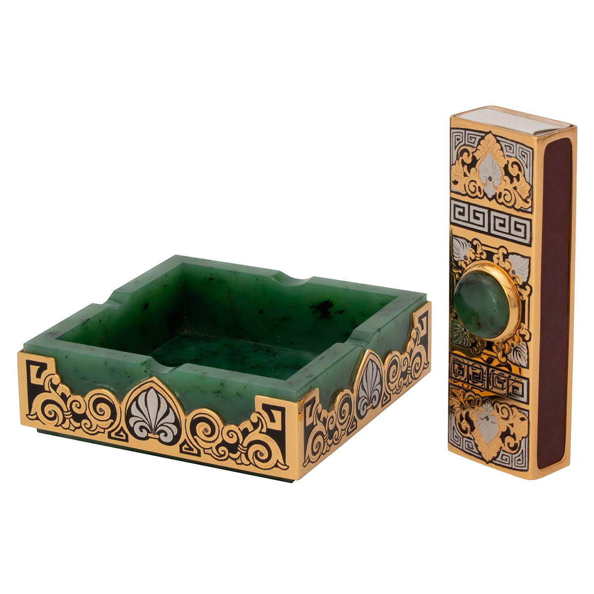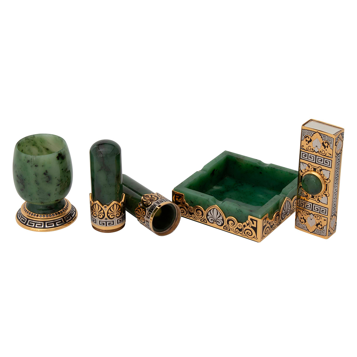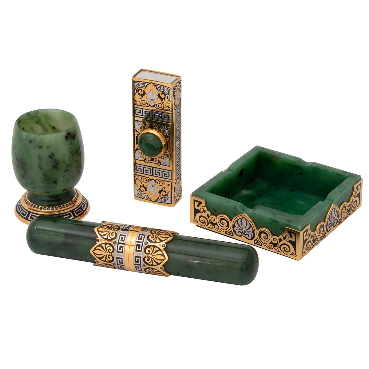 Этот художественный набор ручной работы имеет стильный дизайн сделанный из натуральных и экологических материалов. Каждый предмет выполнен из нефрита, украшен стилизованным орнаментом, покрытым золотом с нанесением чернения и инкрустирован драгоценными камнями. Такой набор обязательно будет пользоваться спросом на званых ужинах и светских приемов. Он подчеркнет высокий статус и утонченный вкус владельца, для которого процесс курения - это настоящий ритуал. Данный набор идеально впишется в любой интерьер. Выбирая его в подарок, будьте уверены: продуманная функциональность не оставит равнодушным ни одного мужчину!