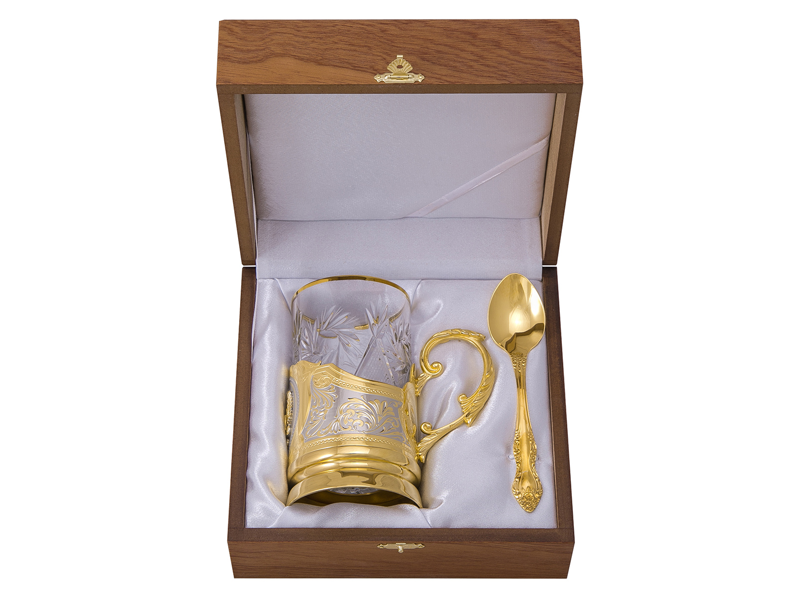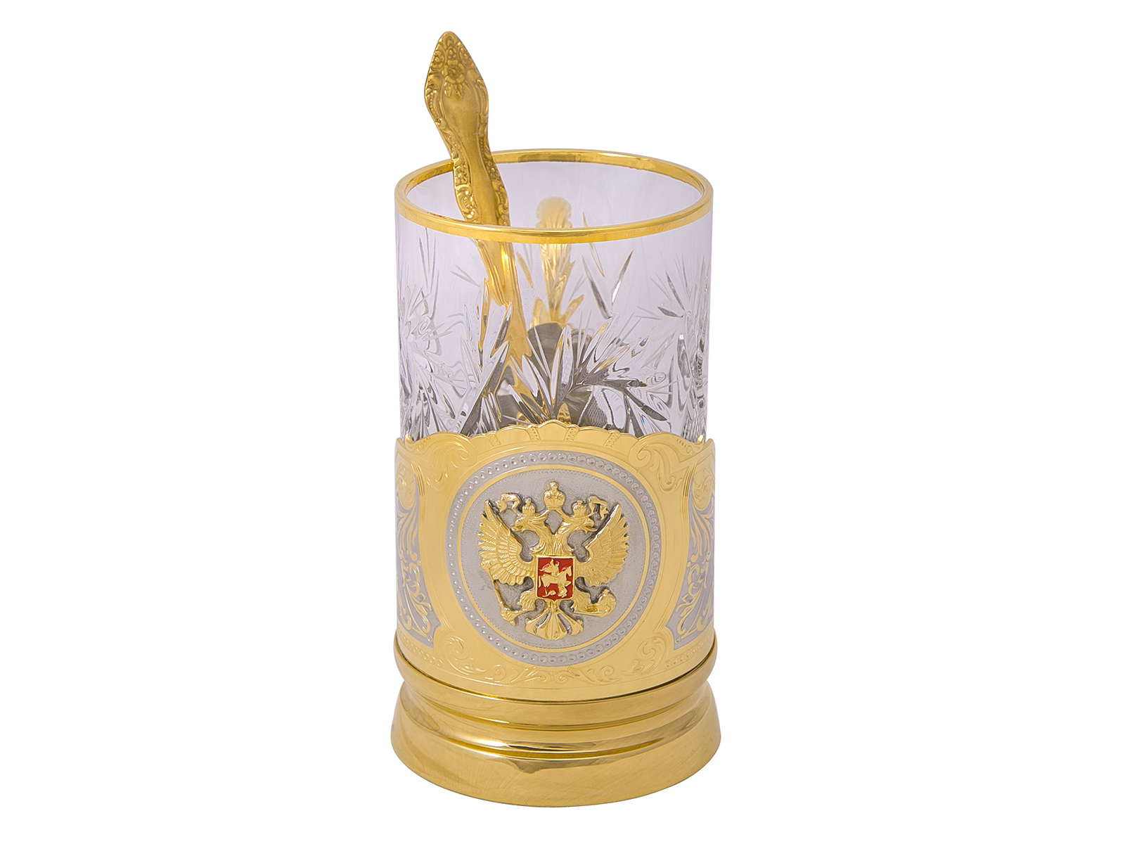 Уникальный подстаканник из латуни, украшенный объемным гербом России станет эксклюзивным подарком для руководителя, партнера по бизнесу и ценителя уникальной столовой посуды. Подстаканник имеет золотое покрытие и гравировку в виде сложного узора, выполненную по дизайнерскому эскизу. В набор также входит красивый хрустальный стакан с золотым «ободком».