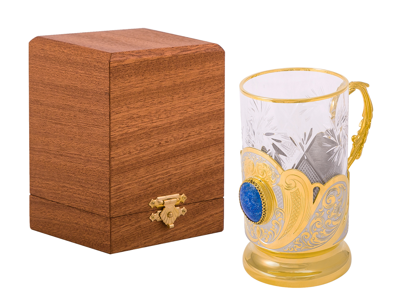 Хотите удивить хозяйку дома или выразить уважение руководителю? Купите эксклюзивный подстаканник из латуни. Уникальное изделие ручной работы имеет золотое покрытие, украшено авторской гравировкой и сложным рисунком. Внимание одариваемого будет приковано к лазуриту, красующемуся в самом центре. Подстаканник с хрустальным стаканом упакован в оригинальную коробку с замком.