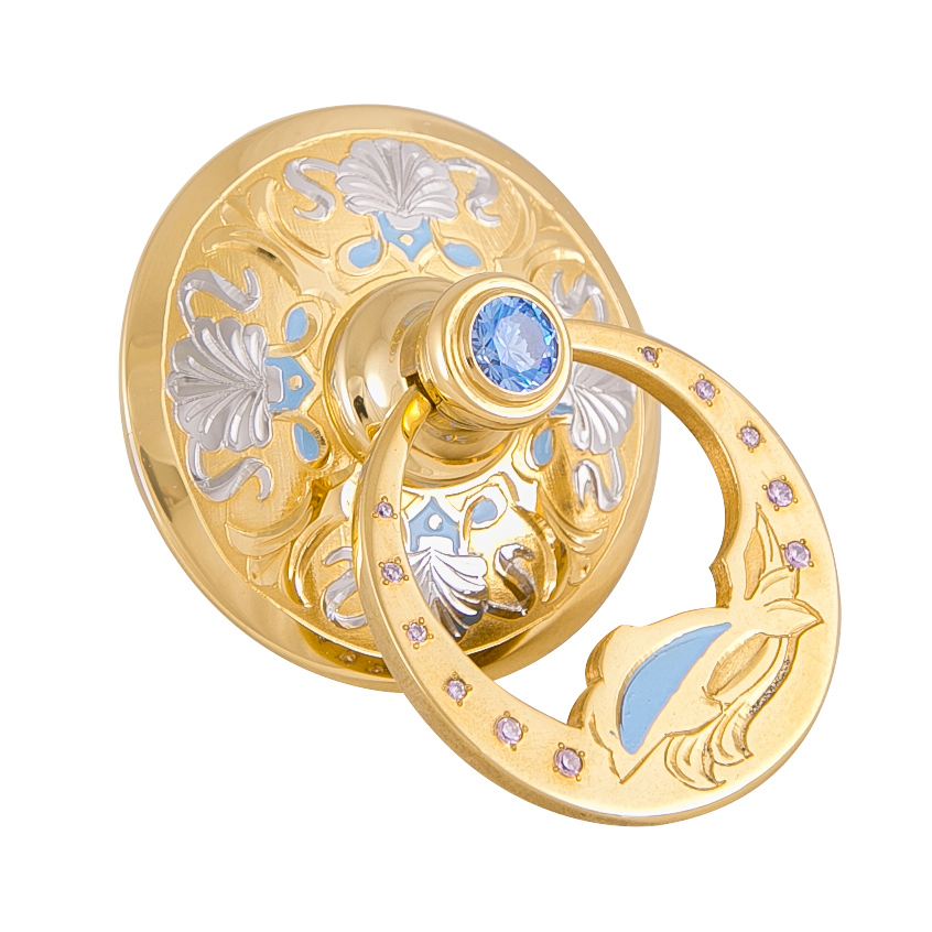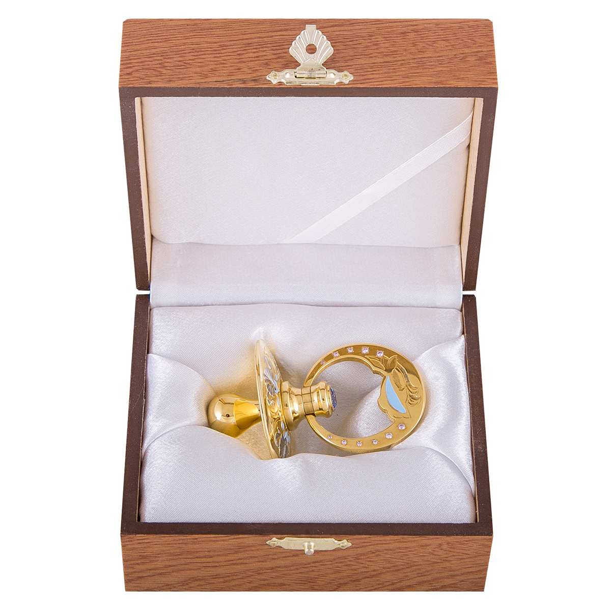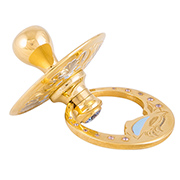 Необыкновенный подарок на рождение малыша. Покрытая золотом и украшенная фианитами пустышка – элитный сувенир на долгие года и память о таинстве рождения нового члена семьи. Это эксклюзивный подарок для мальчика, выполненный искусными мастерами вручную. Неповторимость работе придает причудливая рисовка на металле голубым цветом.