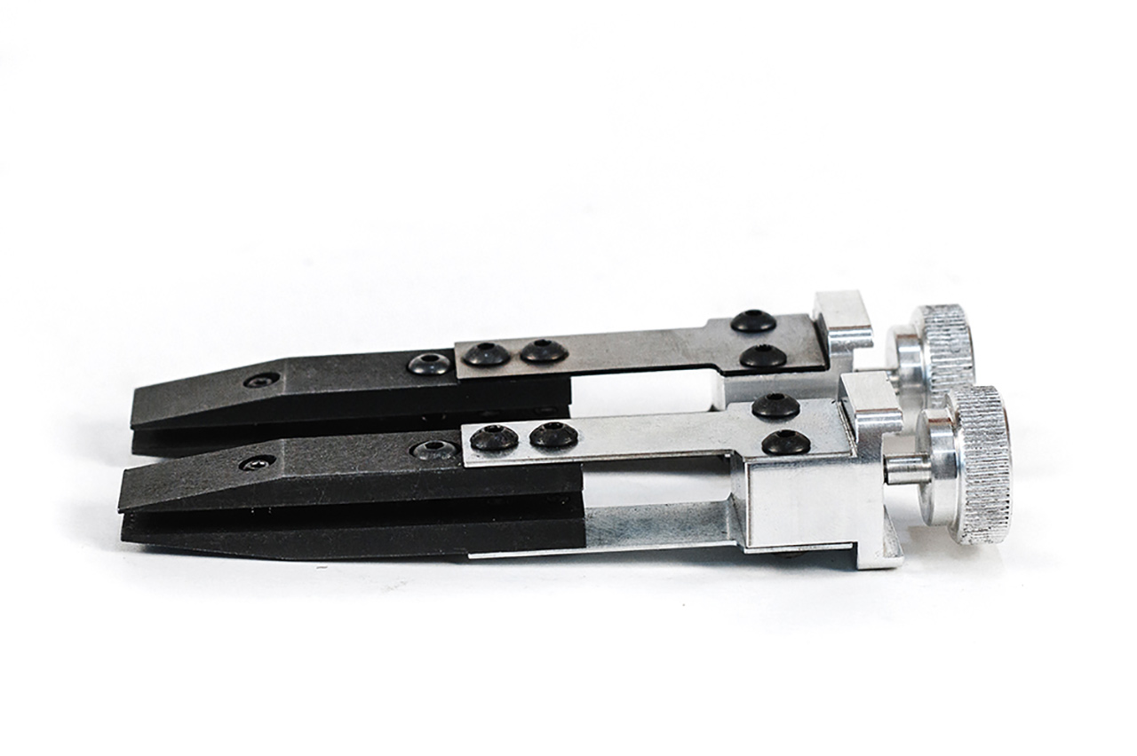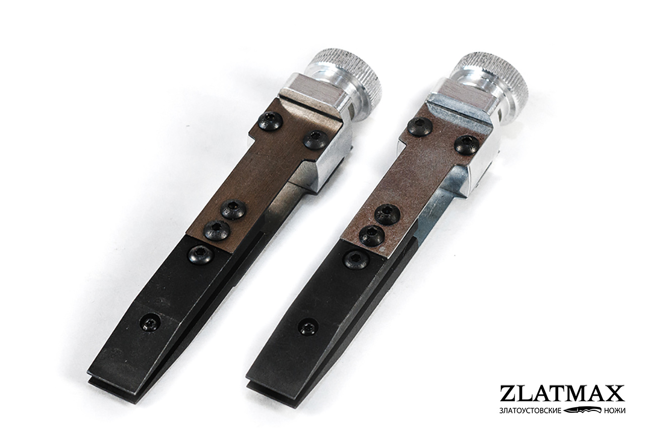 Специальный зажим с измененной конфигурацией губок и с применением специальных винтов имеет предельные минимальные углы заточки 6,5° на сторону. Благодаря двум точкам захвата, прогиб лезвия исключен. Есть возможность независимого перемещения зажимов, по всей длине рамки.