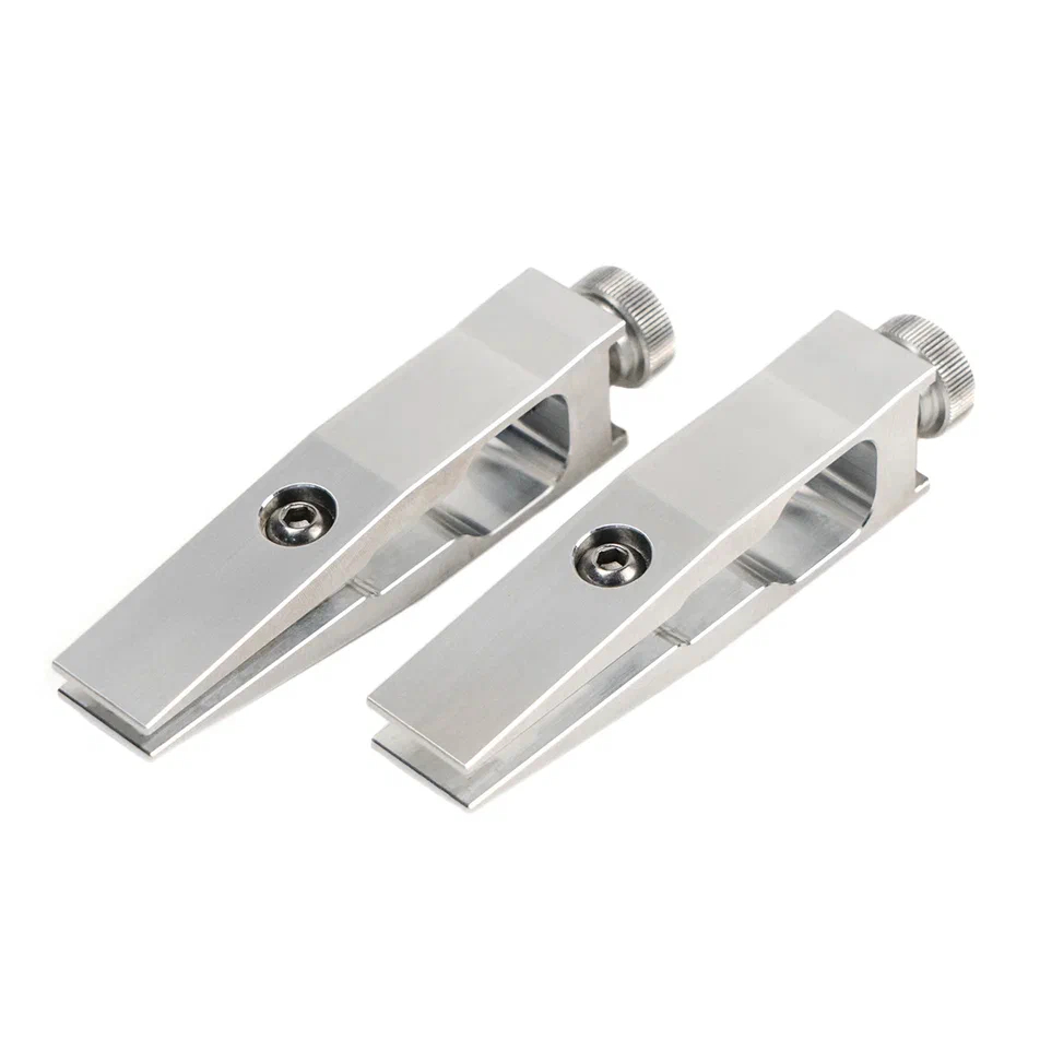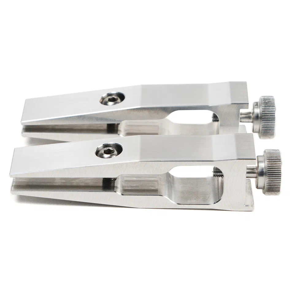 Цельнофрезерованные зажимы TSPROF Kadet надежно фиксируют ножи с толщиной обуха до 7 мм. Изготовленные из цельного бруска высокопрочного алюминиевого сплава. Зажатие происходит за счет стягивание губок зажима винтом M6x16 из нержавеющей стали. Зажимы не нуждаются в калибровке.