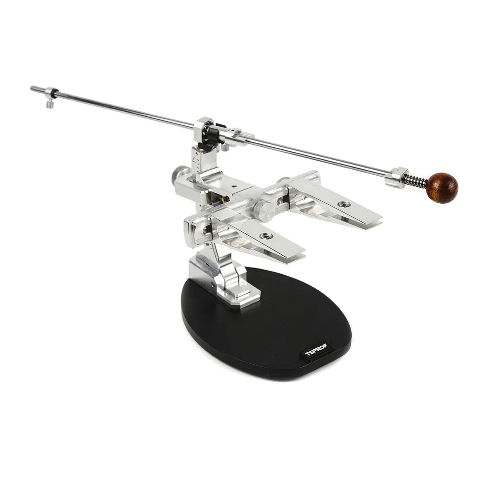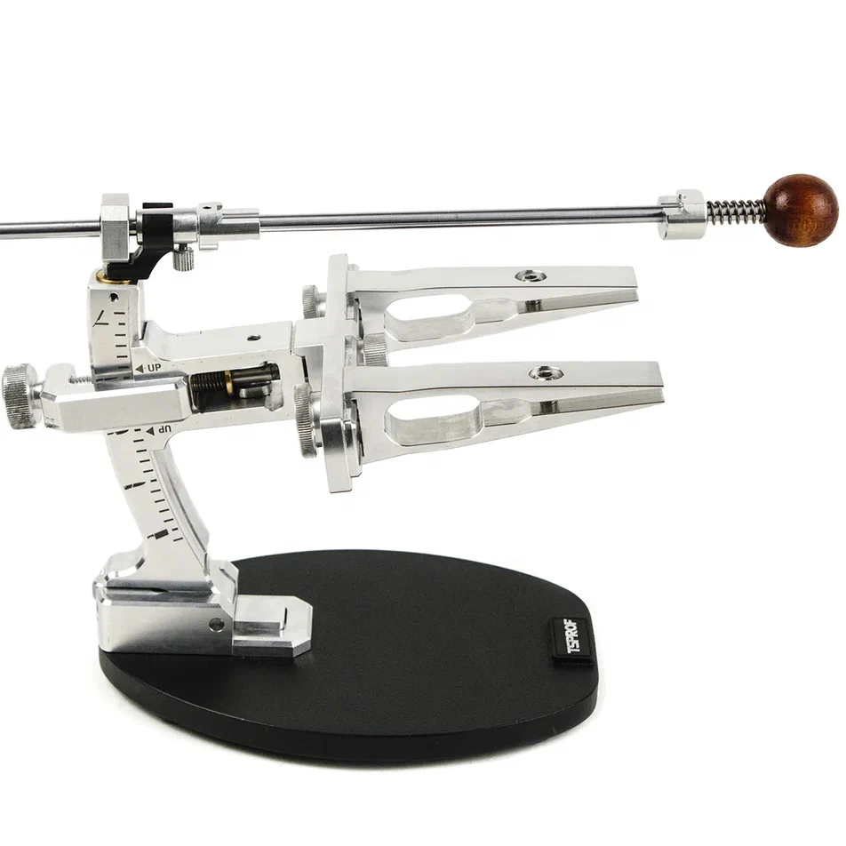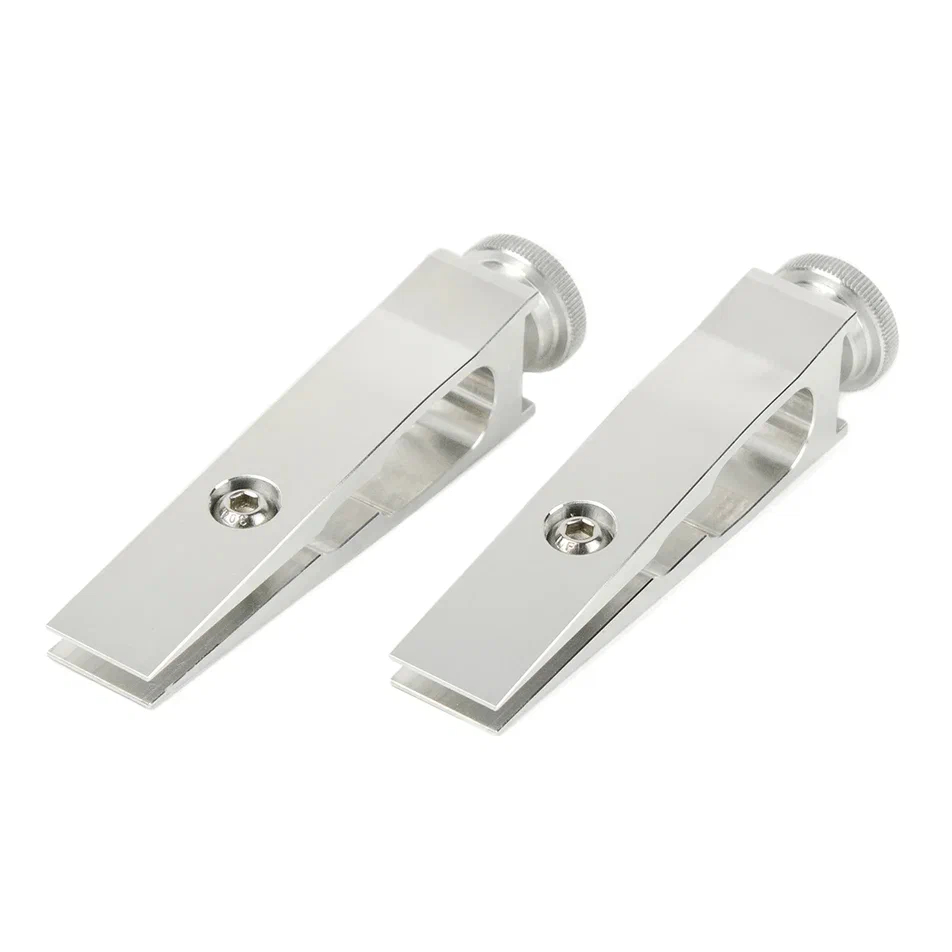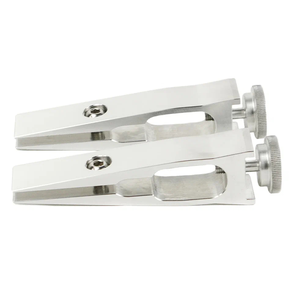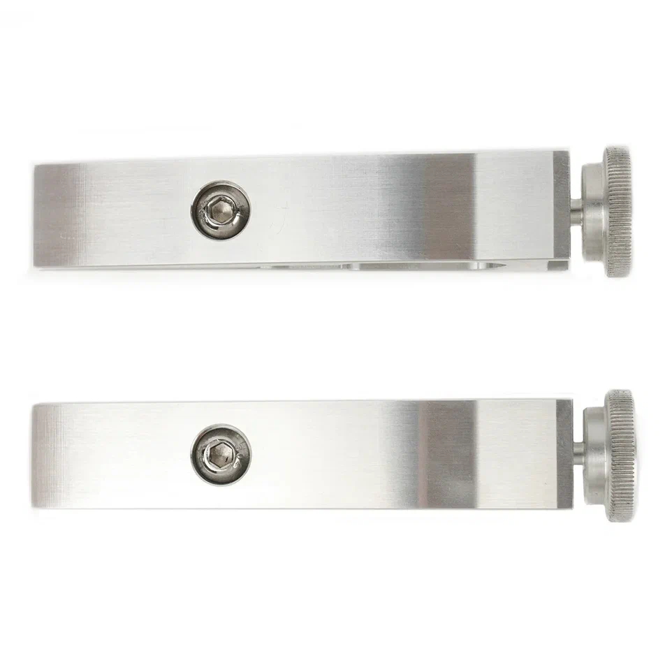 Зажимы изготовлены из цельного куска авиационного алюминия. Благодаря двум точкам захвата, прогиб лезвия исключен. Есть возможность независимого перемещения зажимов, по всей длине рамки. Отсутствует необходимость калибровки. С этими зажимами становится возможным заточка ножей со «скандинавскими спусками» по линии спусков. Подходят для кухонных и филейных ножей с узким обухом, ножей-брелков, опасных бритв, ножей со «сканди-спусками» и т.п.